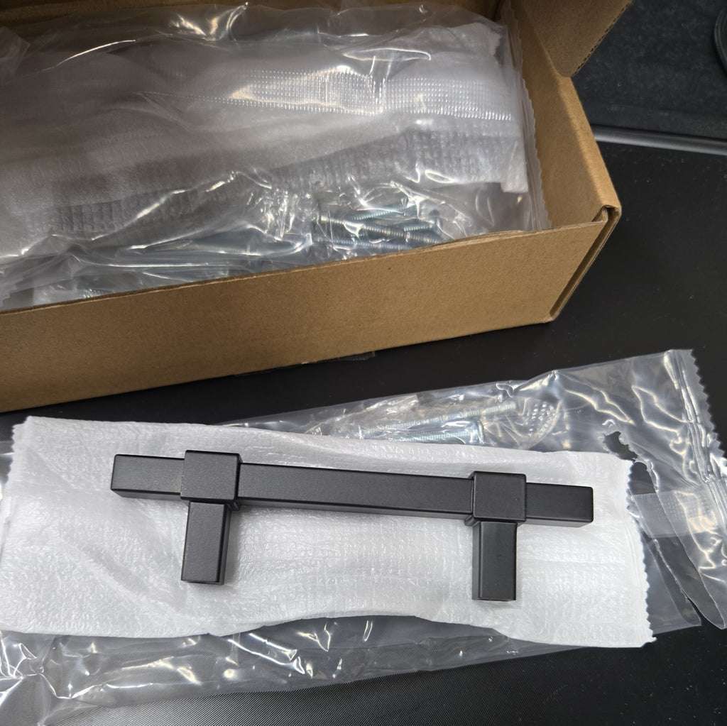 The product is a 12 pack of black cabinet handles from the brand goldenwarm. Each handle has a 5-inch hole center and a square tube shape with a square foot design. The package dimensions are 9.88x6.65x2.83 inches, and the weight is 2.58 pounds. These handles are suitable for cabinets, drawers, dressers, and other kitchen hardware needs.