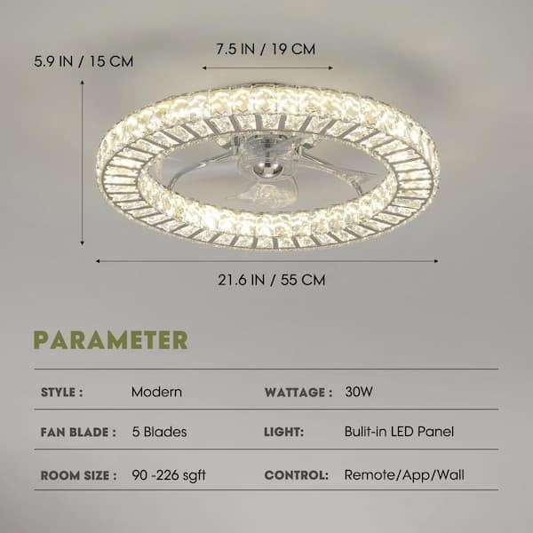 This 22" Smart Indoor Flush Mount Ceiling Fan with 4-Light Colors and a remote control included by PACIFIC CORE is a modern and stylish addition to any bedroom, living room, or dining room. The ceiling fan features warm white LED lights with a color temperature of 2500 - 3000 K, providing a cozy and inviting ambiance. With a corded power source and an indoor installation area, this ceiling fan offers both functionality and aesthetic appeal. Additionally, the remote control allows for convenient operation, making it easy to adjust the fan speed and lighting settings from anywhere in the room.