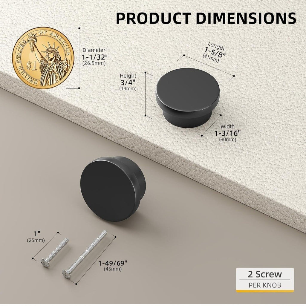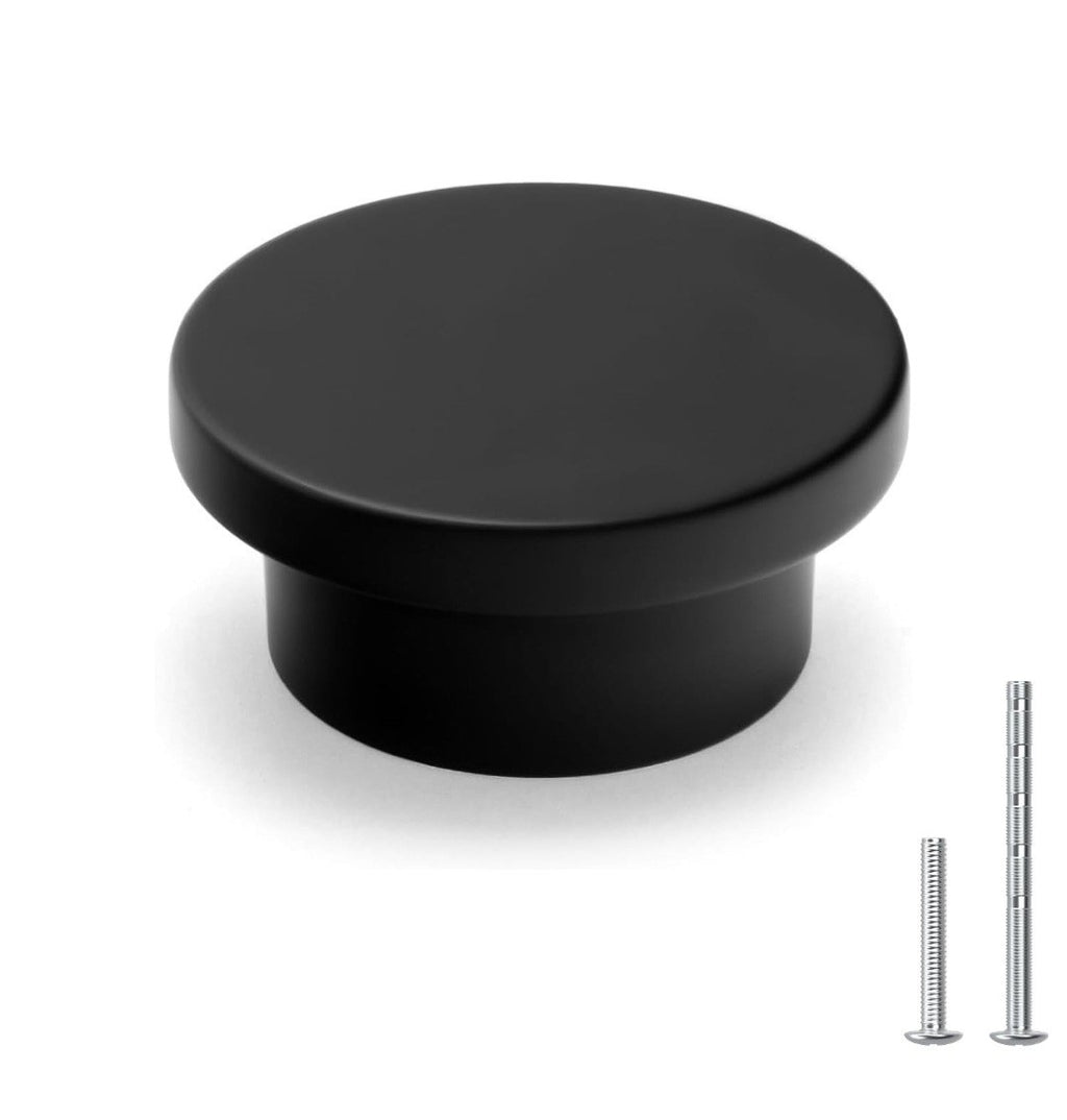 The product is a set of 6 black zinc alloy cabinet knobs and pulls designed for kitchen drawers. These modern round knobs are perfect for indoor use and come with screws for easy installation. Made from durable zinc material with a polished finish, these knobs add a sleek and stylish touch to any cabinet or drawer in your home. The package includes 6 pieces and weighs 1.03 pounds, making them a convenient and high-quality addition to your home improvement projects.
