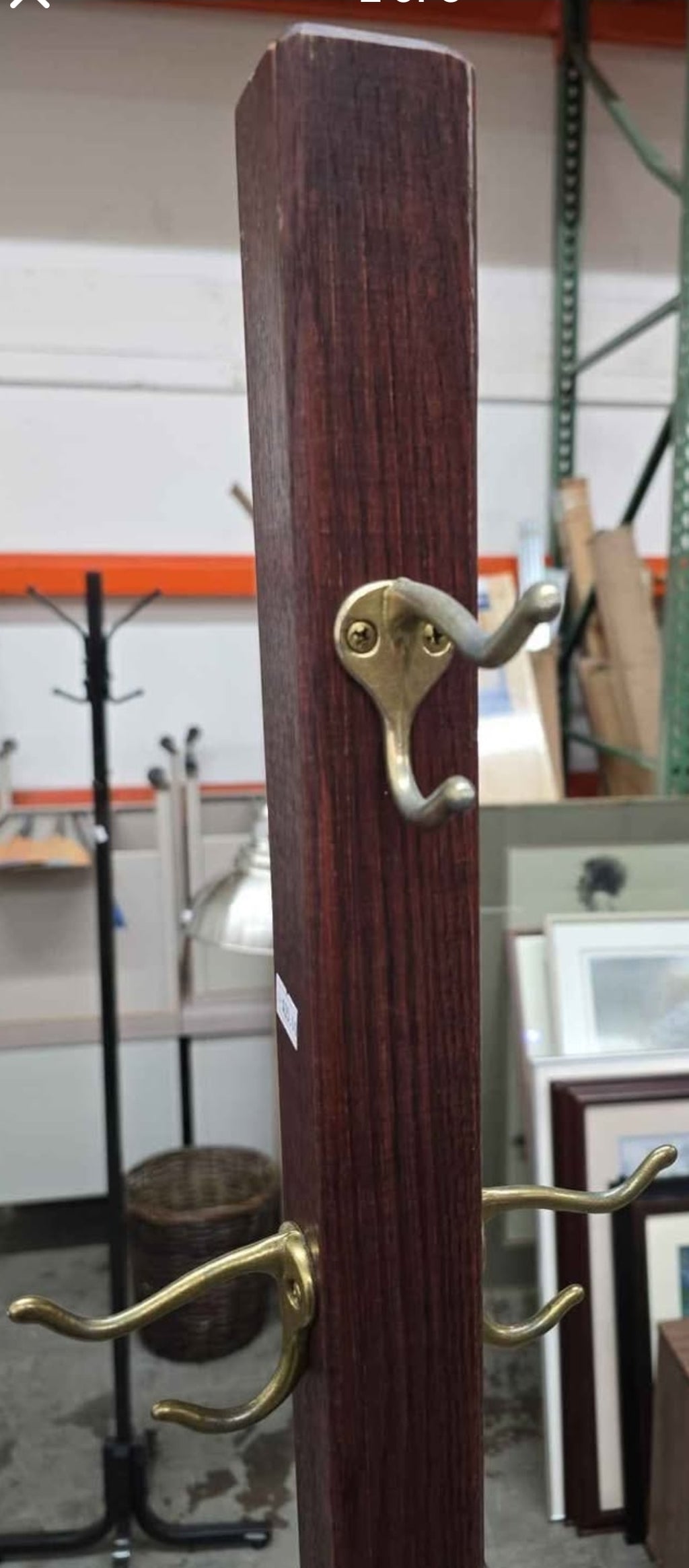 72" Wood Coat Tree/ Coat Rack Brass Colored Hooks