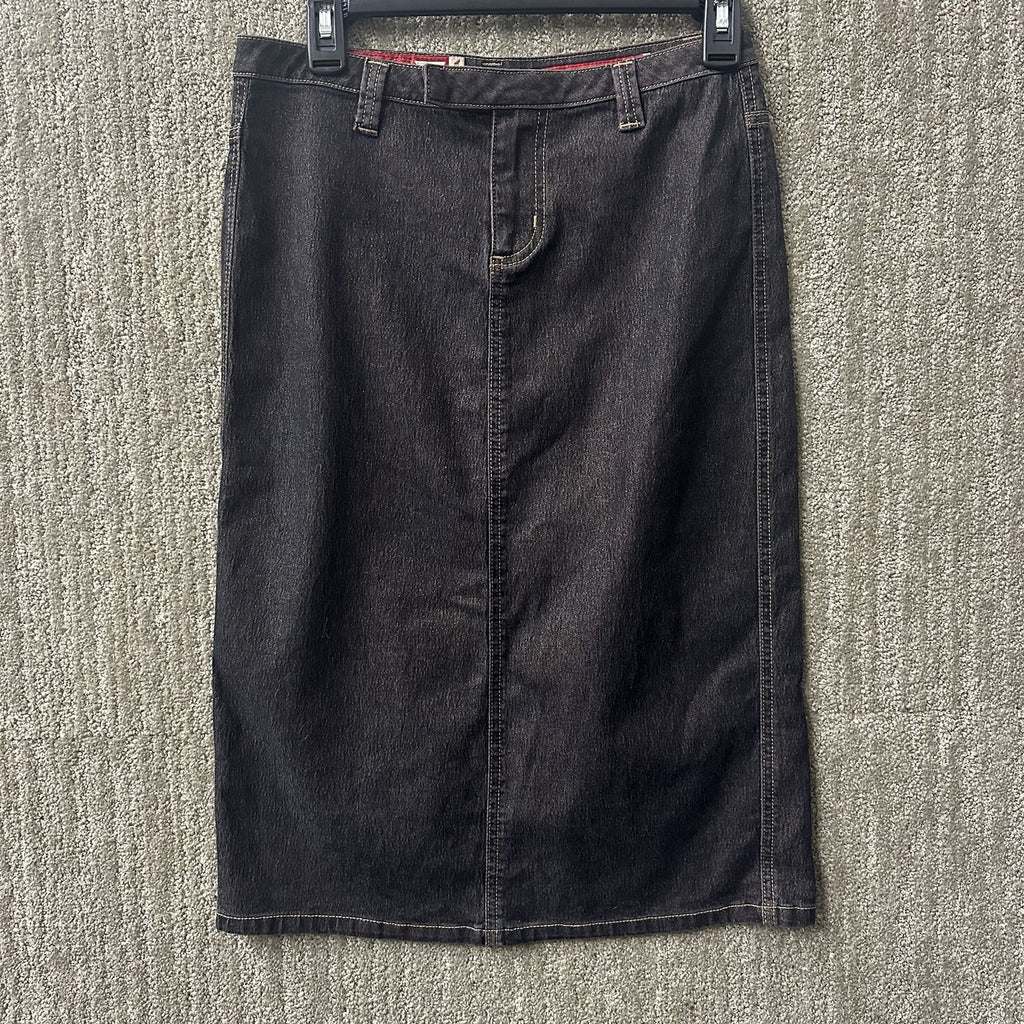 The product is a vintage Guess Y2K glimmer red label dark indigo jean skirt in size 27 (Fits 28). It features a knee-length straight and pencil style, perfect for women looking to add a touch of 90s flair to their wardrobe. The skirt's bold indigo red color adds a pop of color to any outfit, making it a versatile and stylish piece for any fashion-conscious individual.