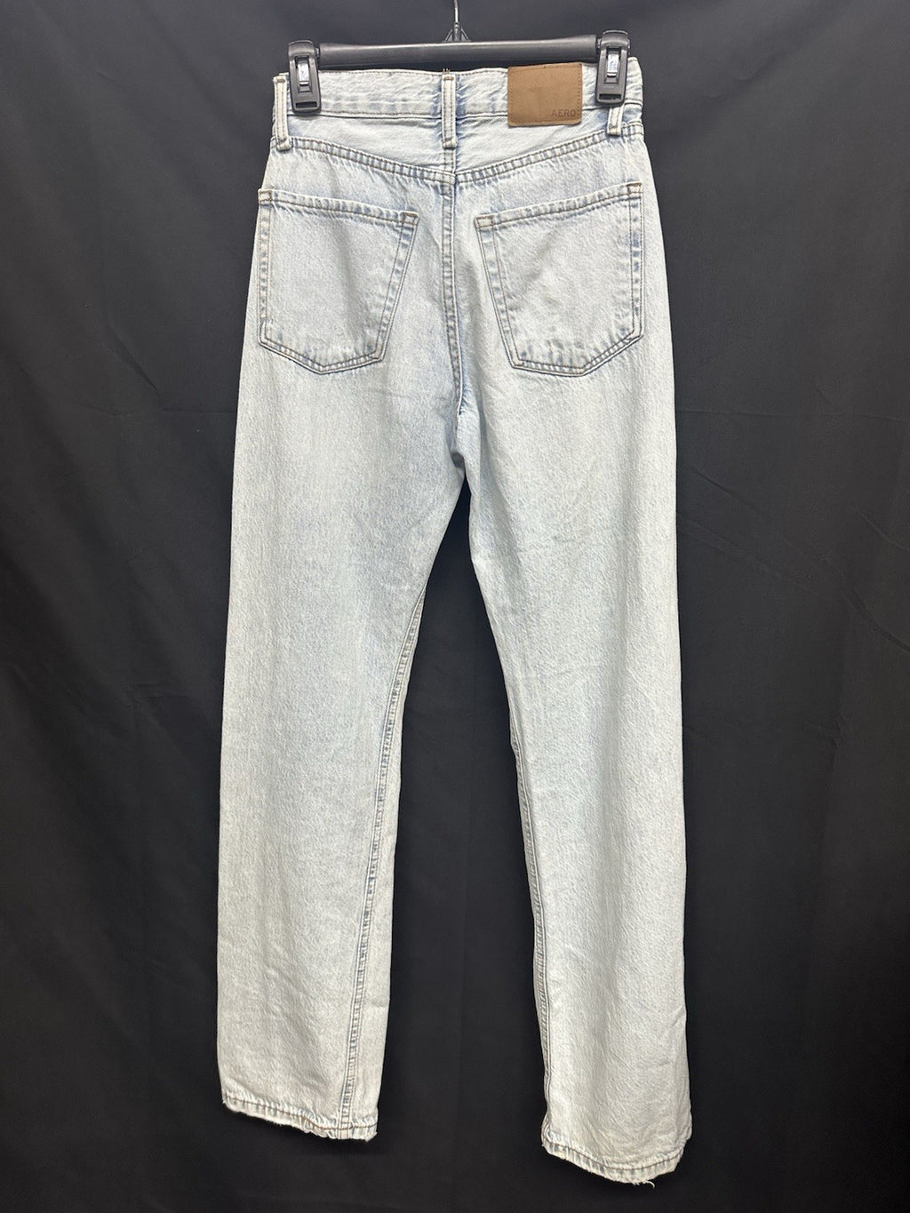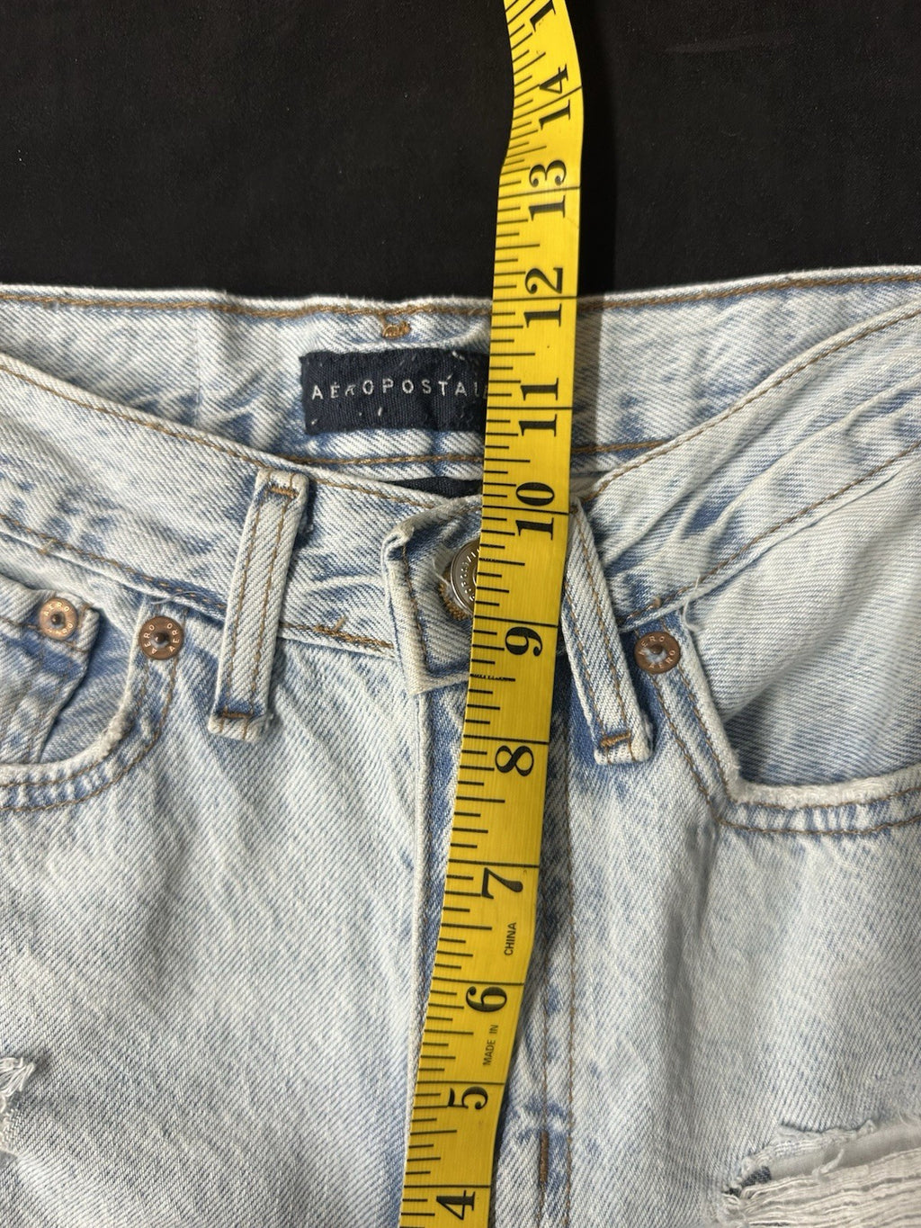 The Aeropostale 80s Baggy Jeans in size 00 feature a solid light wash with a mid-rise and straight leg fit. Made from 12% recycled cotton and 100% cotton denim, these jeans are machine washable and have a zip and button closure. The distressed look and pockets add a trendy touch to the hipster, punk, grunge, 80s, and 90s retro style. Perfect for all seasons, these jeans are a stylish addition to any woman's wardrobe.