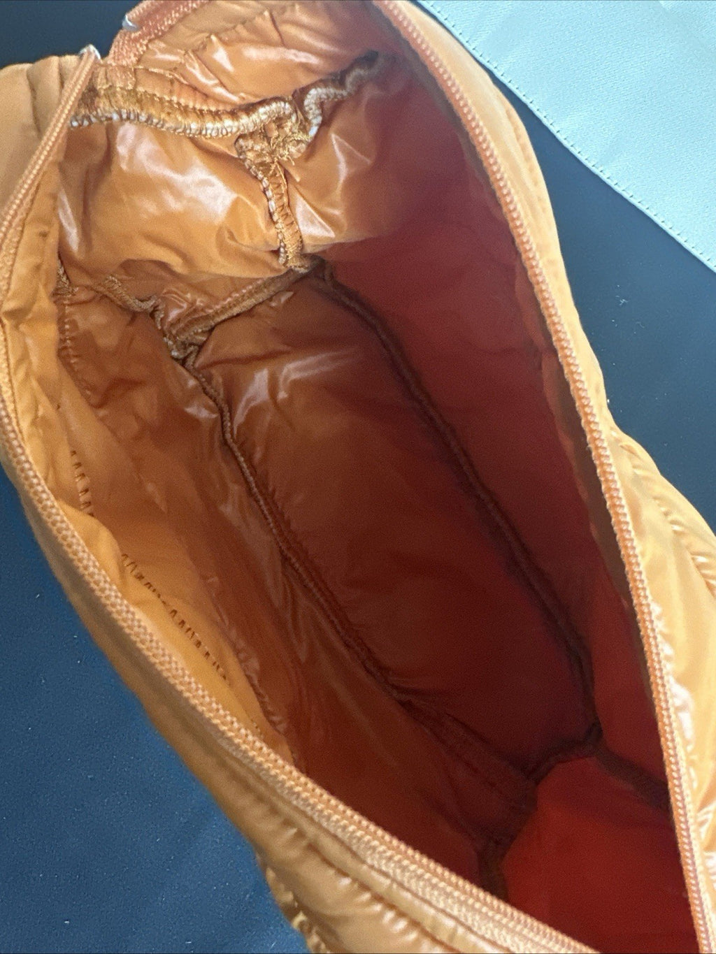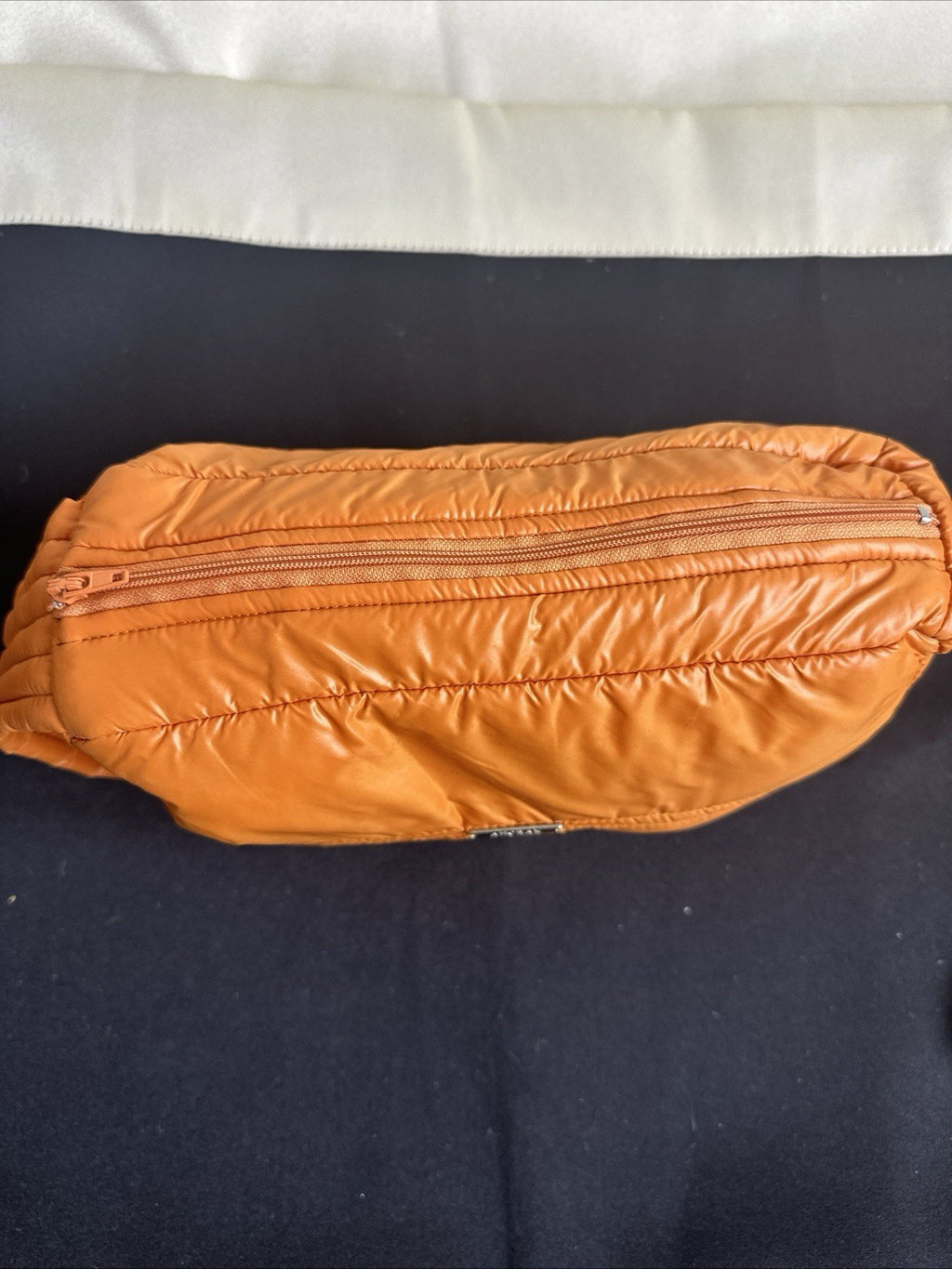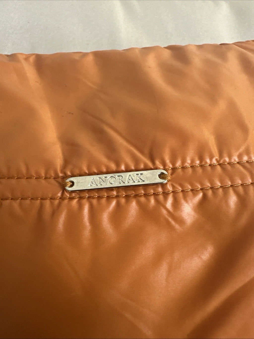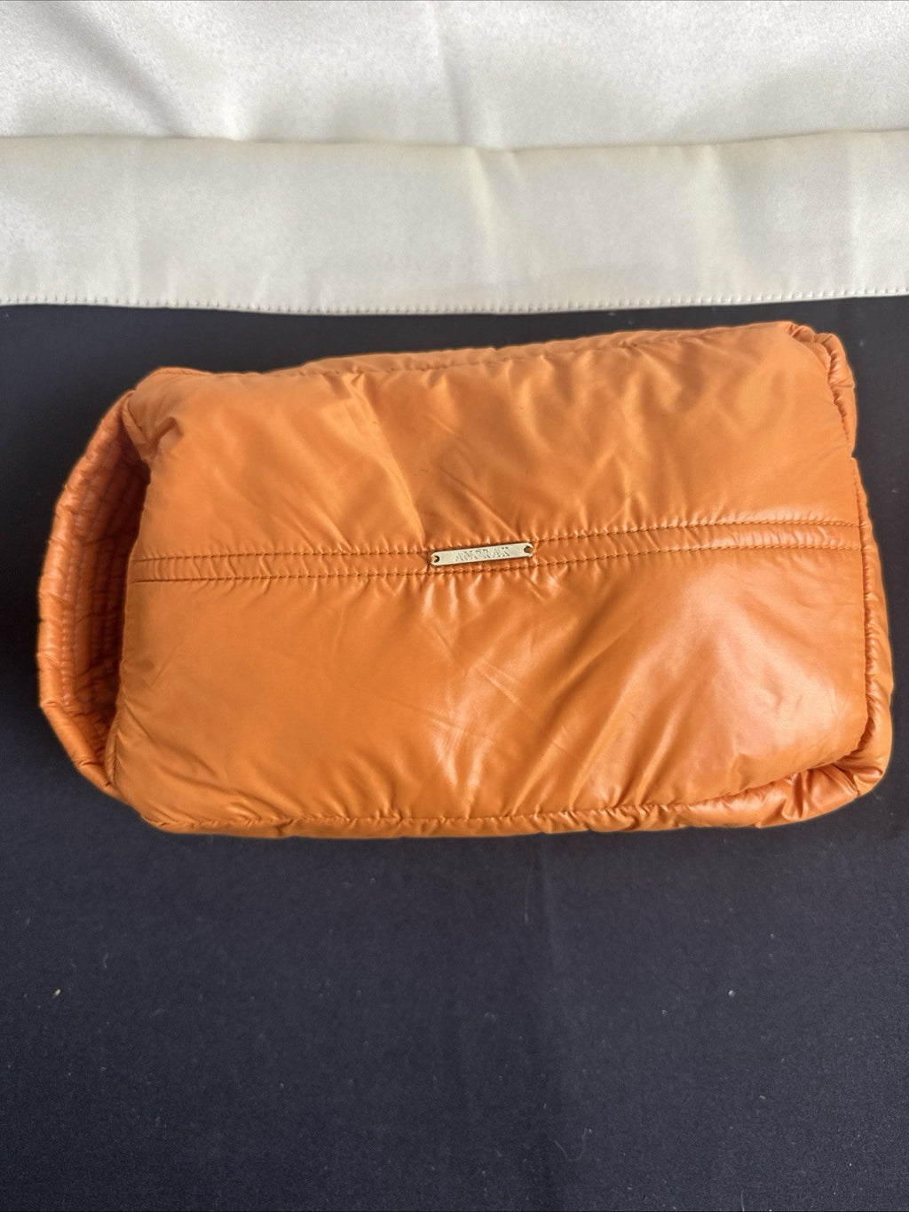 The ANORAK Orange Puffy Travel Toiletry Bag is a stylish and practical accessory for travelers. Made from lightweight polyester material, this puffy pouch features a solid orange color and a zip closure for easy access. With dimensions of 9in x 6in x 3in, it provides ample space for toiletries and other essentials. The bag also includes a handle and straps for convenience, making it a versatile choice for both men and women on the go.