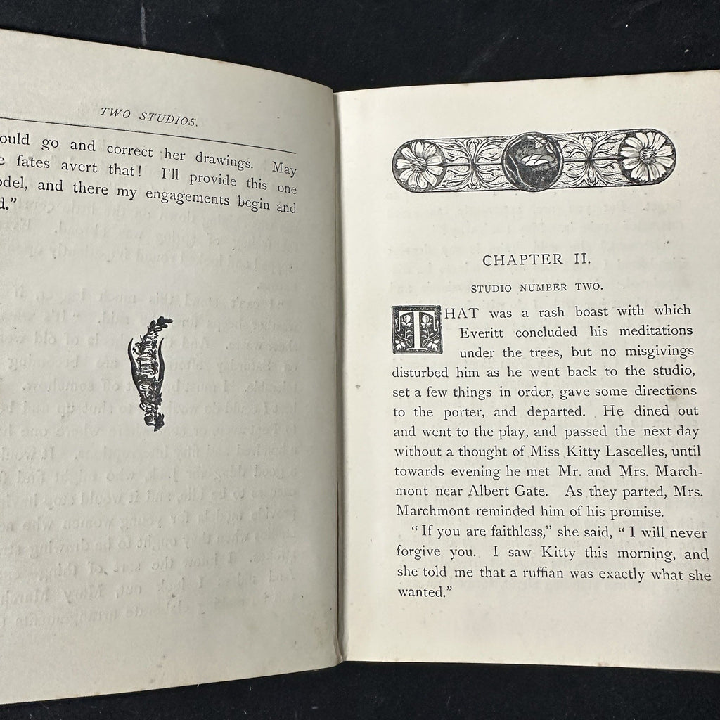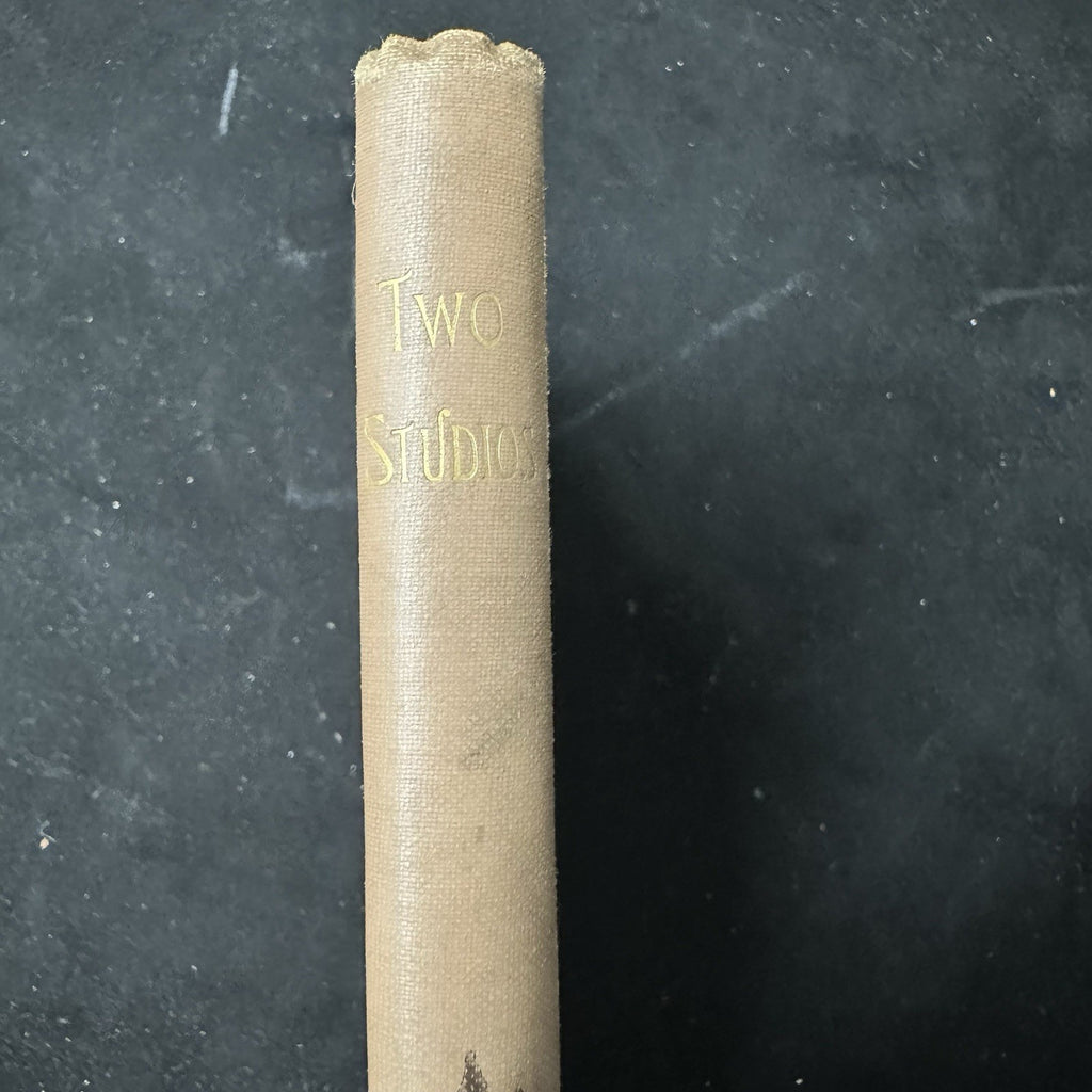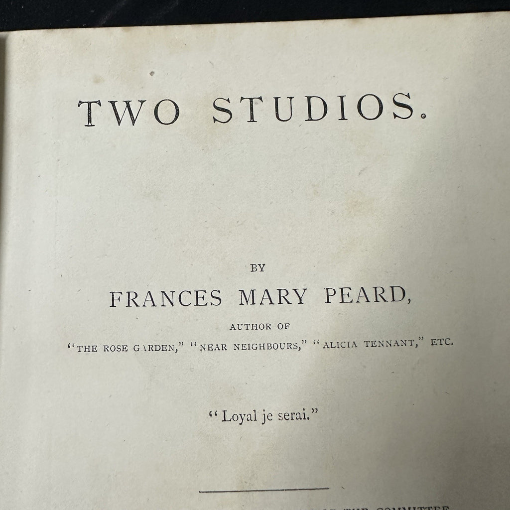 The product is an antique hardcover book titled "Two Studios" by Frances Mary Peard, a romance novel. It is likely that the book was manufactured in France, as indicated by the author's background. This collectible item would be a valuable addition to any book collector's inventory, offering a glimpse into the romantic literature of the past.