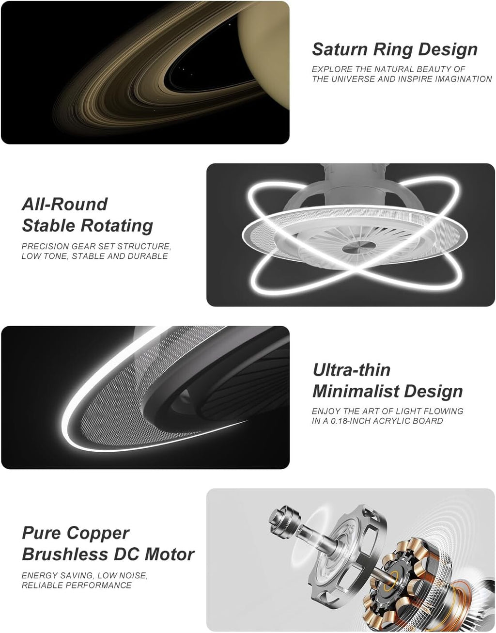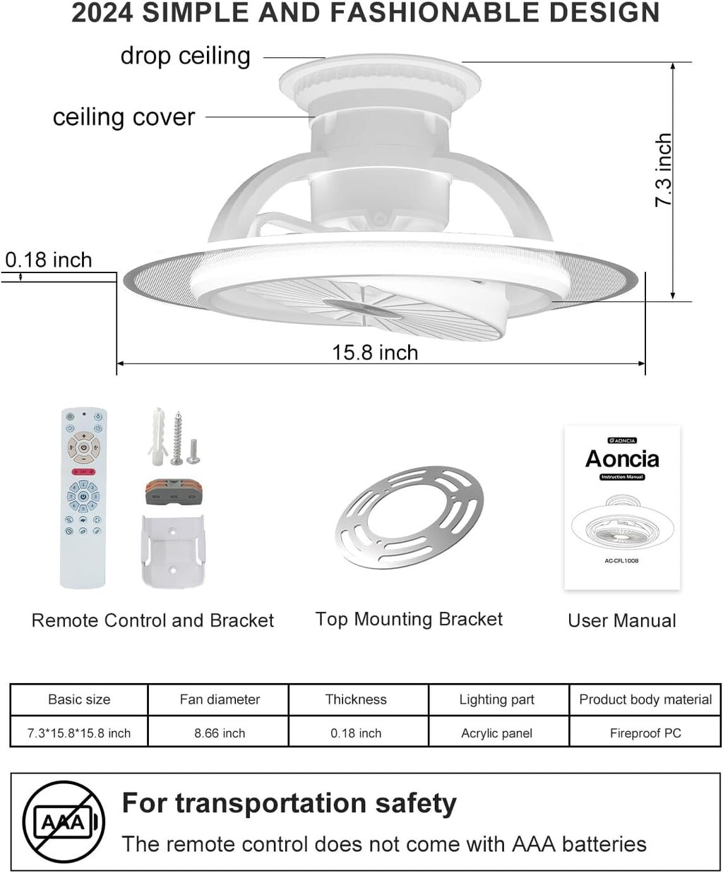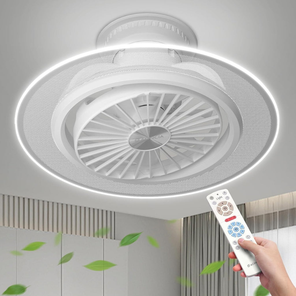 Upgrade your space with the AONCIA Ceiling Fan with Lights and Remote, a sleek, modern, and smart flush-mount ceiling fan designed for style, comfort, and convenience. Perfect for small spaces like kids' bedrooms, kitchens, RVs, gaming rooms, or walk-in closets, this 16" bladeless fan combines powerful airflow, customizable lighting, and whisper-quiet performance. Key Features: 8-Speed Quiet Operation: Powered by a pure copper DC brushless motor, this fan delivers superior airflow with ultra-quiet performance (20dB-37dB), ensuring a peaceful sleep environment. Dimmable LED Lighting: Adjust the 4160LM light from 2700K warm to 6500K cool tones to create the perfect ambiance. The Saturn ring design adds an elegant, mysterious touch. Smart Remote Control: Features 8 speeds, reversible wind, 360° rotation, tiltable airflow, and independent control of fan and light. Dual memory function saves your preferred settings for one-click convenience. Healthy & Reversible Design: Reverses airflow to circulate air and maintain temperature balance, reducing migraines and temperature sensitivity. Ideal for year-round comfort. Safe & Certified: Enclosed mesh grille ensures safety for kids and pets. Certified by CE, UL, TELEC, PSE, ISTA, and FCC. Easy Installation: Pre-assembled with an included installation video, making setup a breeze for any room, including basements, laundry rooms, or campers. Compact & Modern: 16" low-profile design fits flush to the ceiling, perfect for small spaces without sacrificing style or performance. Specifications: Size: 16 inches Light Output: 4160LM, 2700-6500K dimmable Motor: Pure copper DC brushless Noise Level: 20dB-37dB Certifications: CE, UL, TELEC, PSE, ISTA, FCC Warranty: 3-year quality issue replacement Ideal For: Kids' bedrooms Kitchens RVs & campers Media or gaming rooms Walk-in closets Basements & laundry rooms What’s Included: AONCIA Ceiling Fan with LED Light Remote Control Installation Video & Manual Pre-assembled components for easy setup Why Buy This Fan?This AONCIA ceiling fan combines cutting-edge technology with a stylish, bladeless design. Whether you need powerful airflow, mood-setting lighting, or a safe, quiet fan for your home, this fan delivers it all.