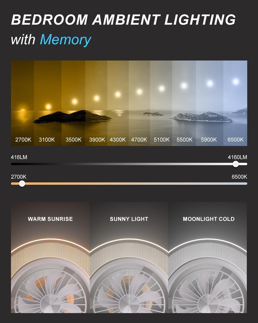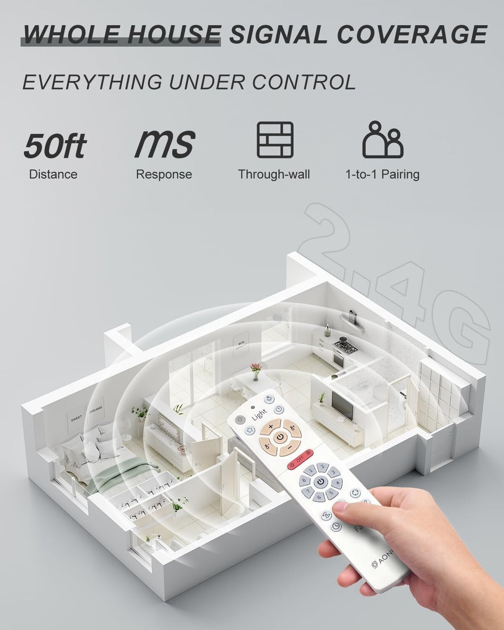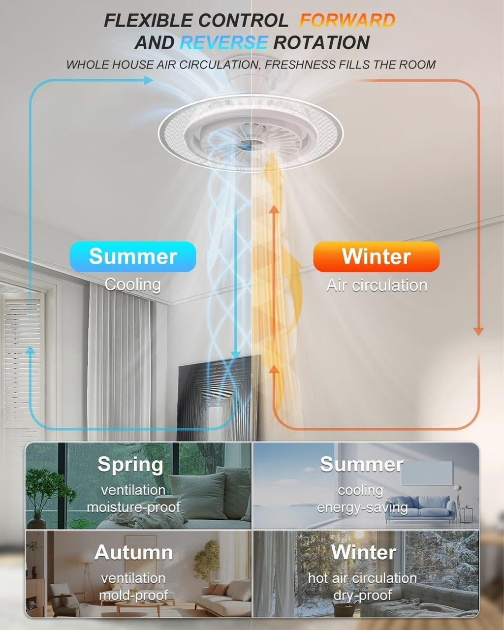 Upgrade your space with the AONCIA Ceiling Fan with Lights and Remote, a sleek, modern, and smart flush-mount ceiling fan designed for style, comfort, and convenience. Perfect for small spaces like kids' bedrooms, kitchens, RVs, gaming rooms, or walk-in closets, this 16" bladeless fan combines powerful airflow, customizable lighting, and whisper-quiet performance. Key Features: 8-Speed Quiet Operation: Powered by a pure copper DC brushless motor, this fan delivers superior airflow with ultra-quiet performance (20dB-37dB), ensuring a peaceful sleep environment. Dimmable LED Lighting: Adjust the 4160LM light from 2700K warm to 6500K cool tones to create the perfect ambiance. The Saturn ring design adds an elegant, mysterious touch. Smart Remote Control: Features 8 speeds, reversible wind, 360° rotation, tiltable airflow, and independent control of fan and light. Dual memory function saves your preferred settings for one-click convenience. Healthy & Reversible Design: Reverses airflow to circulate air and maintain temperature balance, reducing migraines and temperature sensitivity. Ideal for year-round comfort. Safe & Certified: Enclosed mesh grille ensures safety for kids and pets. Certified by CE, UL, TELEC, PSE, ISTA, and FCC. Easy Installation: Pre-assembled with an included installation video, making setup a breeze for any room, including basements, laundry rooms, or campers. Compact & Modern: 16" low-profile design fits flush to the ceiling, perfect for small spaces without sacrificing style or performance. Specifications: Size: 16 inches Light Output: 4160LM, 2700-6500K dimmable Motor: Pure copper DC brushless Noise Level: 20dB-37dB Certifications: CE, UL, TELEC, PSE, ISTA, FCC Warranty: 3-year quality issue replacement Ideal For: Kids' bedrooms Kitchens RVs & campers Media or gaming rooms Walk-in closets Basements & laundry rooms What’s Included: AONCIA Ceiling Fan with LED Light Remote Control Installation Video & Manual Pre-assembled components for easy setup Why Buy This Fan?This AONCIA ceiling fan combines cutting-edge technology with a stylish, bladeless design. Whether you need powerful airflow, mood-setting lighting, or a safe, quiet fan for your home, this fan delivers it all.