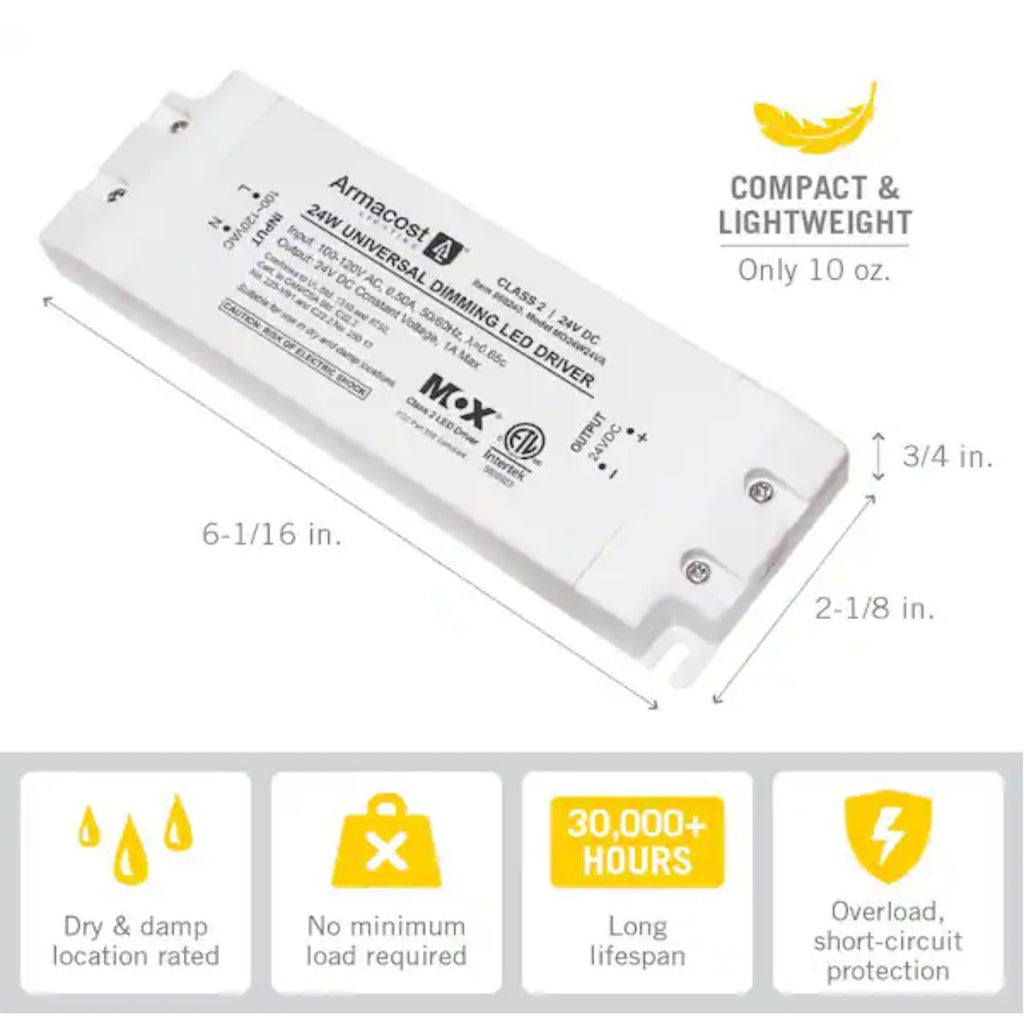 The Armacost Lighting 24-Watt Universal Dimming LED Transformer Driver is a compact and lightweight device that provides a consistent 24-volt DC output for LED lighting. With a wattage of 24W and a voltage output of 24V, this transformer is designed for use with a variety of LED lights. The dimmable feature allows for customizable brightness levels, while the constant voltage driver type ensures stable performance. This product is ideal for home and garden lighting setups, providing a reliable and energy-efficient solution for illuminating outdoor spaces.