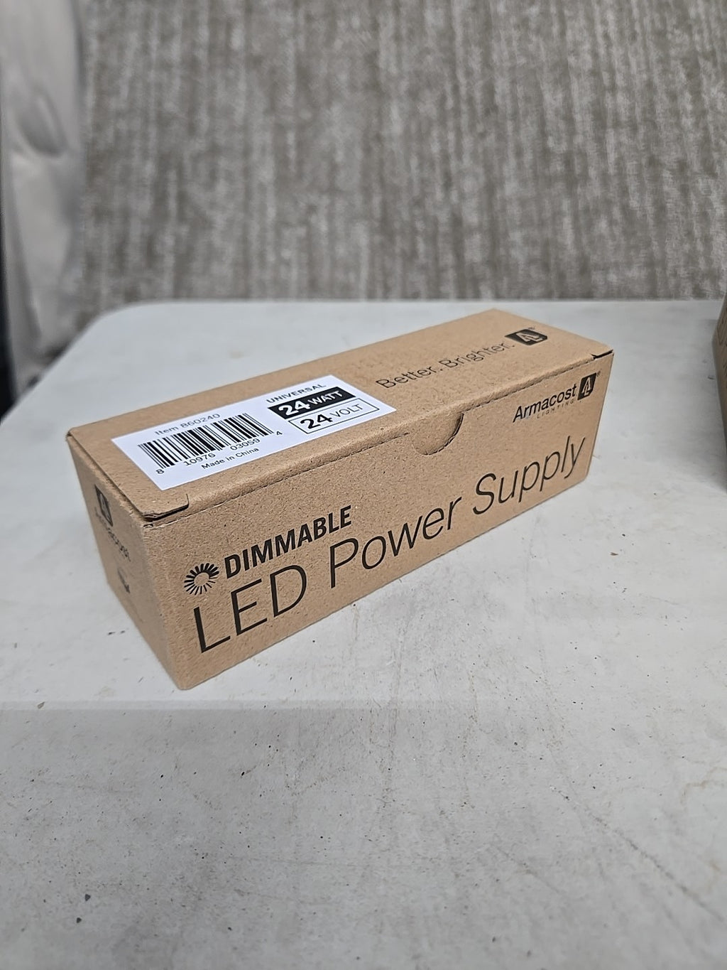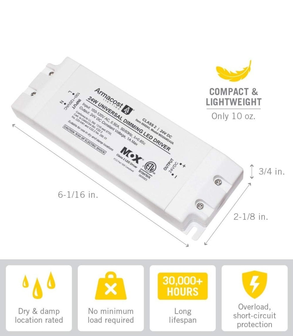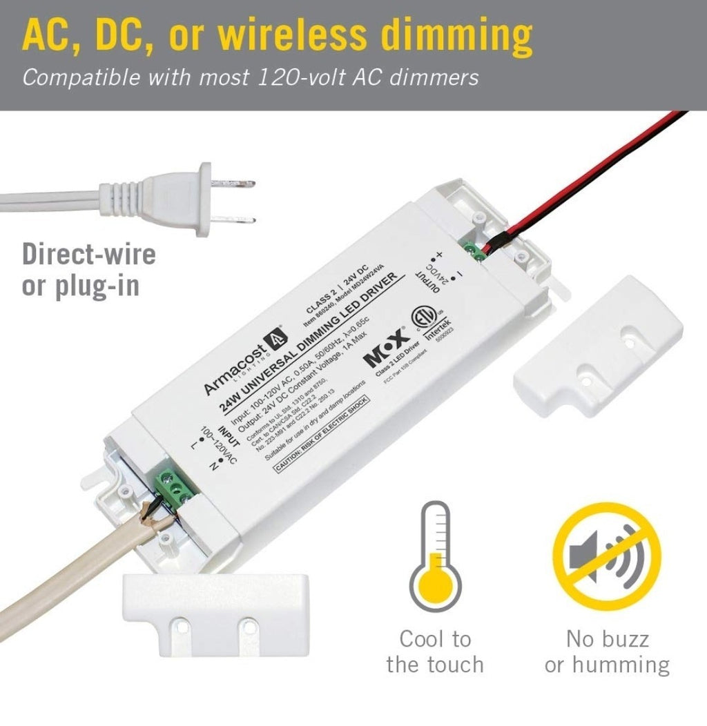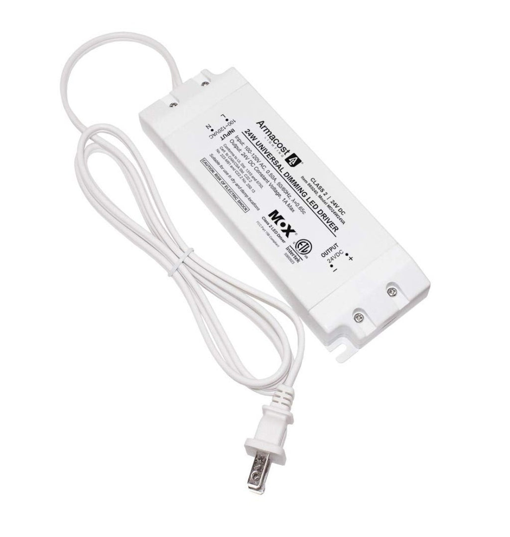 The Armacost Lighting 860240 is a 24 Watt LED driver designed for indoor use. It features a removable AC cord for convenient installation and offers a dimmable feature for customizable lighting levels. The white plastic unit is designed with 2 pin connectors and operates on Bluetooth smart home protocol for added convenience. This LED driver is compatible with Armacost Lighting products and provides reliable power for a single AR111 bulb at 24V output voltage.