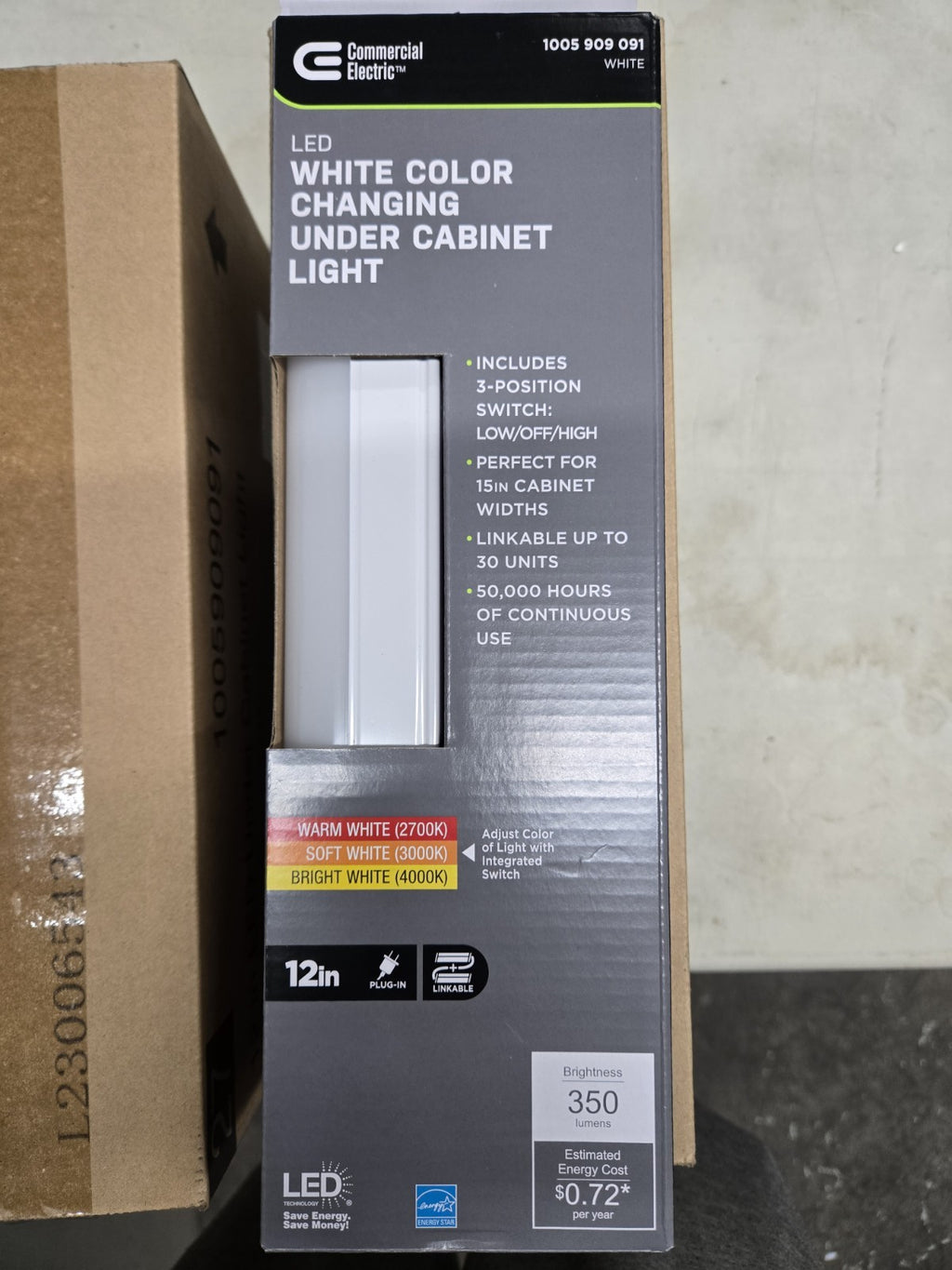 The product is a box of 5 LED white color changing under cabinet lights by Commercial Electric. Each light features an energy-efficient 2835 LED chip with a power source of corded, providing bright and adjustable lighting with a dimmable control style. These lights are designed for easy installation under cabinets with a wall switch control style, offering a sleek and modern lighting solution for indoor spaces. With a voltage of 120V, these LED fixtures are a practical and stylish choice for enhancing the lighting in your home or kitchen area.