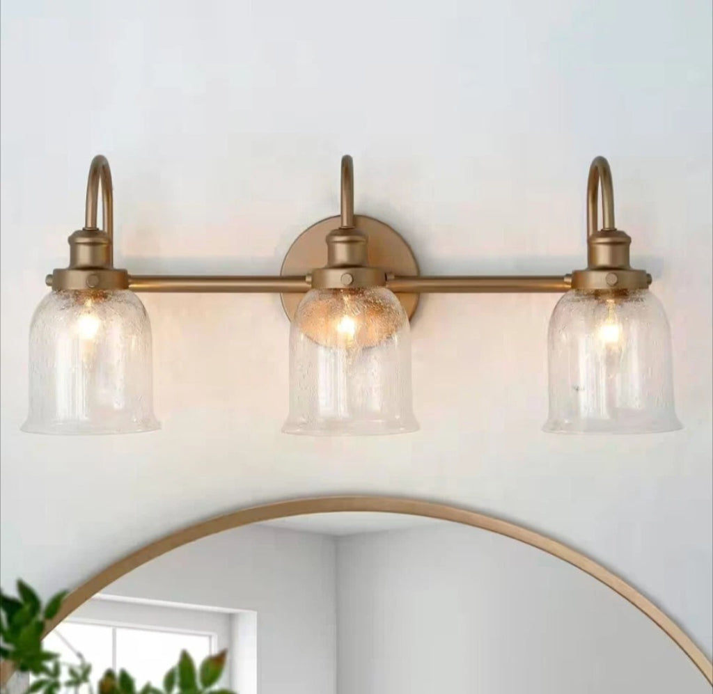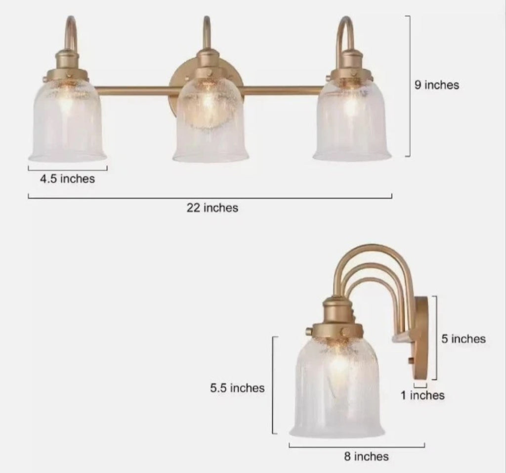 The Brass Gold Bathroom Vanity Light is a stylish and elegant wall sconce designed for a bathroom or powder room. This 3-light fixture features a cage or lantern shape with clear glass shades, providing a warm and inviting ambiance. The fixture is made of metal with a gold finish, suitable for a modern or traditional decor. With a damp rated design and dimmable feature, this light is not only functional but also adds a touch of sophistication to any space. Complete with mounting hardware and manufacturer warranty, this wall sconce is a perfect addition to any home.