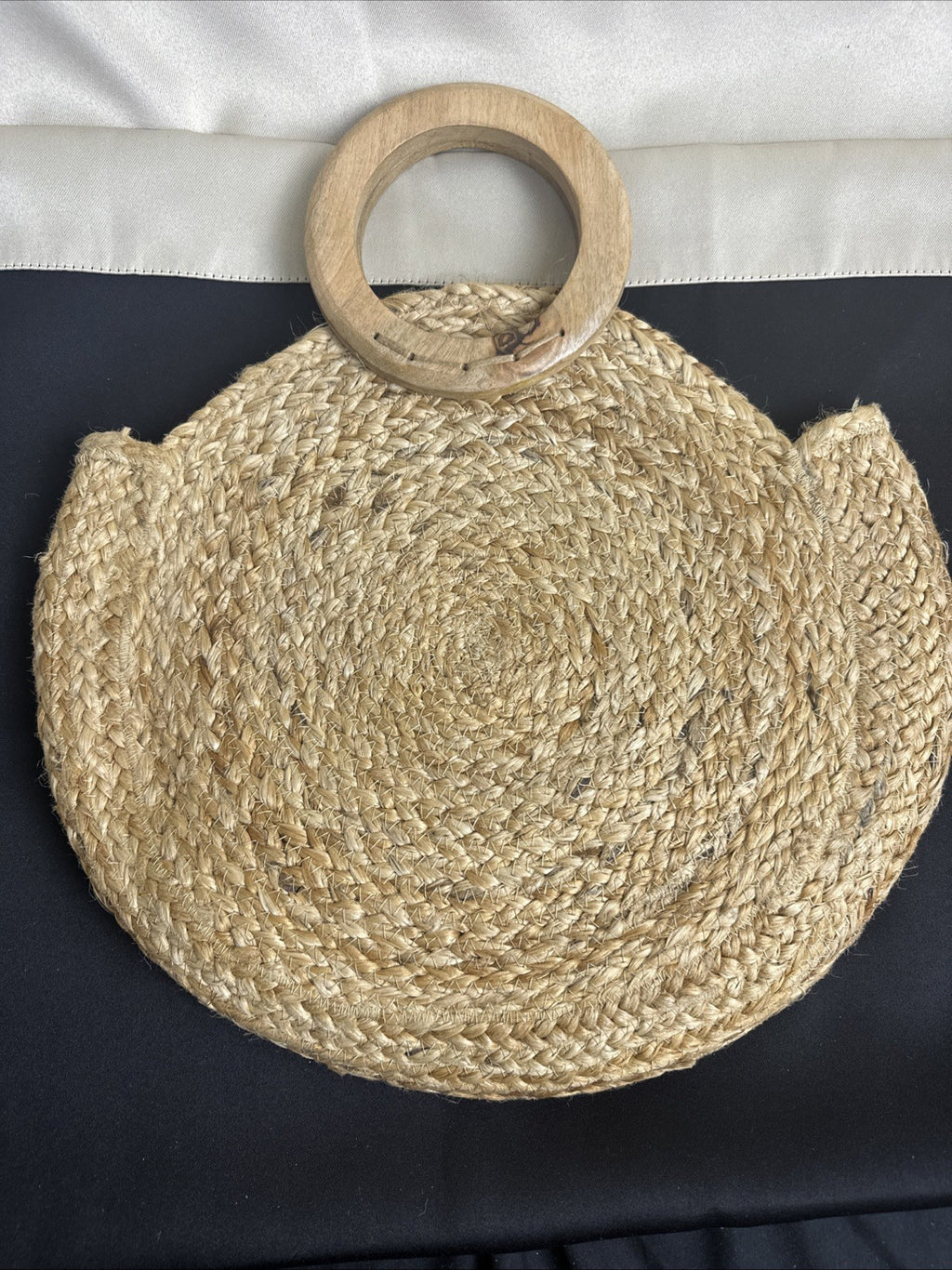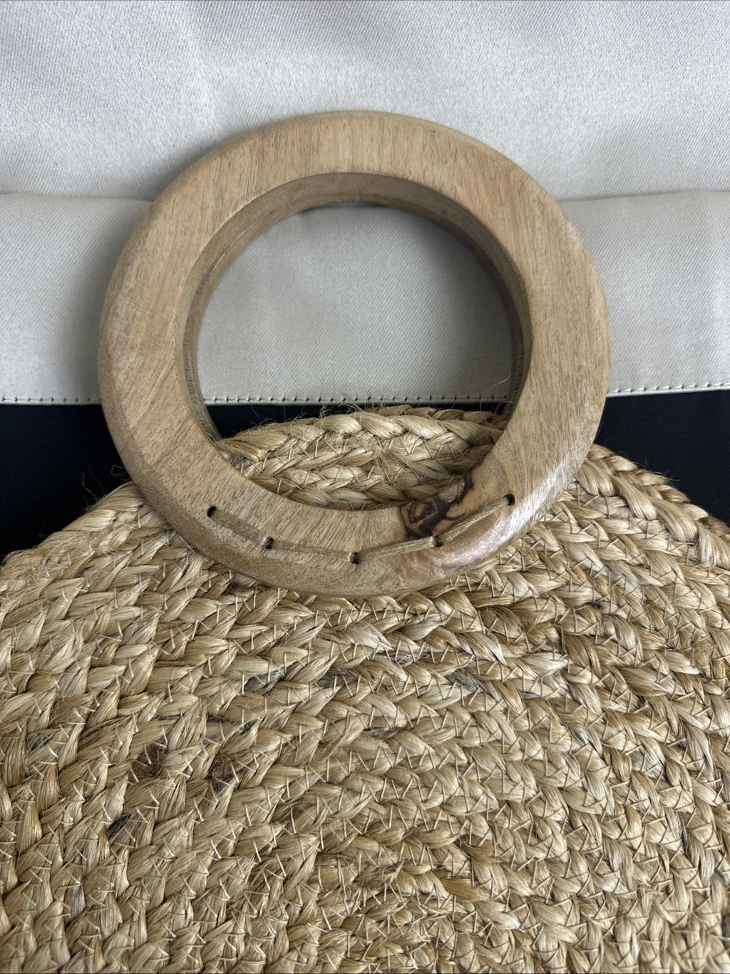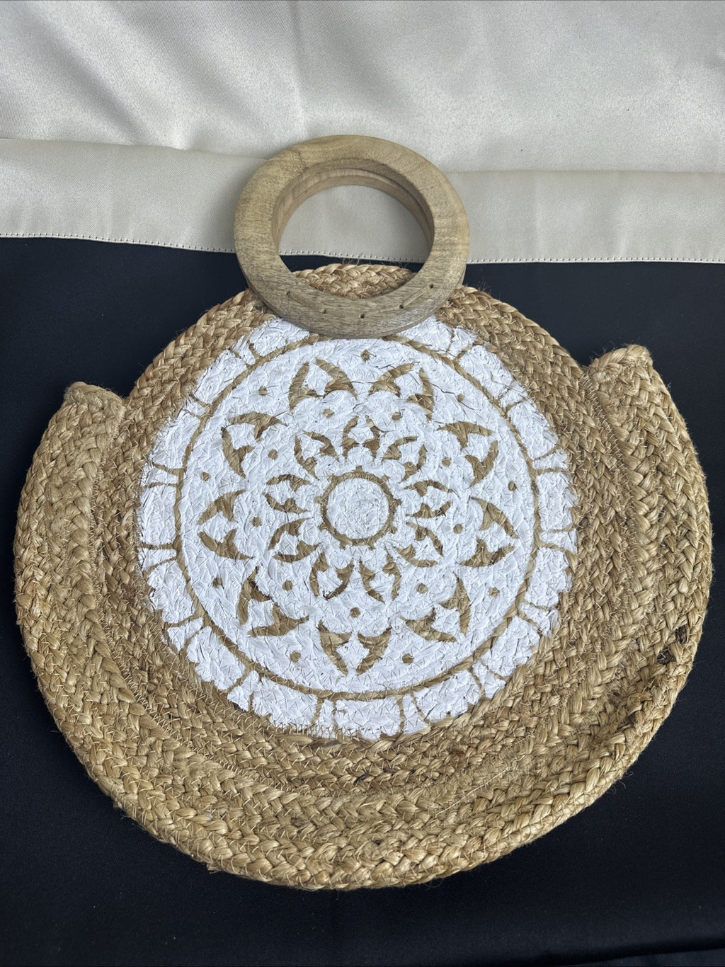 Chloe & Lex Round Woven Bag Wooden Handle White Pattern 8B