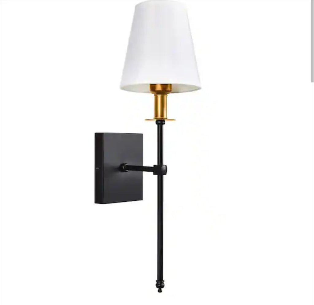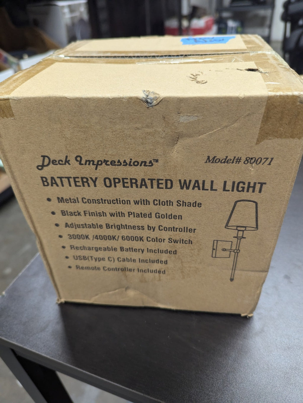 The Deck Impressions Cordless Rechargeable Operated Wall Light with Remote Control is a stylish and modern wall lamp with a unique 2-tone finish and a fabric shade. It features a circular shape and a metal fixture material, with a black color and a white shade color family. The wall light is designed for LED light bulbs and has a battery-operated connection type, making it easy to operate and adjust with the included remote control. With a mid-century modern style and a dry-rated damp/wet rating, this wall lamp is perfect for adding a touch of elegance to any room in your home.