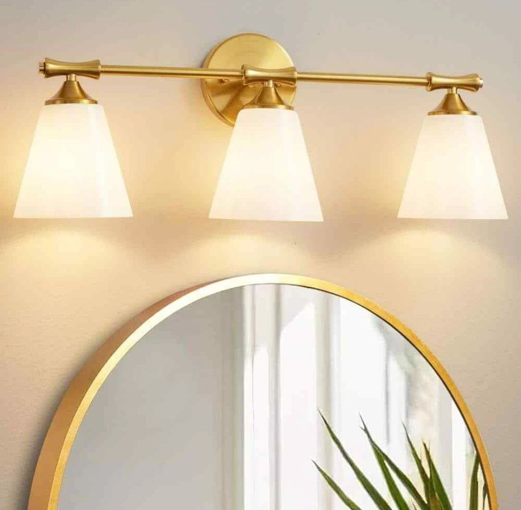 The Deyidn 24.33 in. 3-Lights Gold Bathroom Vanity Light Fixture with Opal Frosted Glass Shade is a stylish and elegant lighting fixture designed for bathroom vanities. With a gold color finish and frosted glass shade, this fixture adds a touch of luxury to any bathroom decor. The fixture is hardwired for easy installation and includes mounting hardware for convenience. With three lights and a maximum bulb wattage of 60W, this fixture provides ample lighting for grooming and Makeup routines. The fixture's compact size and mounting position make it suitable for various vanity sizes.