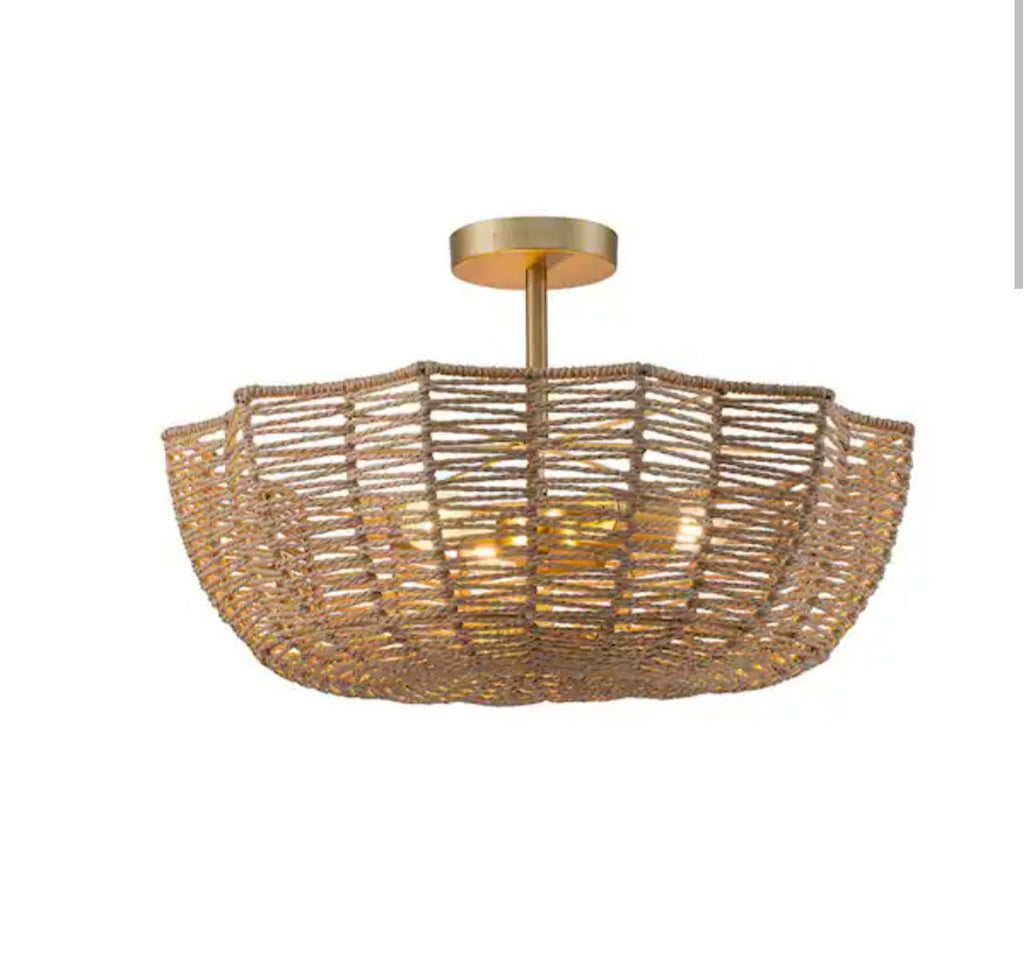 The ELE Light & Decor Marigold 3-Light 21 in. Woven Semi-Flush Ceiling Light is a modern chandelier designed for indoor use. This stylish light fixture features a woven semi-flush design with a drum-shaped shade, perfect for adding a touch of elegance to any room. With LED lighting technology, this chandelier provides a warm and cozy ambiance while also being energy-efficient. The 1-year manufacturer warranty ensures that you can enjoy this beautiful ceiling light for years to come.