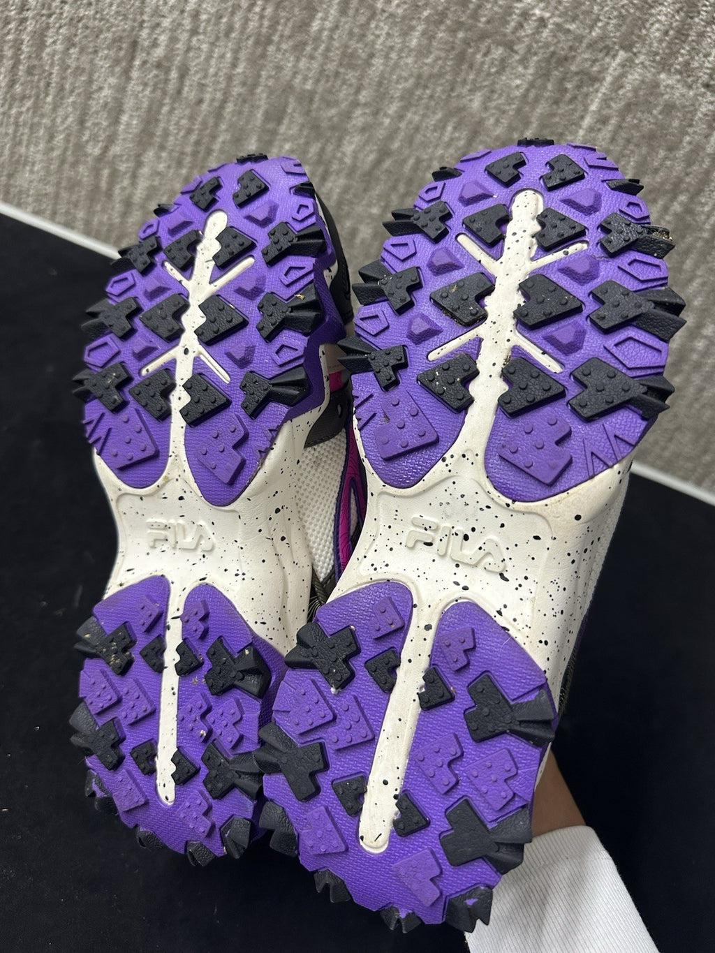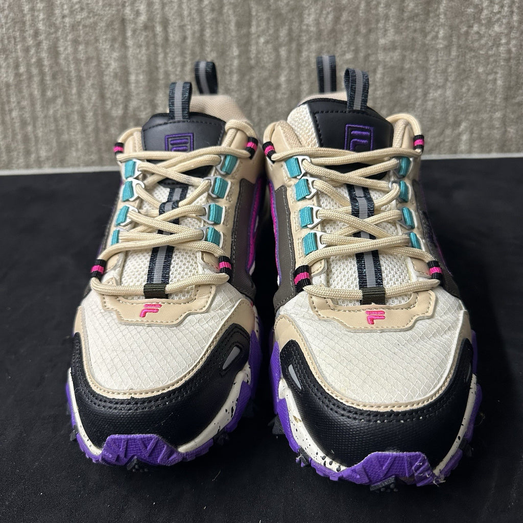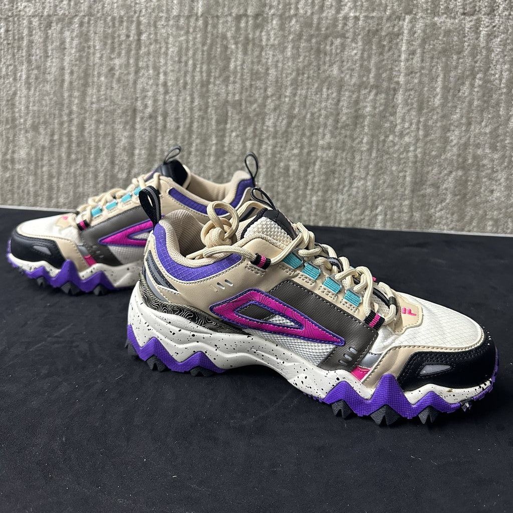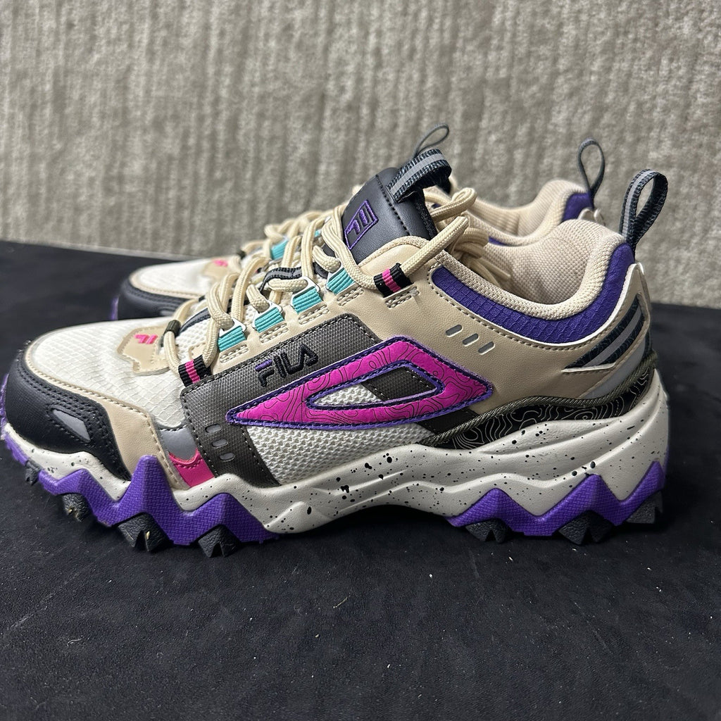 The FILA Oakmont TR Women's Sneakers in US Size 7.5 are stylish athletic shoes designed for women. With a lace-up closure and standard shoe width, these sneakers are perfect for various activities such as track and field, walking, hiking, and running. The gardenia, thyme, and electric purple color combination adds a pop of color to your outfit, while the leather upper material ensures durability. Whether you're hitting the track or just running errands, these FILA sneakers are a versatile choice for the summer, fall, and spring seasons.