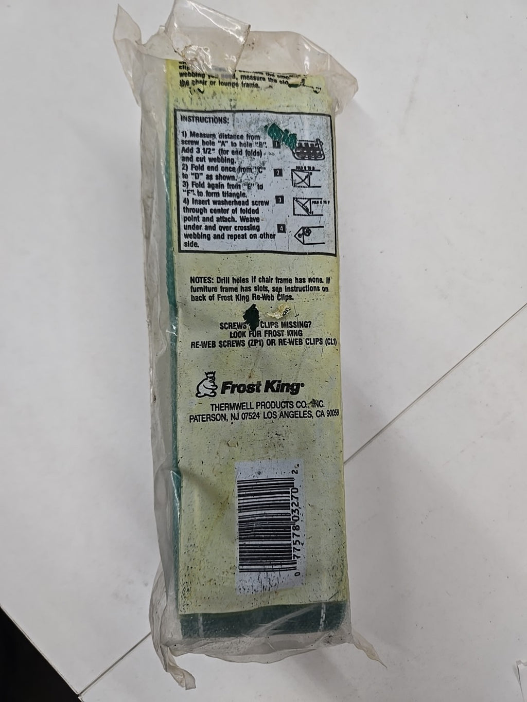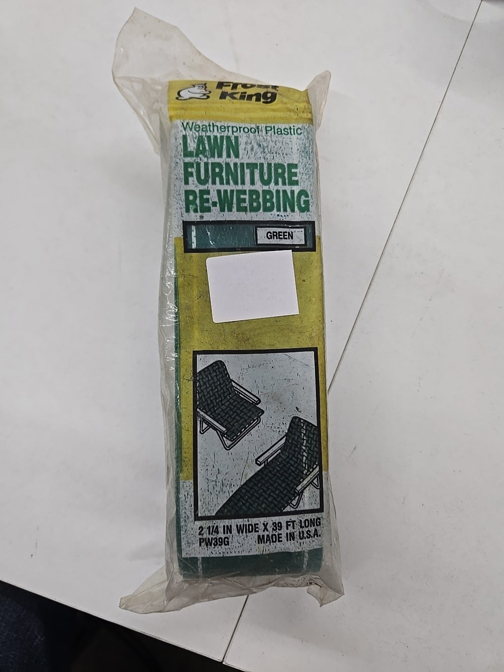The Frost King Lawn Furniture Re-Webbing in green is a 39-foot long roll of polypropylene material designed for both indoor and outdoor use. This replacement webbing, made by the brand Frost King, is 2-1/4 inches wide and .625 inches thick, perfect for re-webbing patio chairs. Assembly is required, and additional parts are needed for the project. With a seat depth of 4 inches and a seat height of 4 inches, this outdoor-style webbing is a practical and durable choice for repairing and upgrading patio furniture.