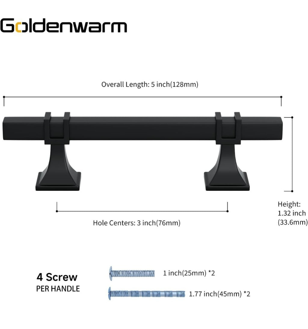 The Goldenwarm 6 Pack Black Cabinet Handles are modern, sleek drawer pulls made of stainless steel. With a 3-inch center-to-center measurement and an extension length of 1-2 inches, these handles are versatile and suitable for universal/reversible door handing. Supplied with fixings, these black cabinet handles are perfect for adding a stylish touch to your kitchen or bathroom cabinets. Made in China, they offer a convenient and elegant solution for your home improvement needs.
