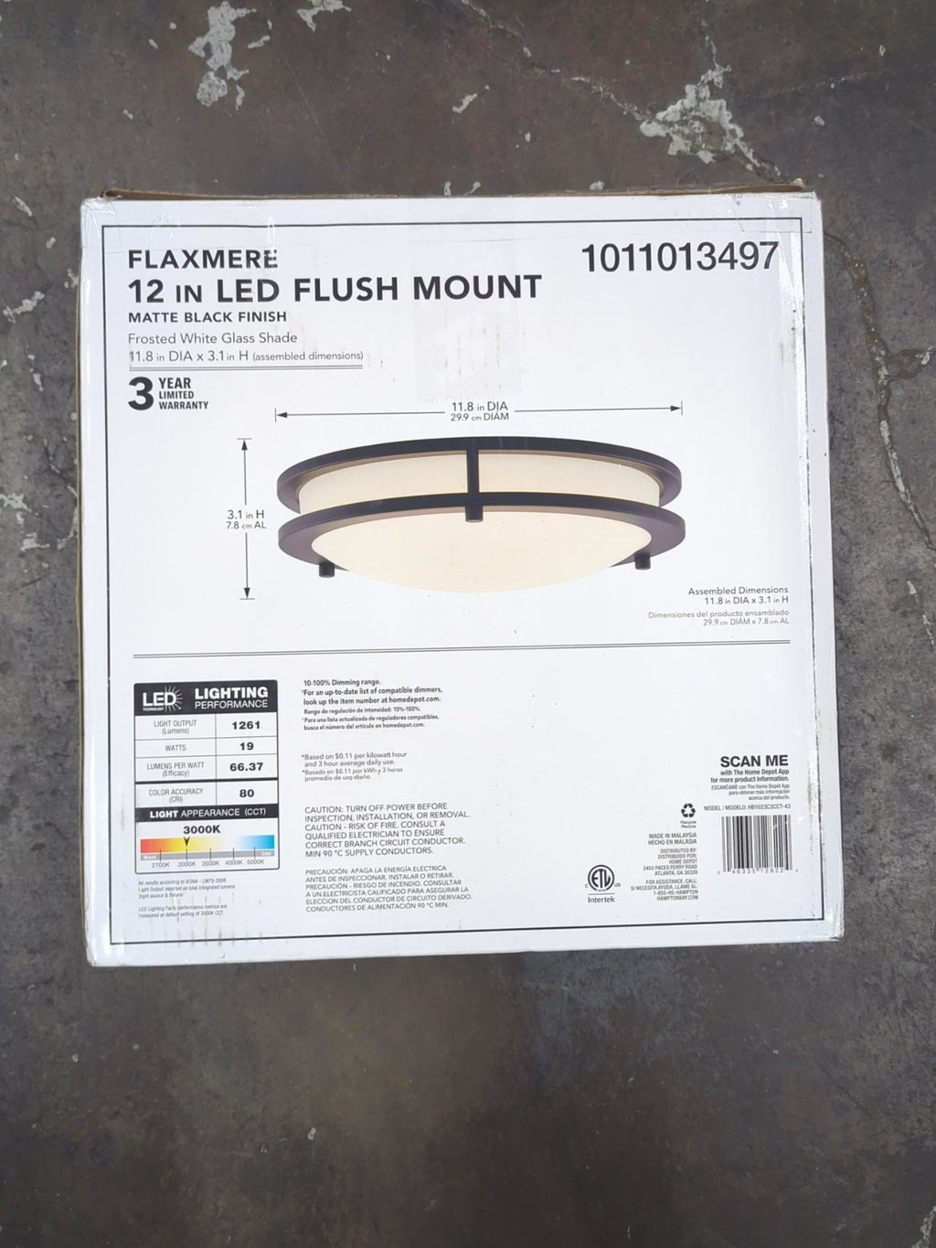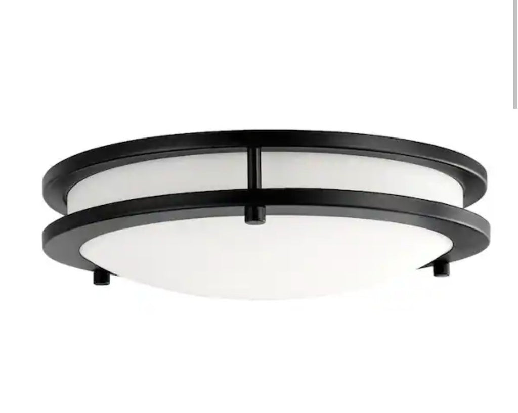 The Hampton Bay Flaxmere 12 in. Matte Black Integrated LED Flush Mount Ceiling Light is a modern and sleek fixture perfect for various indoor spaces like bedrooms, living rooms, and bathrooms. With a round shape and a matte black finish, this ceiling light features white LED lighting that can be dimmed for customizable brightness. Hardwired for power source, this Hampton Bay ceiling light is designed for energy efficiency and is suitable for different room types including study rooms, closets, and kitchens. Its contemporary style and LED technology make it a stylish and practical addition to any home.