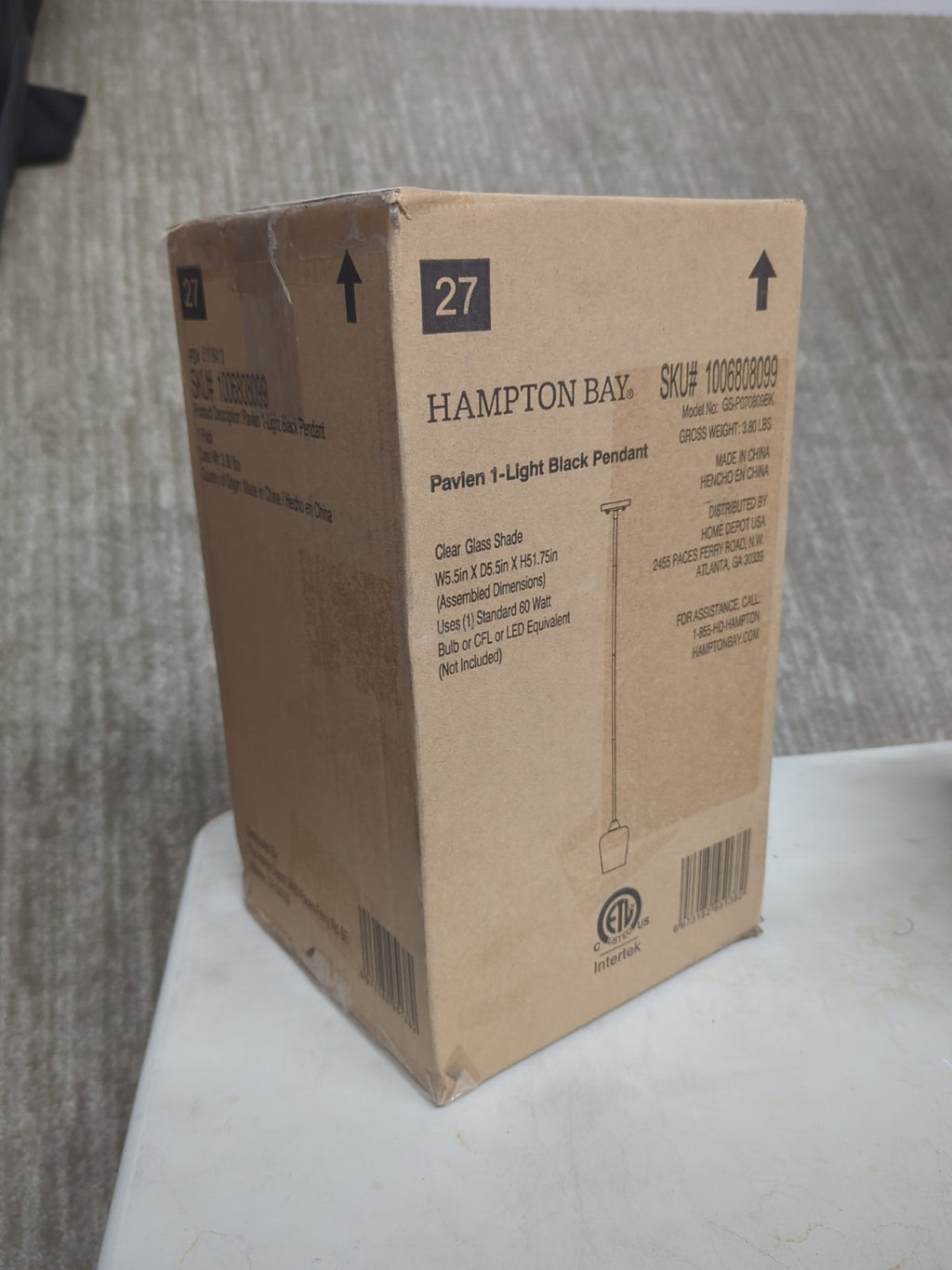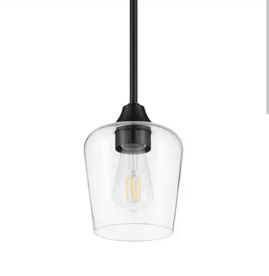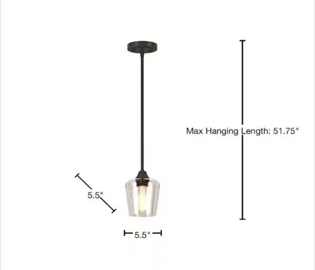 The Hampton Bay Pavlen 5.5 in. 1-Light Black Mini Pendant with Clear Glass Shade is a stylish and versatile lighting fixture perfect for any home. With a sleek black finish and a clear glass shade, this pendant light adds a touch of sophistication to any room. It features a bell-shaped design and a down rod hanging device, making it easy to install and adjust to the desired height. The fixture is hardwired and includes all necessary hardware for installation. With a maximum bulb wattage of 60W and a non-dimmable capability, this pendant light provides plenty of light and a modern aesthetic.