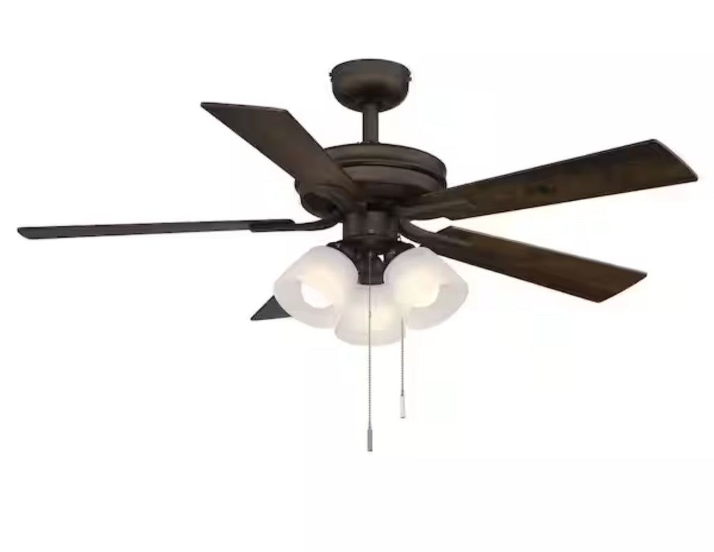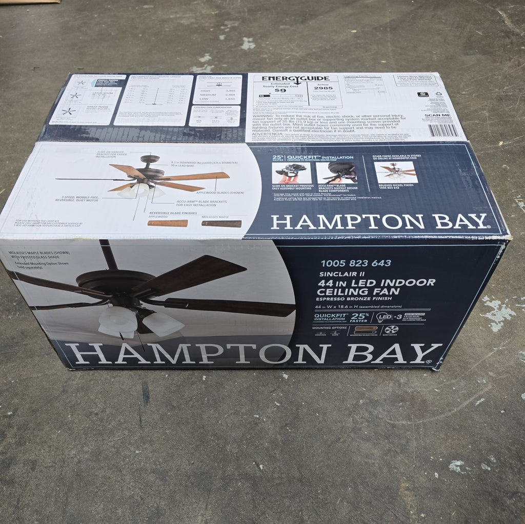 The Hampton Bay Sinclair II 44 in. Indoor Oil Rubbed Bronze LED Ceiling Fan + Light is a stylish and functional addition to any indoor space. With a sleek steel housing and medium density fiberboard blades in a warm brown color, this ceiling fan is both durable and aesthetically pleasing. The 3-speed motor with a max RPM of 201 creates efficient airflow, while the LED light emits a soft white glow with a lumens output of 1350. Suitable for small rooms, this ceiling fan is designed for both commercial and residential use, and can be controlled with a pull chain or switch for added convenience.