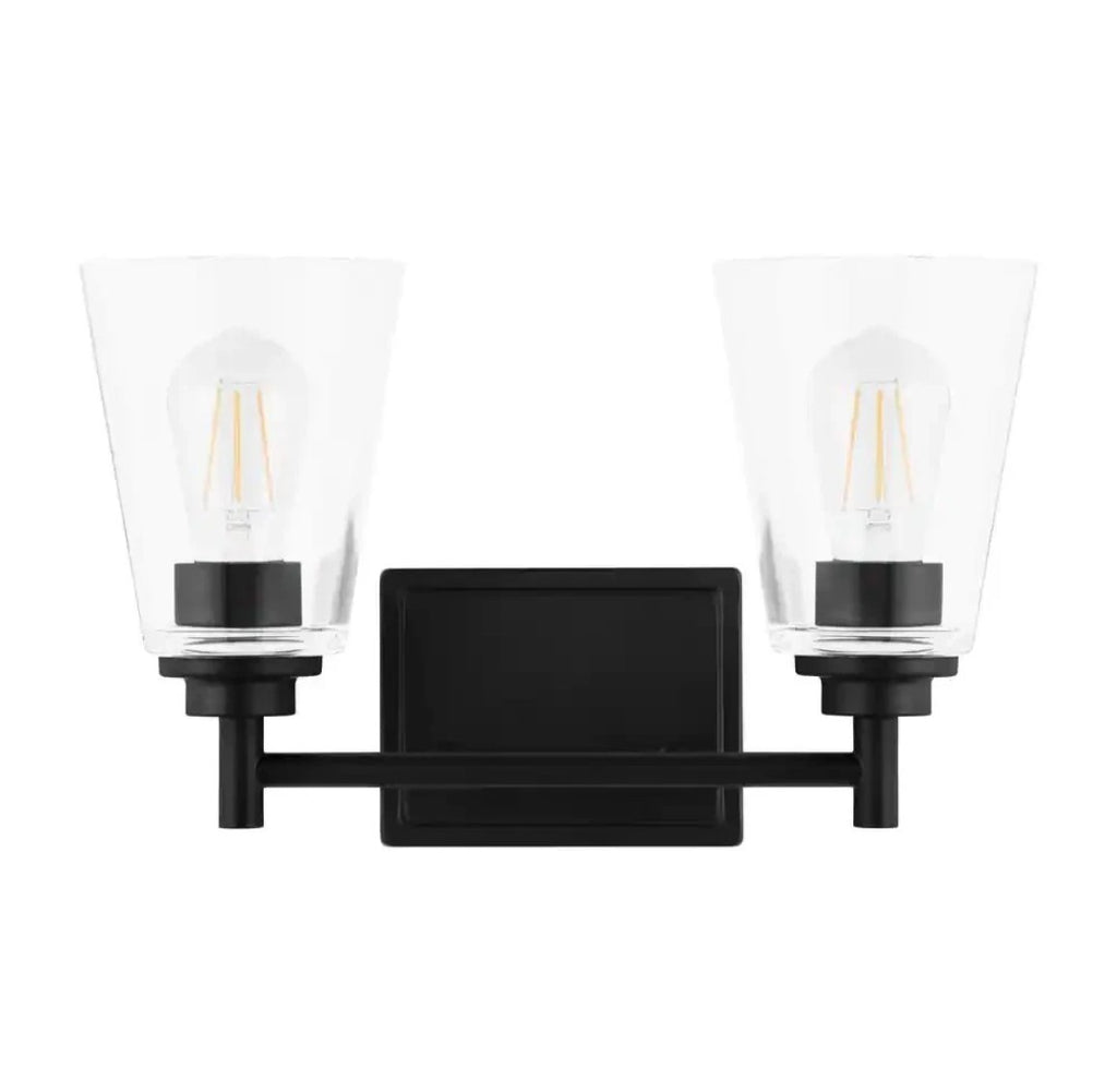 The Hampton Bay Wakefield 15 in. 2-Light Vanity Lighting fixture is a modern and sleek addition to any bathroom. With a matte black finish and clear glass shades, it provides a stylish and contemporary look. The 15-inch diameter and two light fixtures ensure adequate illumination for grooming tasks. Made of durable glass material, this vanity lighting fixture is both functional and aesthetically pleasing, perfect for adding a touch of elegance to your bathroom decor.