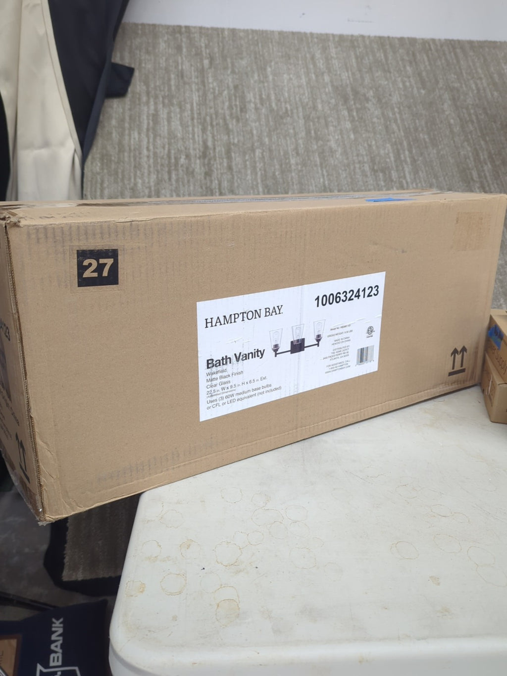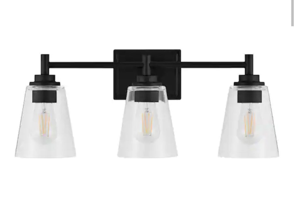 The Hampton Bay Wakefield 22 in. 3-Light Black Modern Vanity is a stylish and contemporary lighting fixture designed for the bathroom. With a matte black finish and clear glass shades, this hardwired vanity light adds a modern touch to your space. The fixture includes mounting hardware and is recommended for a 25-inch vanity size. This sconce light is perfect for adding both functionality and a sleek design to your home's décor.