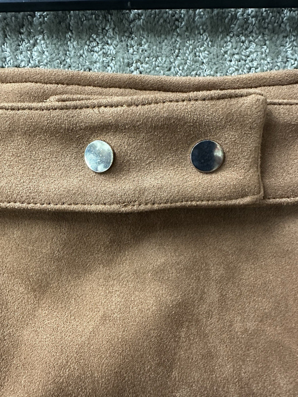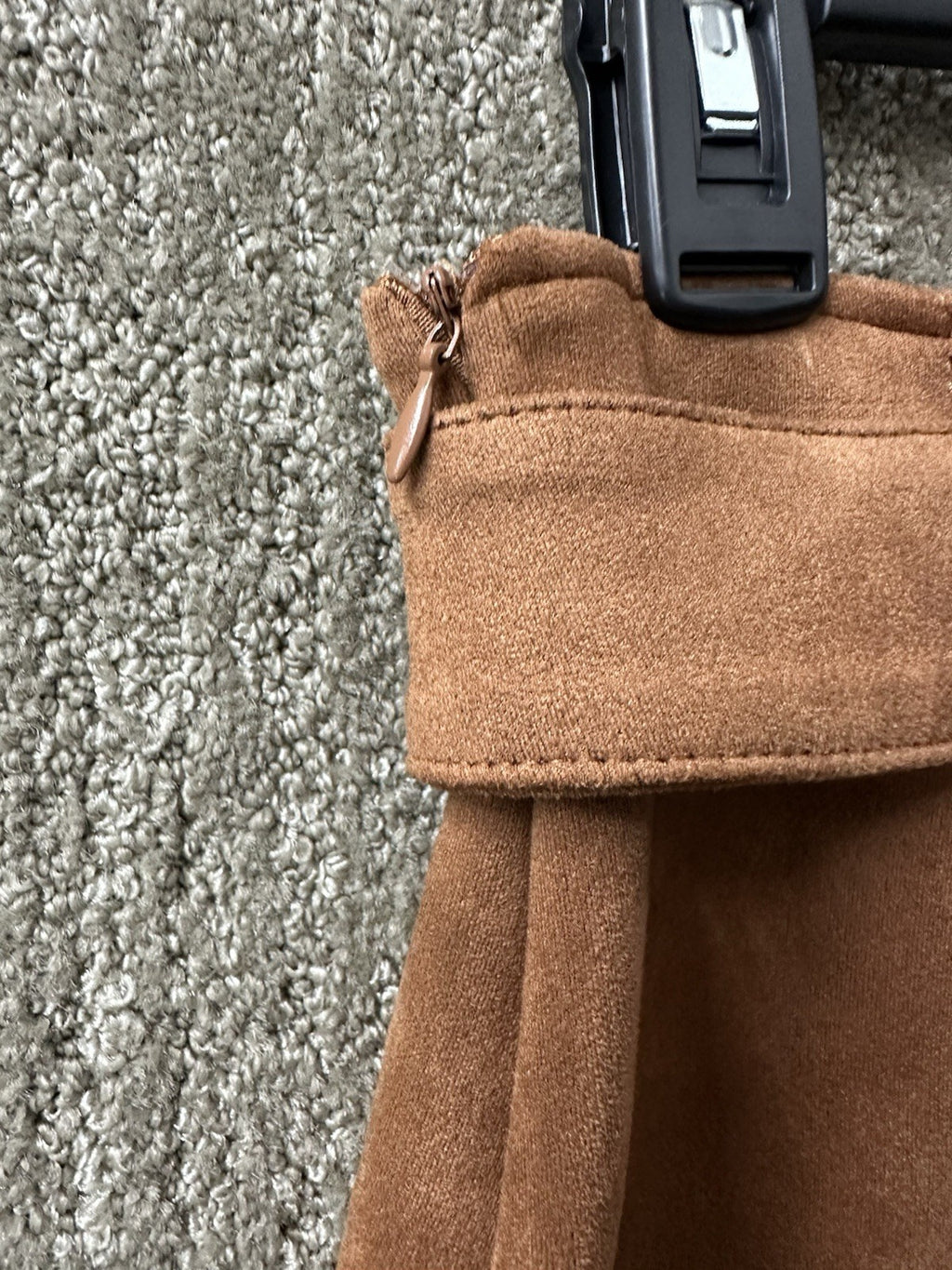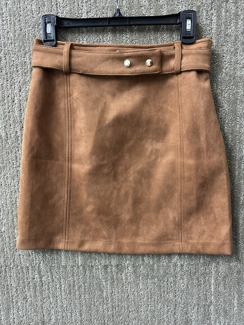 The Haute Monde Women's Brown Flat Front Stretch Faux Suede Belted Mini Skirt in size Medium is a stylish and versatile piece perfect for any wardrobe. Made from a comfortable polyester blend fabric with a faux suede texture, this skirt features a flattering belted waist and a trendy zip closure. The dreamy brown color and mini length make it easy to pair with your favorite top for a chic and effortless look. With its stretch feature and regular sizing, this skirt is both fashionable and functional for any occasion.