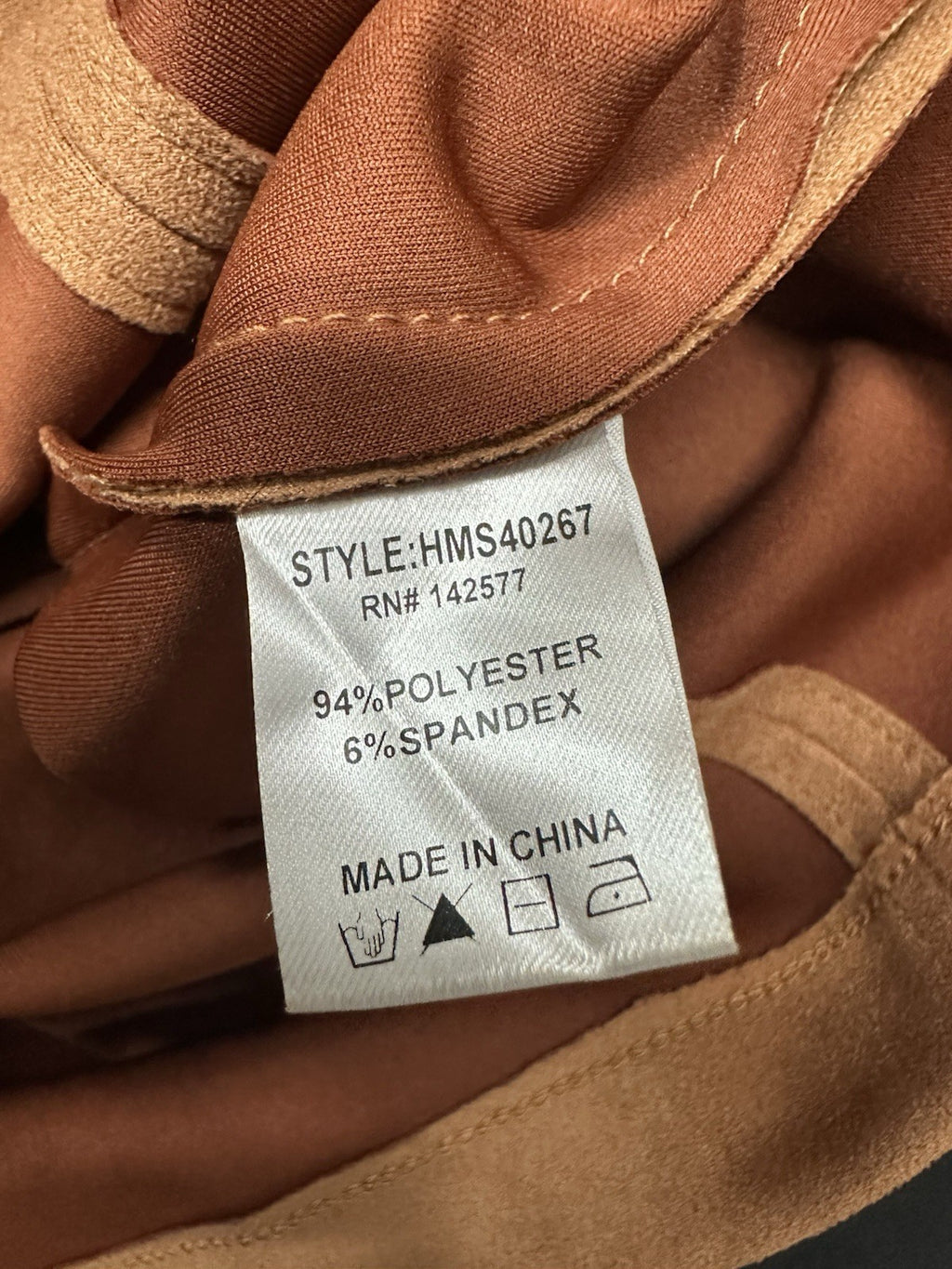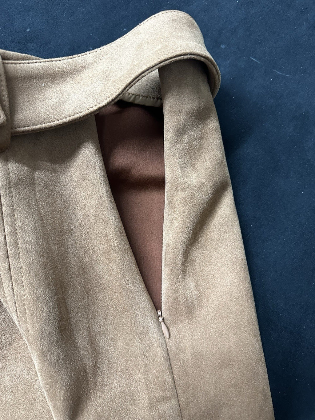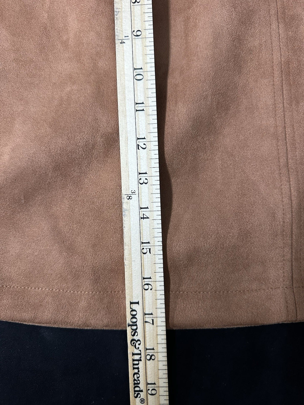 The Haute Monde Women's Brown Flat Front Stretch Faux Suede Belted Mini Skirt in size Medium is a stylish and versatile piece perfect for any wardrobe. Made from a comfortable polyester blend fabric with a faux suede texture, this skirt features a flattering belted waist and a trendy zip closure. The dreamy brown color and mini length make it easy to pair with your favorite top for a chic and effortless look. With its stretch feature and regular sizing, this skirt is both fashionable and functional for any occasion.