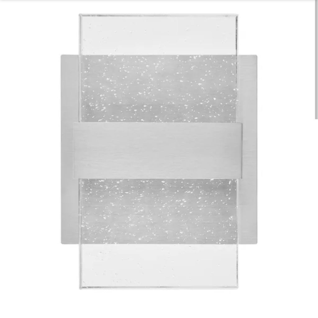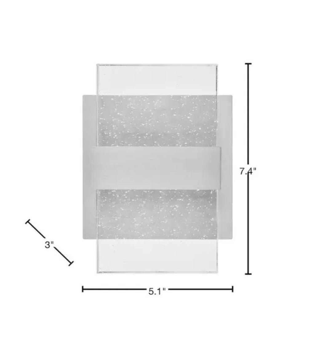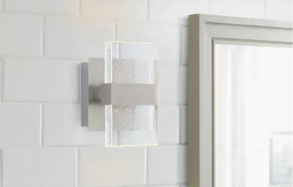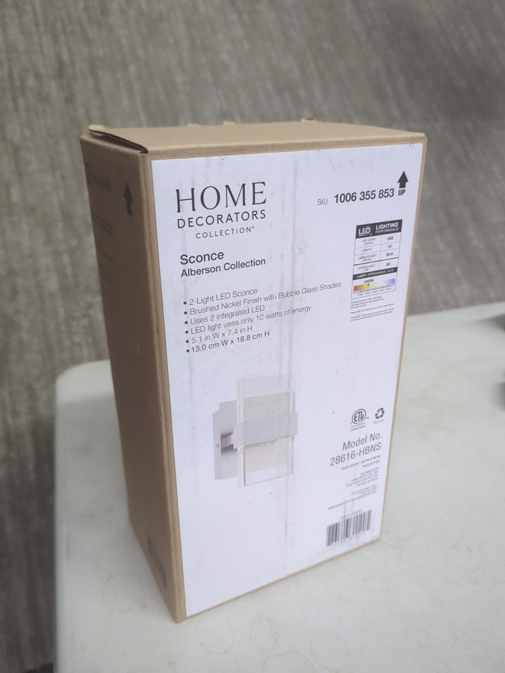 The Home Decorators Alberson 2-Light LED Indoor Wall Sconce with Bubble Glass is a modern and stylish fixture featuring a brushed nickel finish with a square-shaped shade made of bubble glass. This wall sconce is designed for indoor use and has a damp rating, making it suitable for various spaces in your home. With a warm white color temperature and integrated LED light bulbs, this fixture provides a bright and inviting lighting solution. The fixture includes mounting hardware and is hardwired for easy installation. Perfect for adding a touch of elegance to your living space.