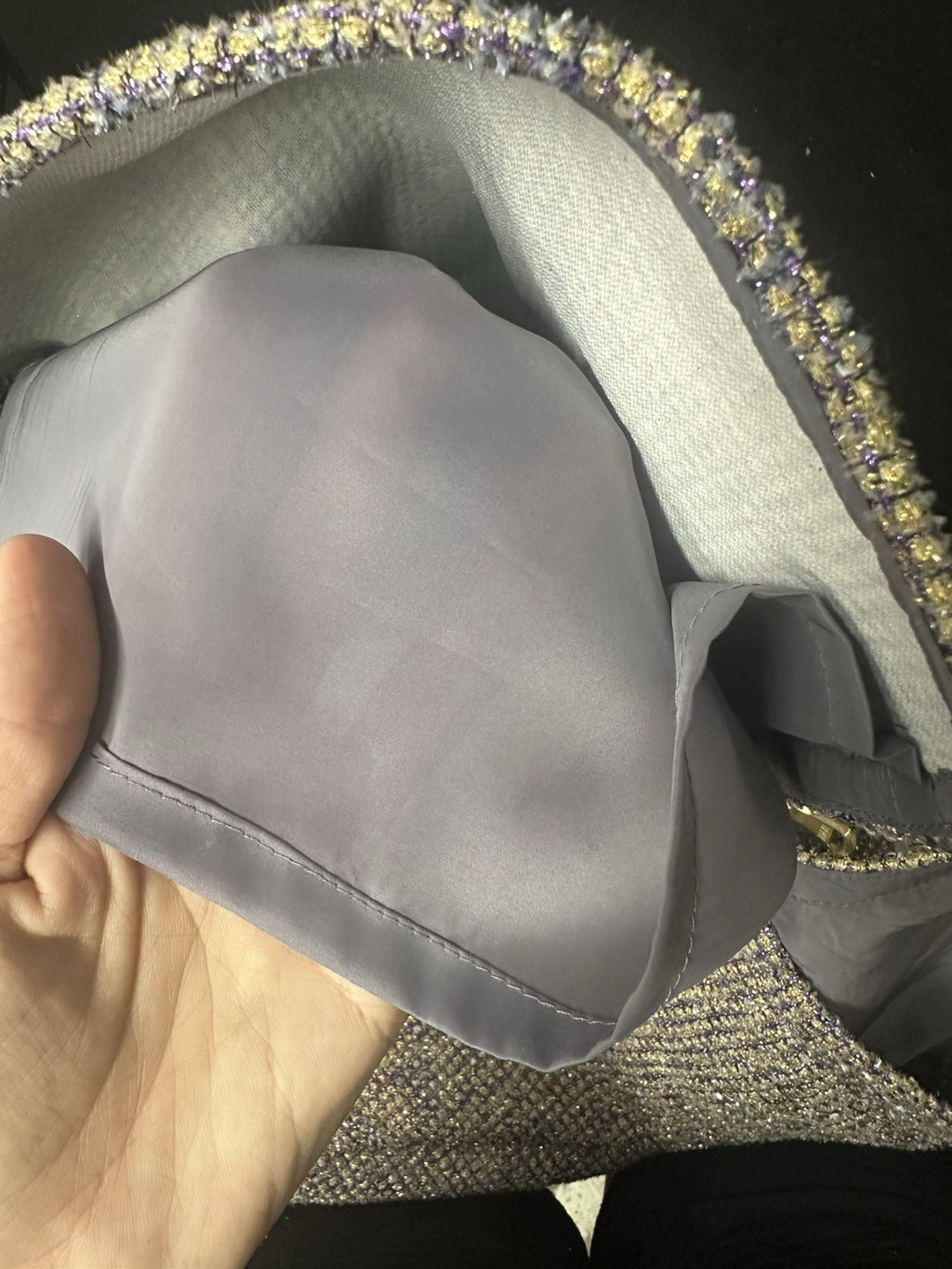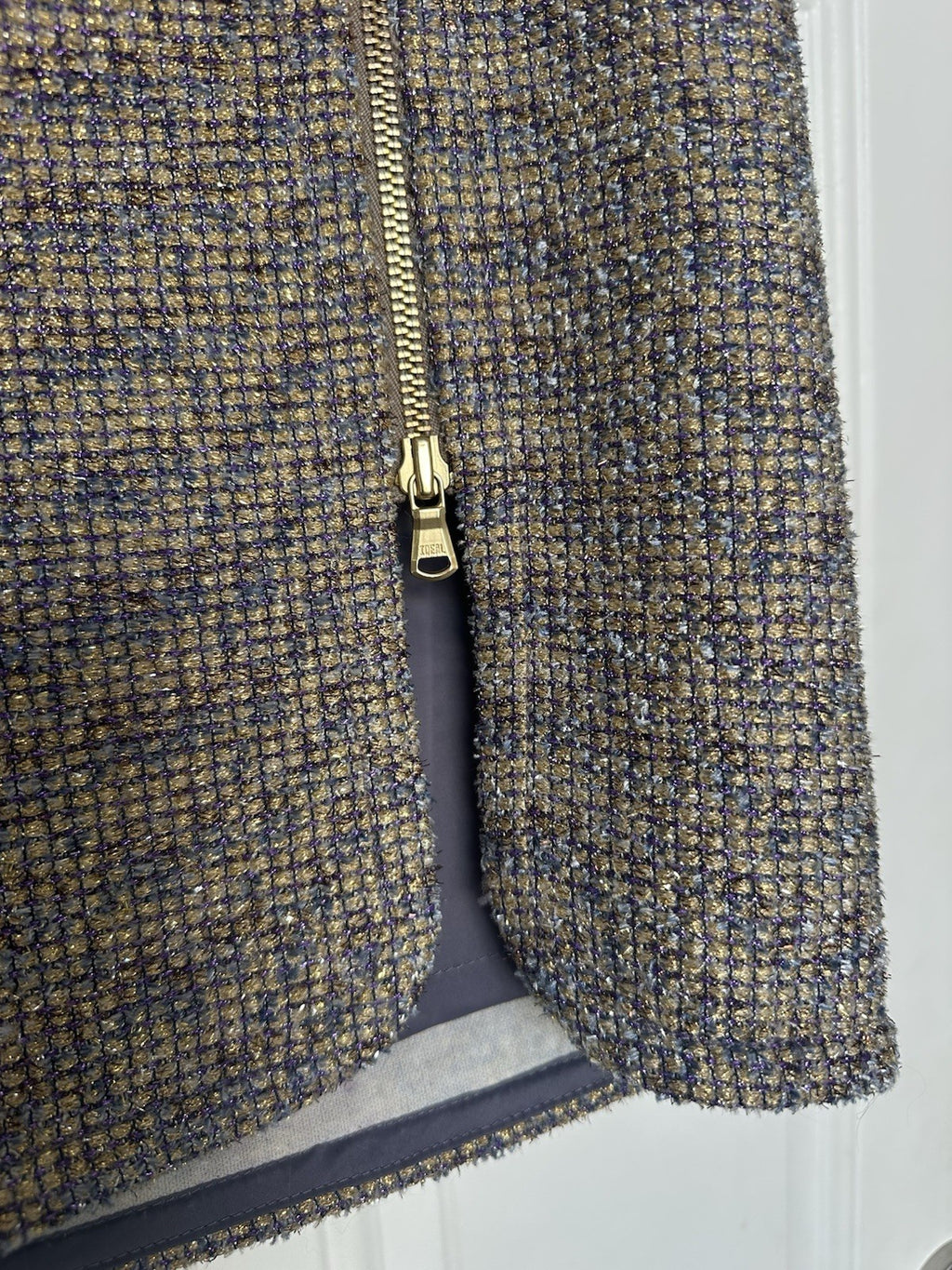 This J. Crew purple and gold check pencil skirt in size 6 features a full side front zipper closure, making it perfect for casual, formal, or business occasions. Made from polyester twill fabric, this knee-length skirt has a high rise and a straight and pencil style. It is designed with accents like a zipper and a theme of American city preppy style, suitable for wearing in summer, fall, and spring seasons. Perfect for women who appreciate quality and a sophisticated look.