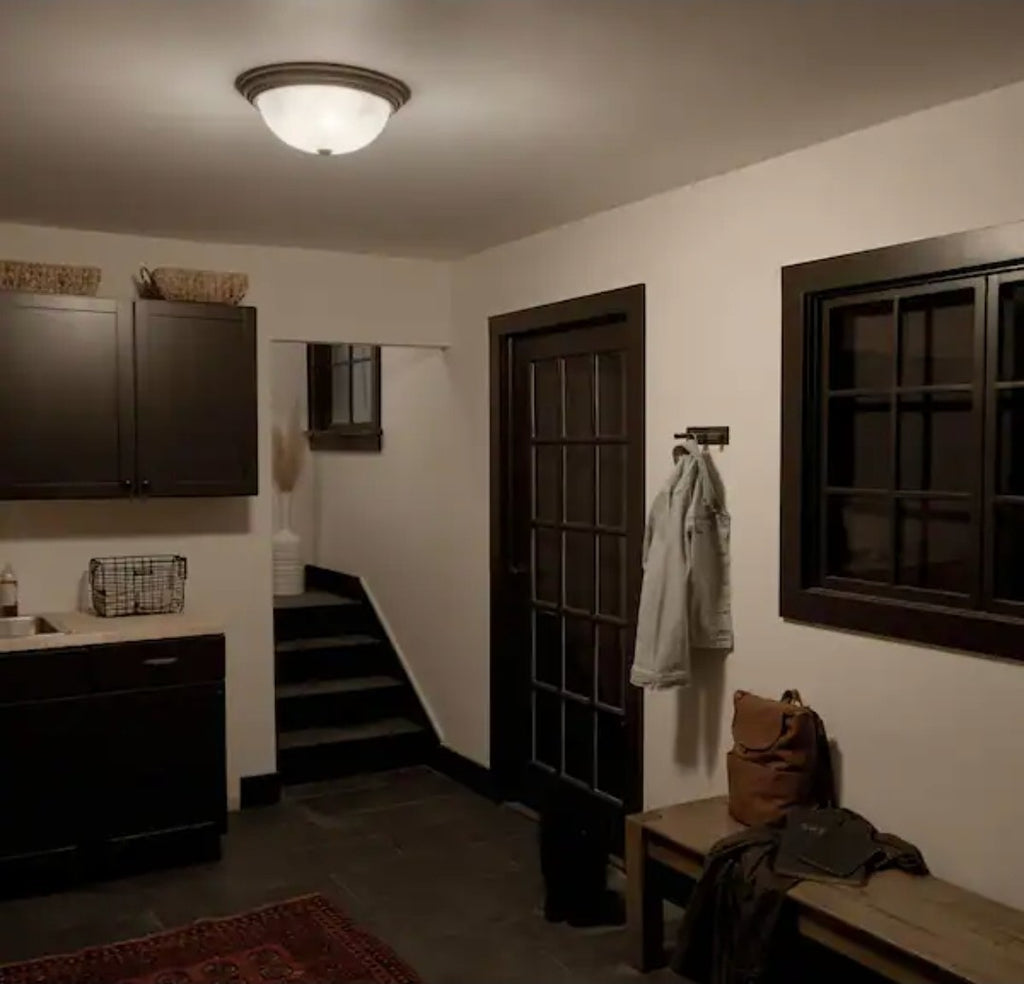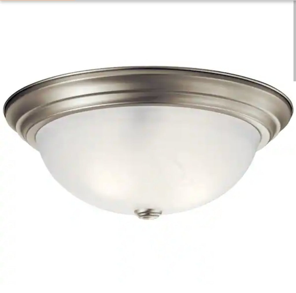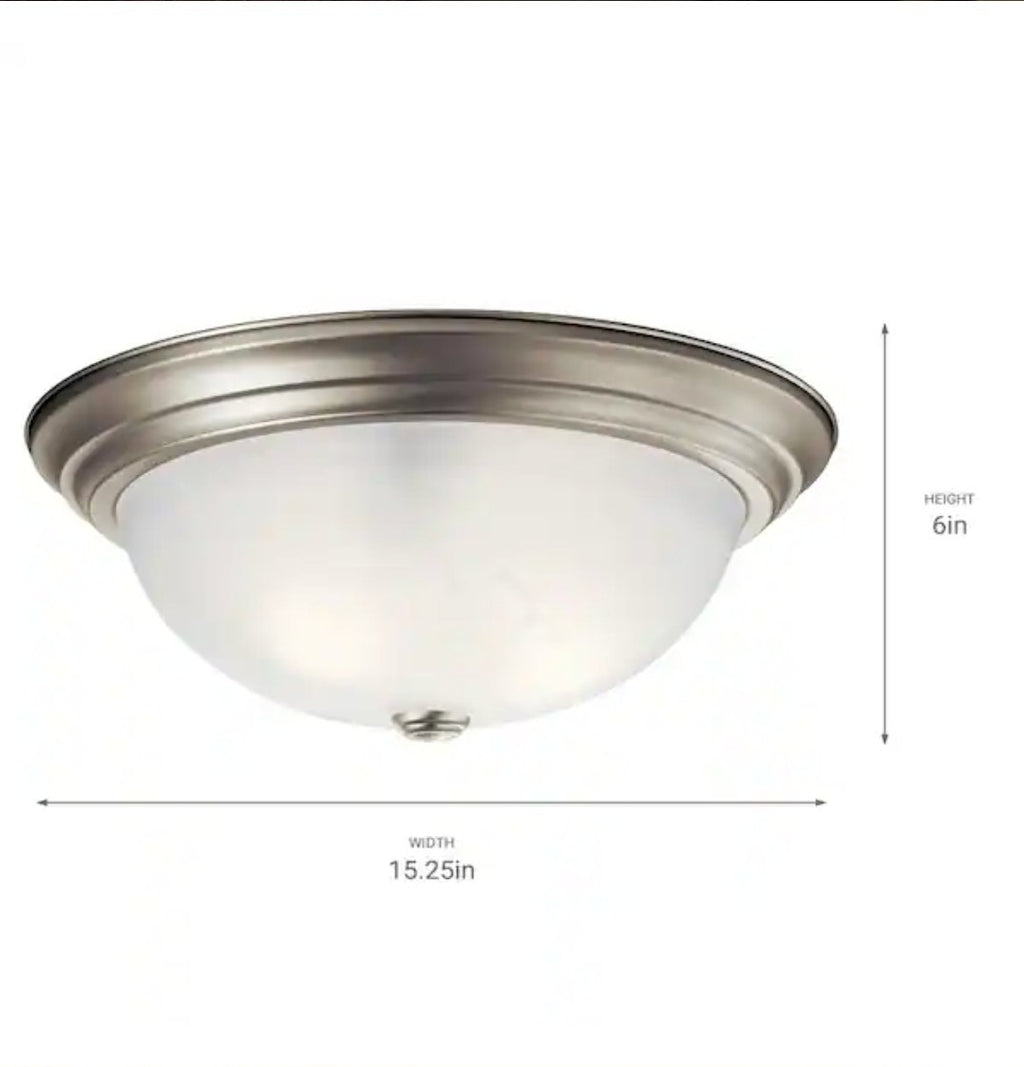 The KICHLER 15.25 in. 3-Light Brushed Nickel Flush Mount Light with Stained Glass is a classic and traditional style ceiling fixture suitable for residential indoor spaces. This dome-shaped fixture features a brushed nickel finish with etched glass shades in a white color family. It requires three 60W incandescent bulbs and has a dimmable capability for customizable lighting intensity. With a voltage of line voltage and a damp/wet rating of both damp and dry, this flush mount lighting adds a touch of elegance to any room with its timeless design and quality craftsmanship.