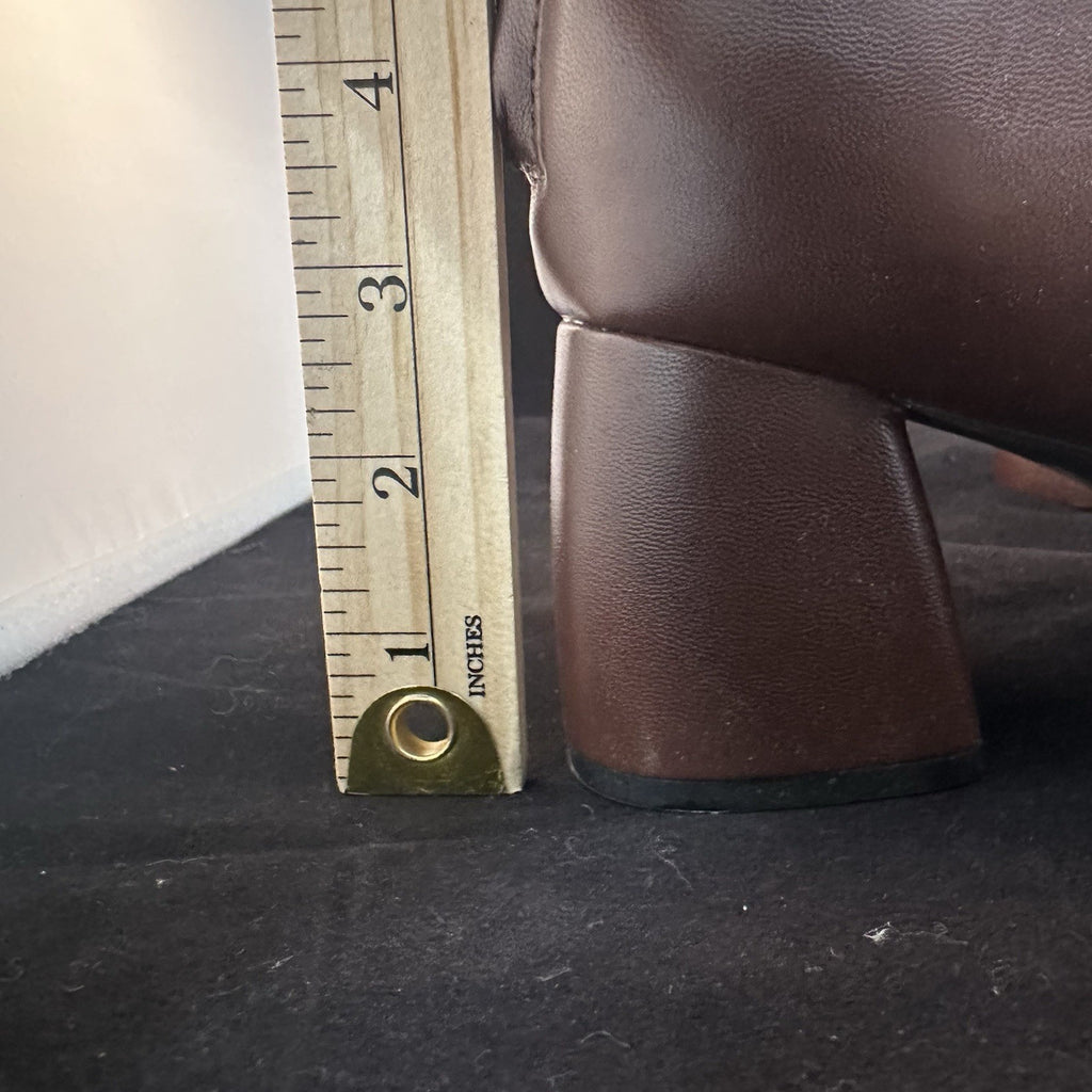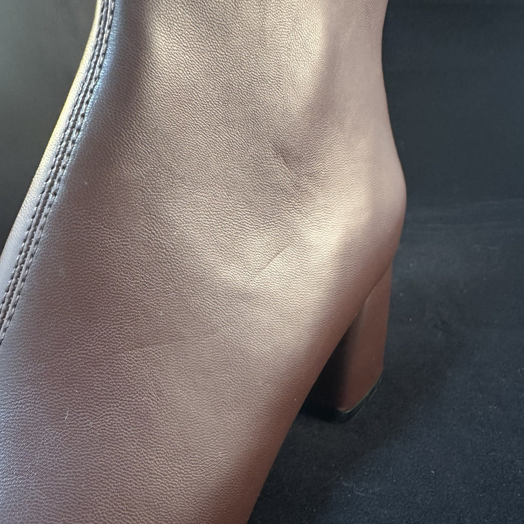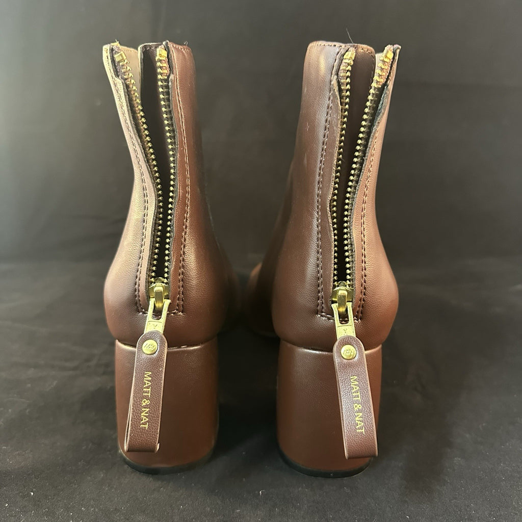The product is a stylish and versatile Matt & Nat Women’s Deena Chocolate Bootie in mid-calf length with a trendy gold zipper closure. The bootie features a mid-heel height, making it comfortable for everyday wear. Perfect for all seasons, this brown bootie with metal accents is a fashionable choice for any woman looking to add a touch of sophistication to her wardrobe.