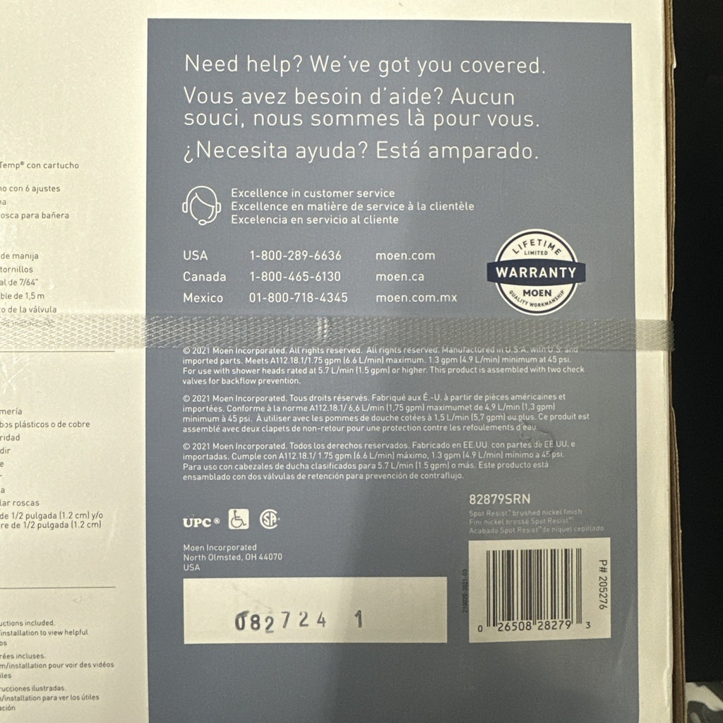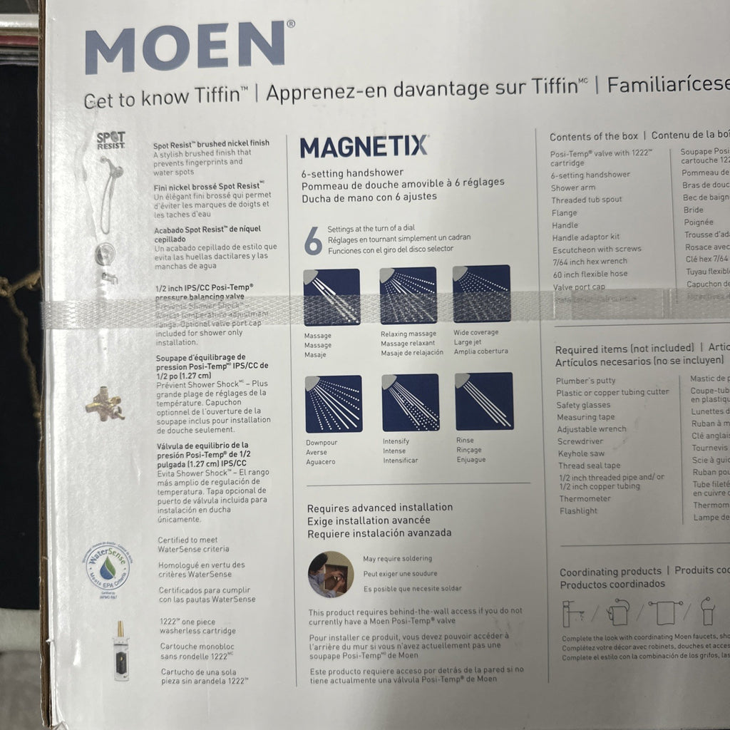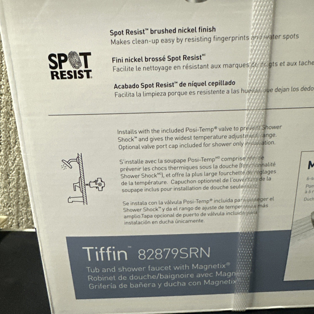 The Moen 82879SRN Tiffin Tub and Shower Trim and Valve Package in Brushed Nickel is a modern and stylish addition to any bathroom. This package includes a trim set, detachable shower head, tub spout, and valve, all designed for easy installation. The package features a round shower head with adjustable spray patterns and a lever handle for convenient use. With water conservation features like a flow rate of 1.75GPM and quick cleaning capabilities, this tub and shower package is both functional and beautiful, perfect for a steam shower or traditional shower experience.