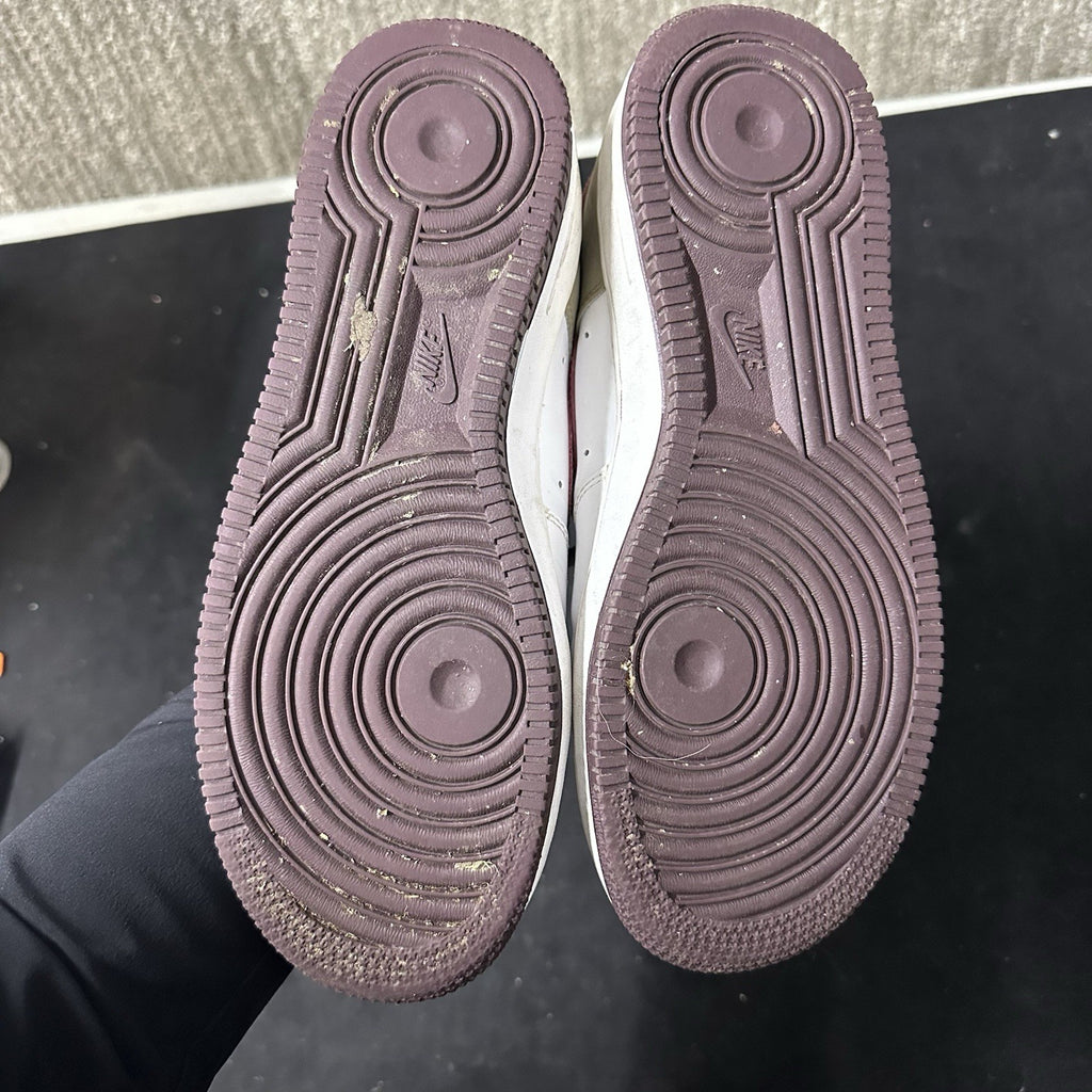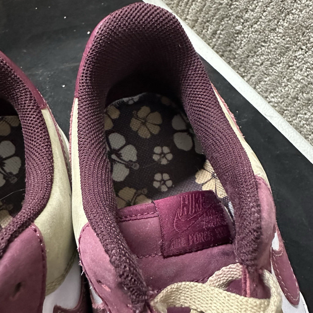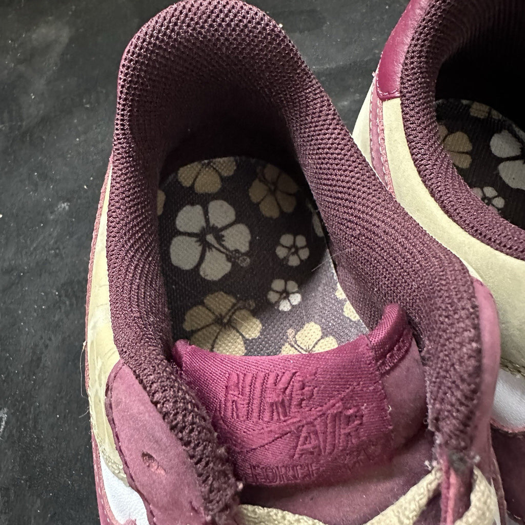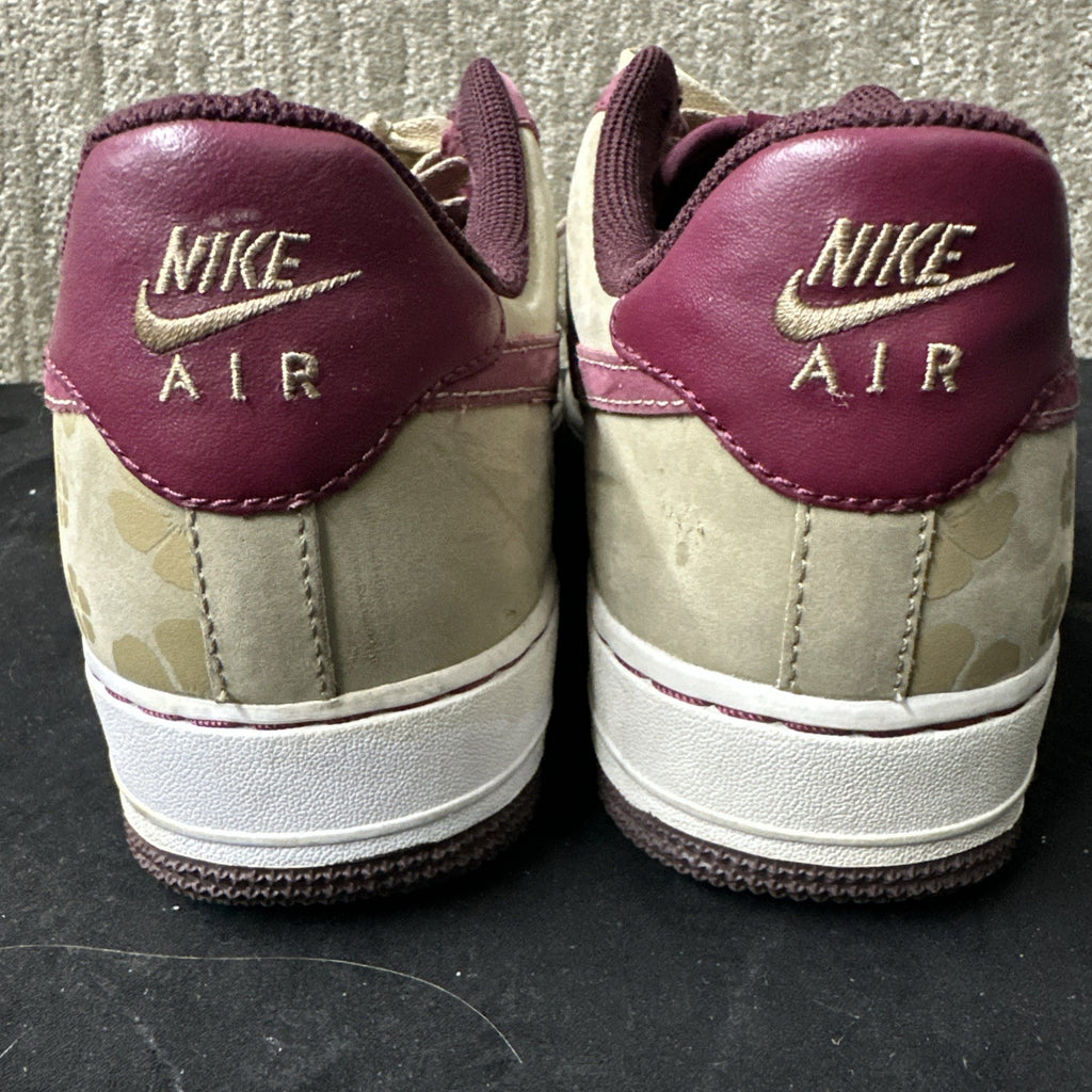 The product is a pair of Nike Air Force 1 Low sneakers for men in size 8.5, featuring a white and burgundy color scheme with a floral camo design from 2007. These vintage sneakers have a low top style with a lace-up closure, making them suitable for both activewear and casual occasions. The colorful theme and athletic design make them a versatile choice for all seasons, from winter to summer. Made by Nike, these Air Force 1s are a stylish addition to any sneaker collection.