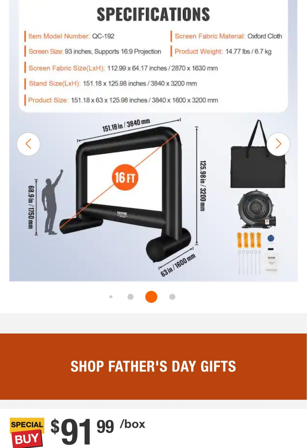 The 16 ft Projection Screen with Blower is a portable and inflatable movie screen made of durable Oxford Cloth fabric. With dimensions of 112.99 x 64.17 inches, it is suitable for a 16:9 aspect ratio projector. The black screen comes with a stand and blower for easy setup and stability during outdoor movie nights. Its large size and high-quality material make it an ideal choice for creating a captivating viewing experience.