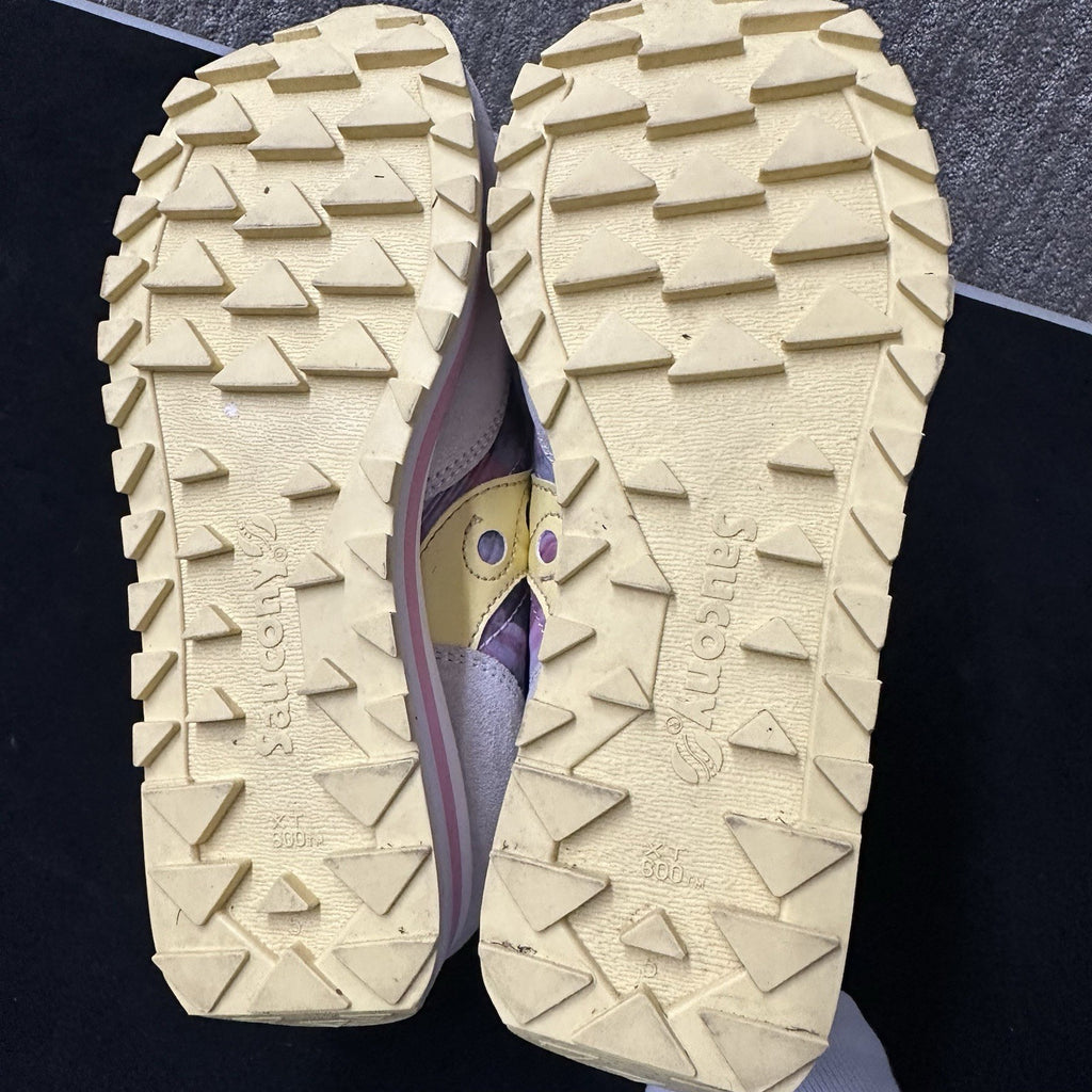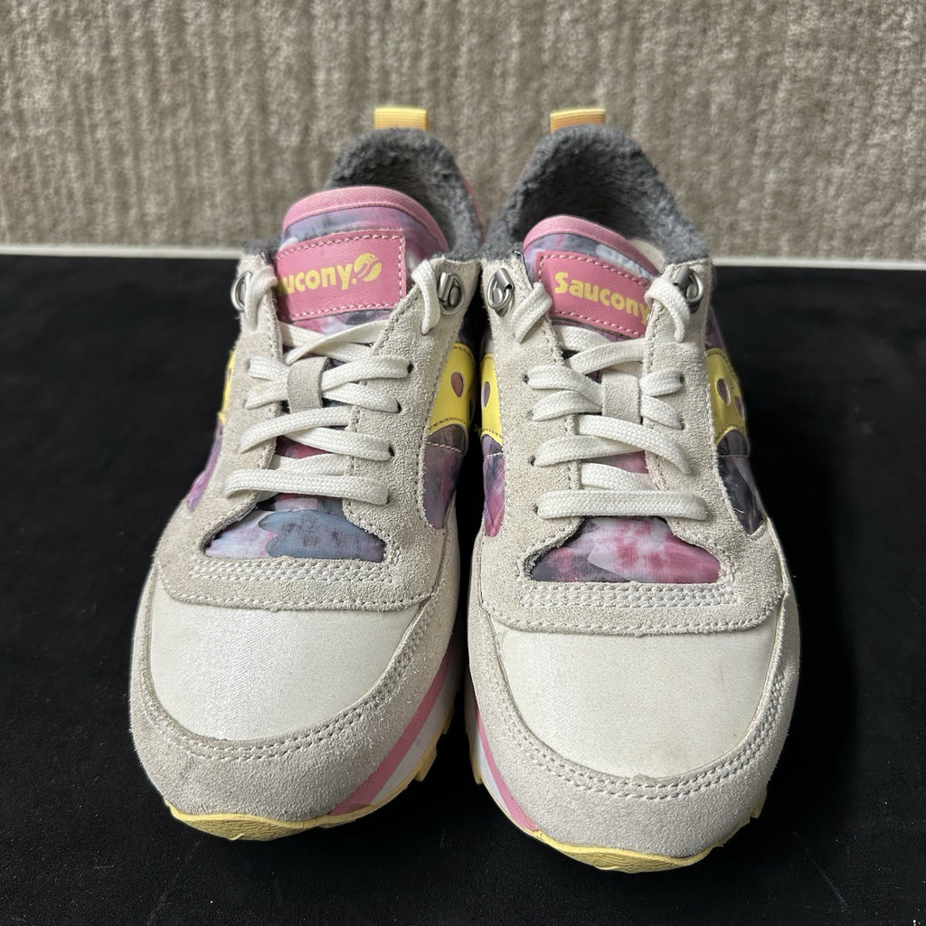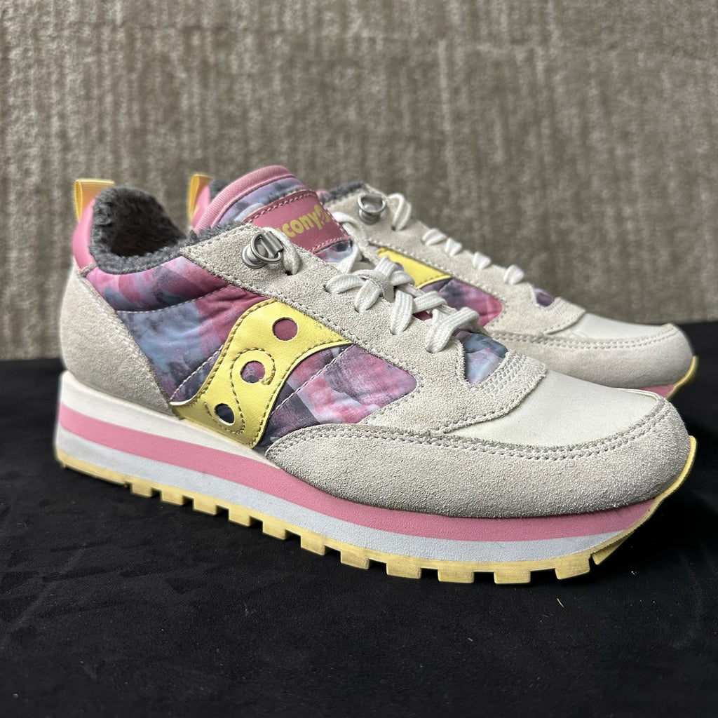 The Saucony Jazz Triple Retro Athletic Shoes Sneakers in gray, pink, and purple are a stylish and comfortable option for women size 7. Featuring a colorblock pattern, lace-up closure, and rubber outsole, these sneakers are perfect for activewear or casual occasions. With a cushioned insole and breathable fabric lining, these shoes provide comfort and support for walking, running, or jogging. The retro theme and signature Saucony Jazz model make these sneakers a trendy choice for active women.