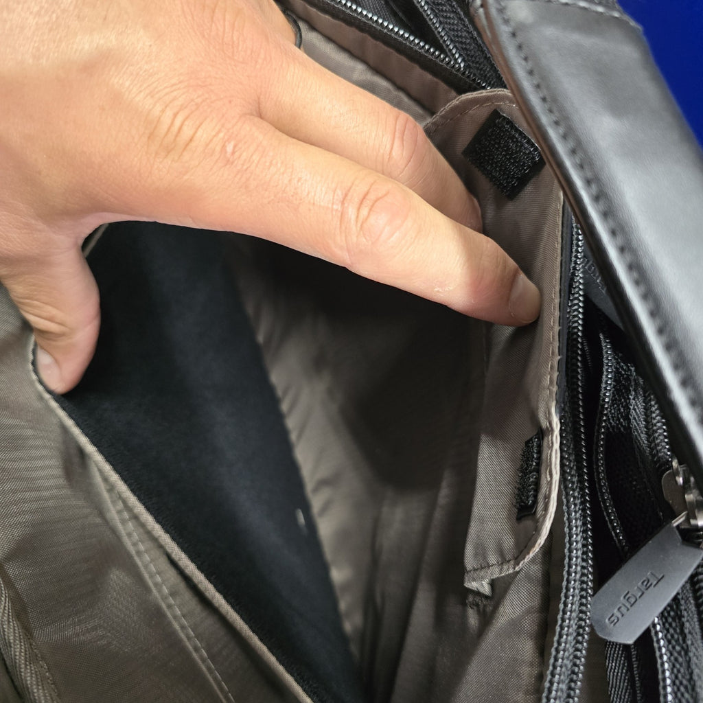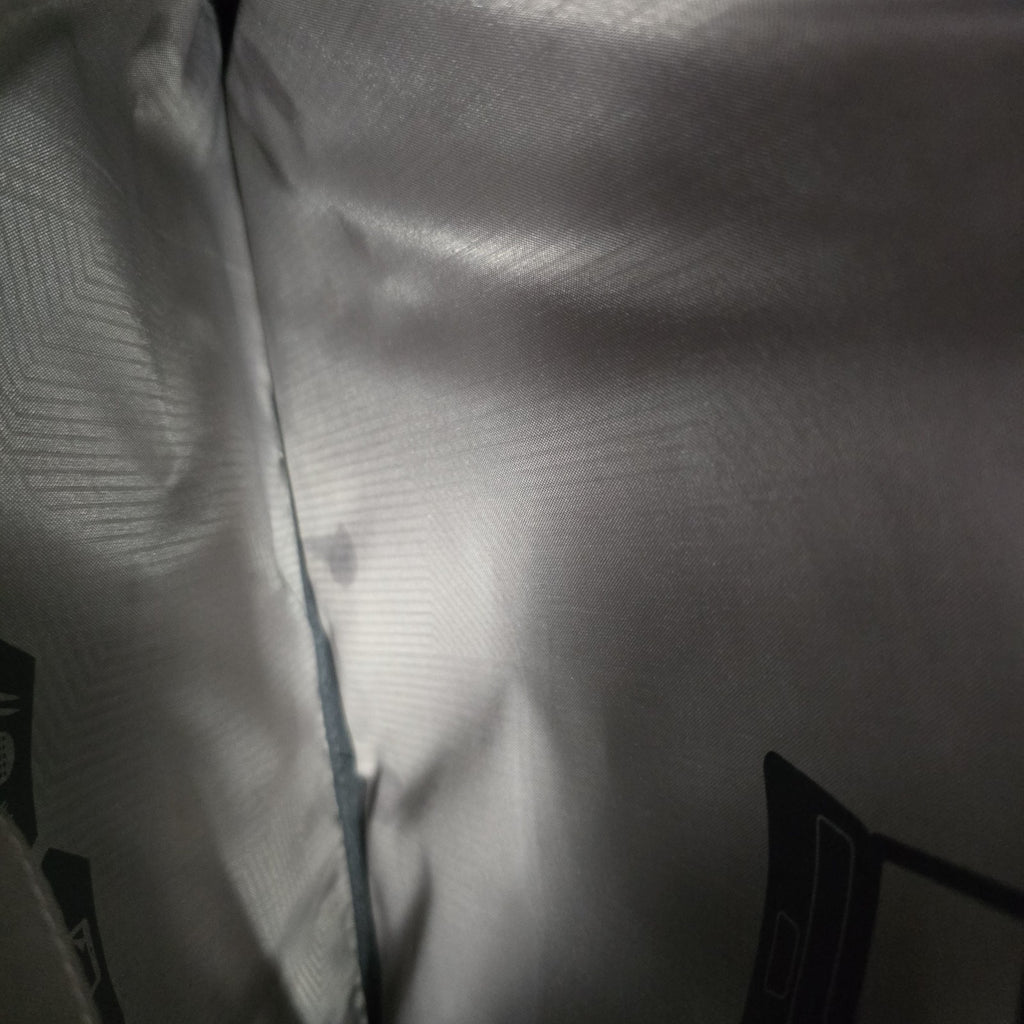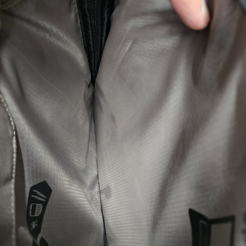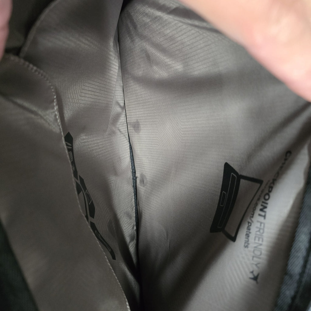 In near mint condition, but in the second largest pockets, there are several small discoloration marks.