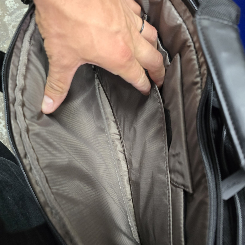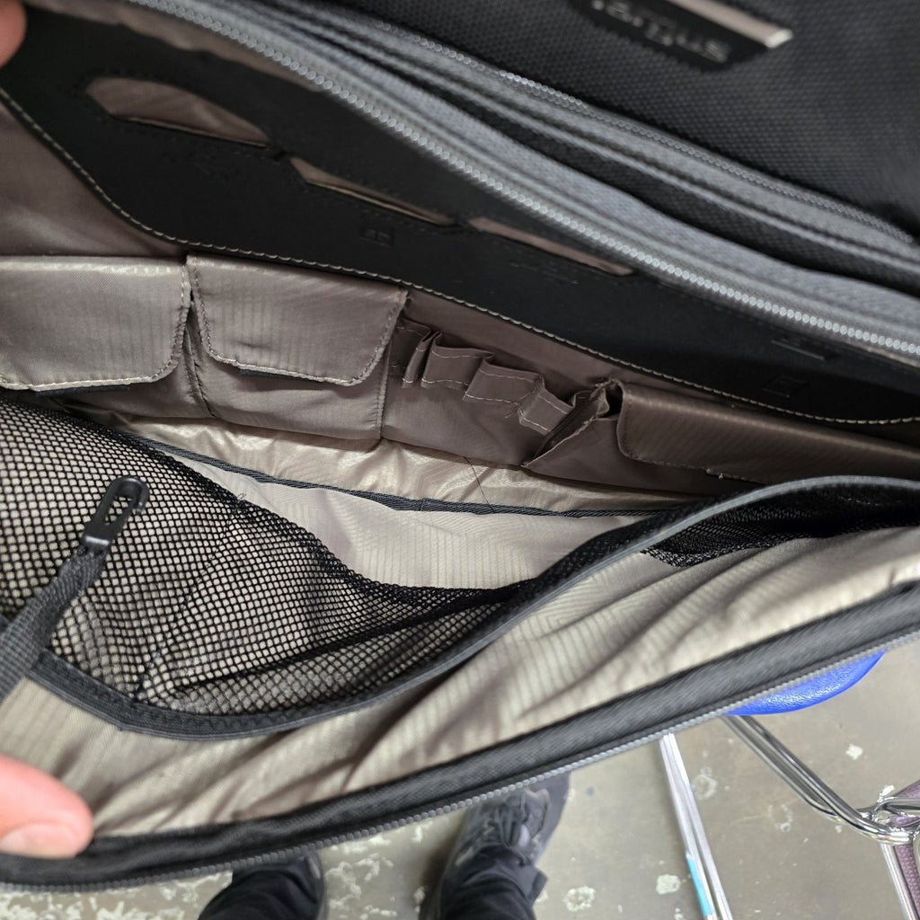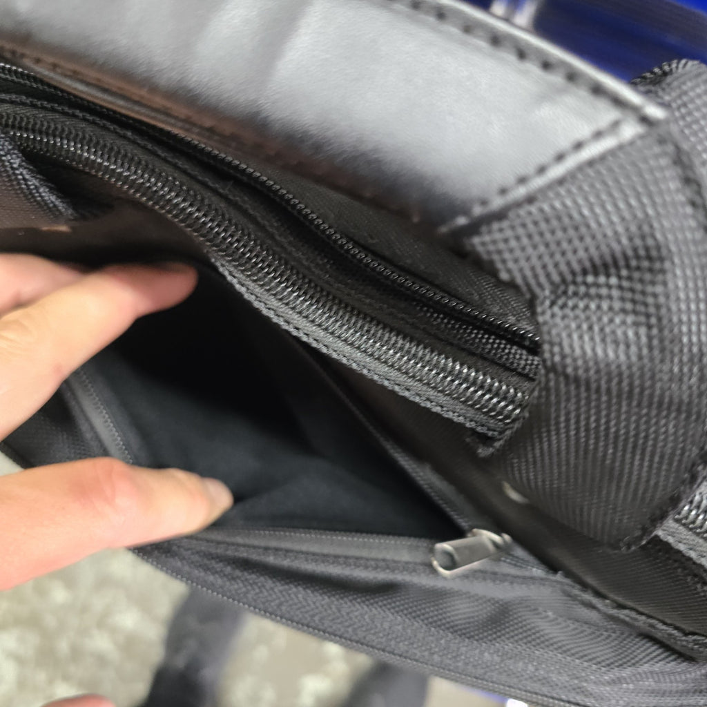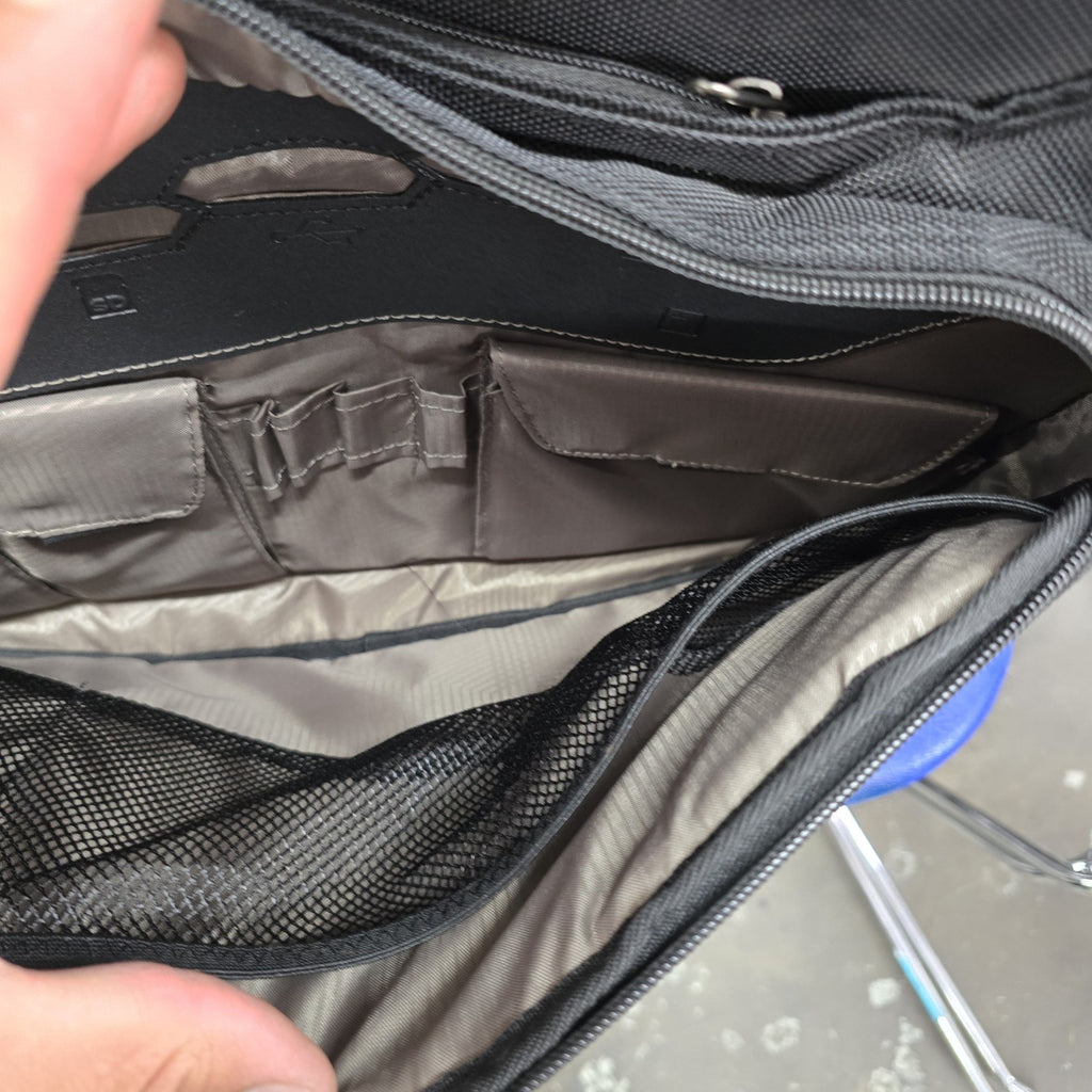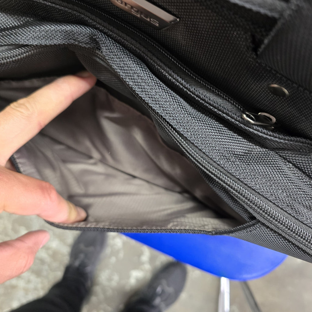 In near mint condition, but in the second largest pockets, there are several small discoloration marks.