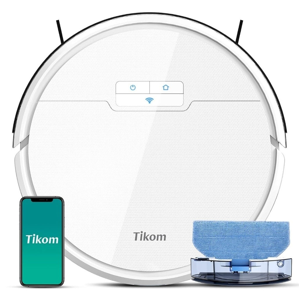 The Tikom Robot Vacuum and Mop G8000 Robot Vacuum Cleaner offers powerful 2700Pa strong suction for efficient cleaning. This robotic vacuum cleaner comes in a sleek white color and features a self-propelled design for easy maneuverability. With a cordless operation and a rinsable filter, this vacuum is convenient for both carpet and hard surface cleaning. The G8000 model also includes edge cleaning capabilities and a water level indicator for added convenience. Weighing 10.16 pounds, this Tikom robot vacuum is a reliable choice for maintaining a clean home.