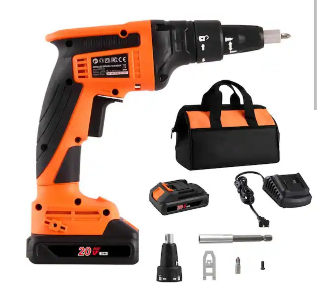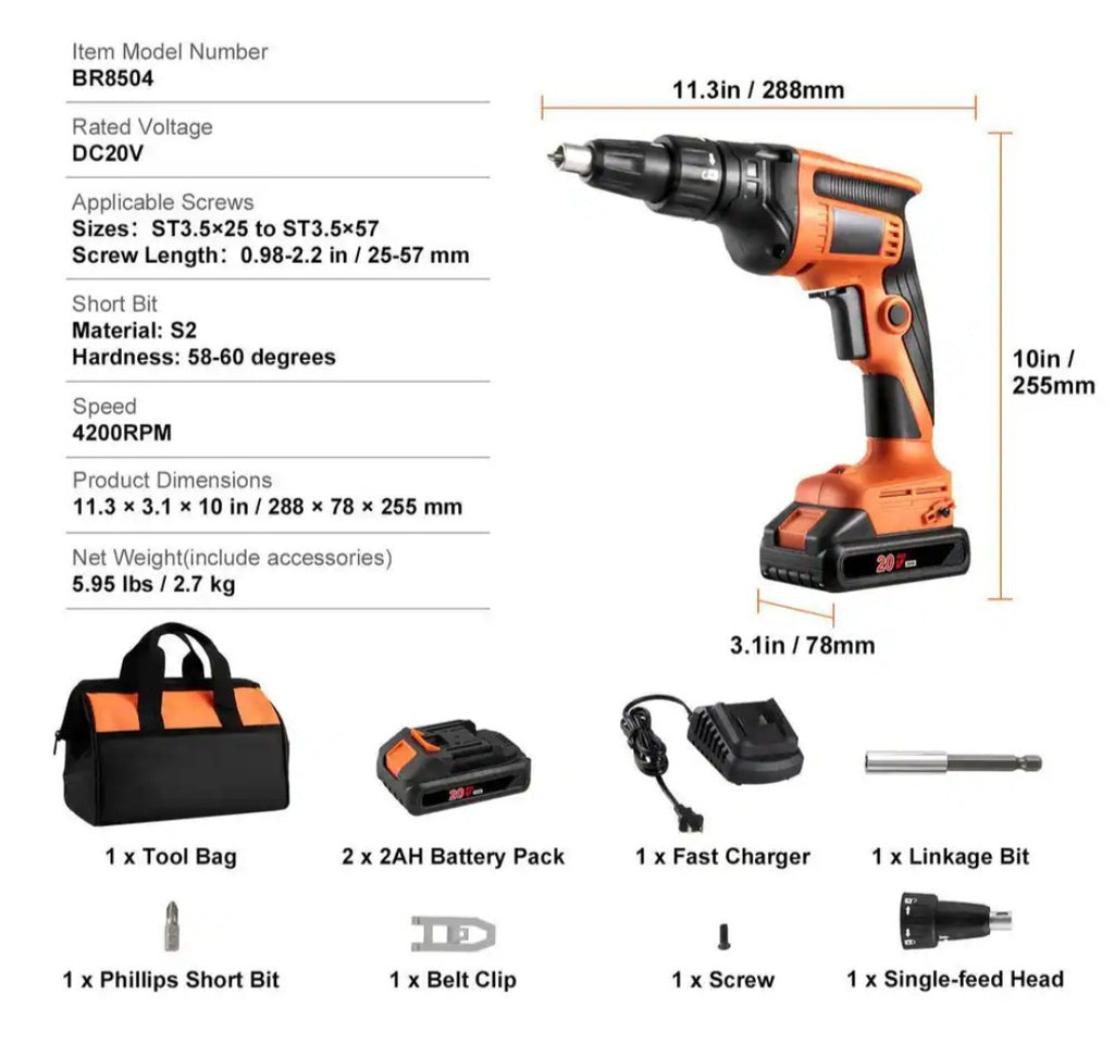 The VEVOR Drywall Screw Gun 20V Max Drywall Screwgun Kit is a powerful cordless tool with a brushless motor that delivers up to 4200RPM, making it ideal for driving screws with lengths ranging from 0.98 to 2.2 inches. The kit includes a battery and various bits in ST3.5 x 25 to ST3.5 x 57 sizes, suitable for a range of drywall screw sizes. With a net weight of 5.95 lbs, this screwgun is compact with dimensions of 11.3 x 3.1 x 10 inches, making it easy to maneuver and use for various home and garden projects requiring the drilling of screws.