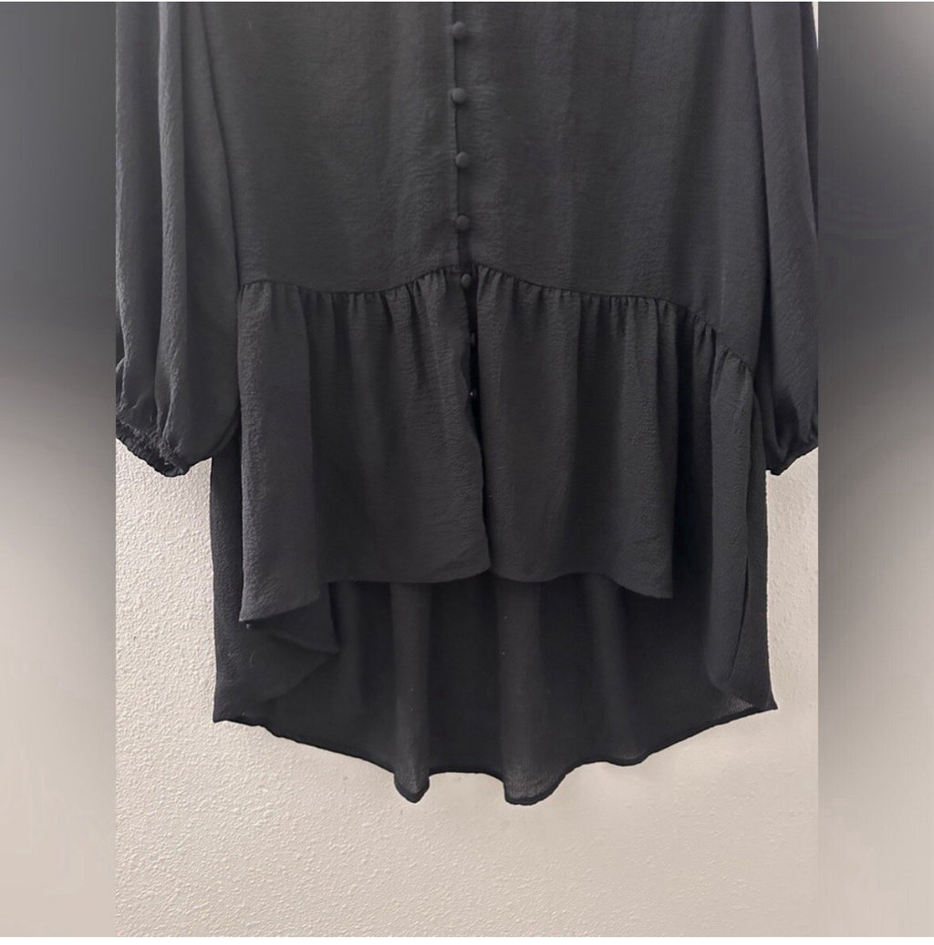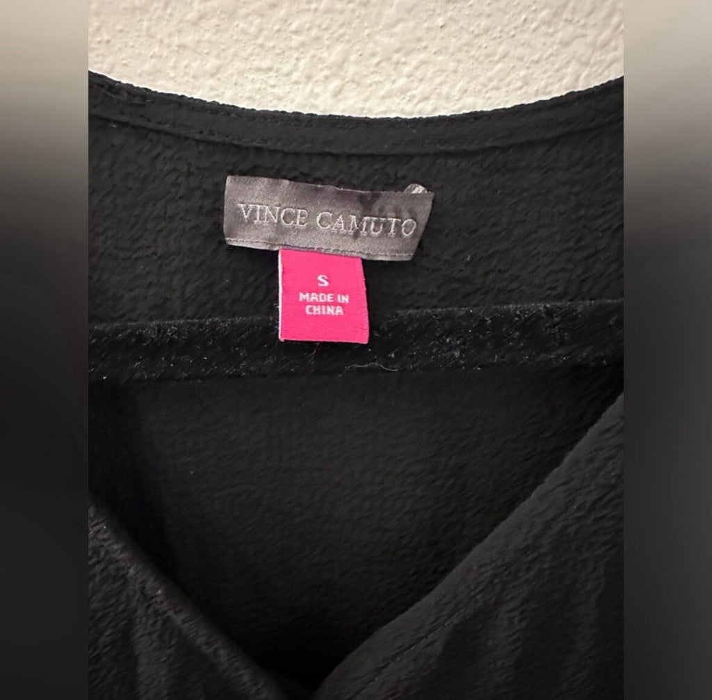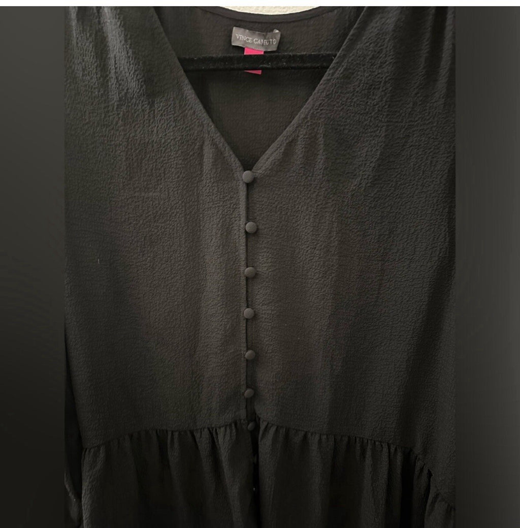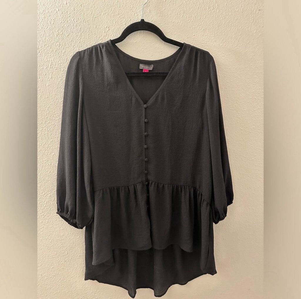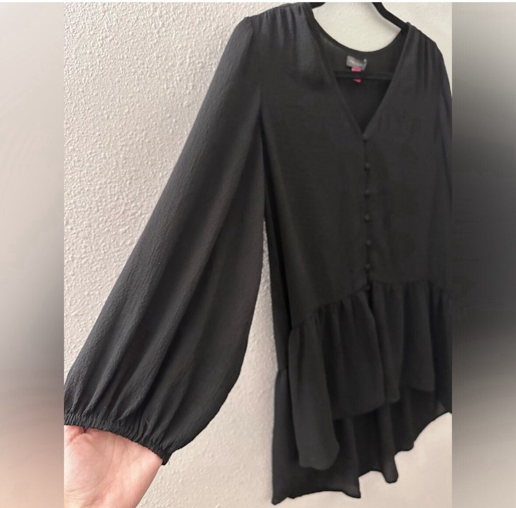 Very good condition! Vince Camuto high low top, 100% polyester, cute buttons down the middle that do work! Top is a little sheer so you can wear with or without an undershirt as it is flowy looser fit.