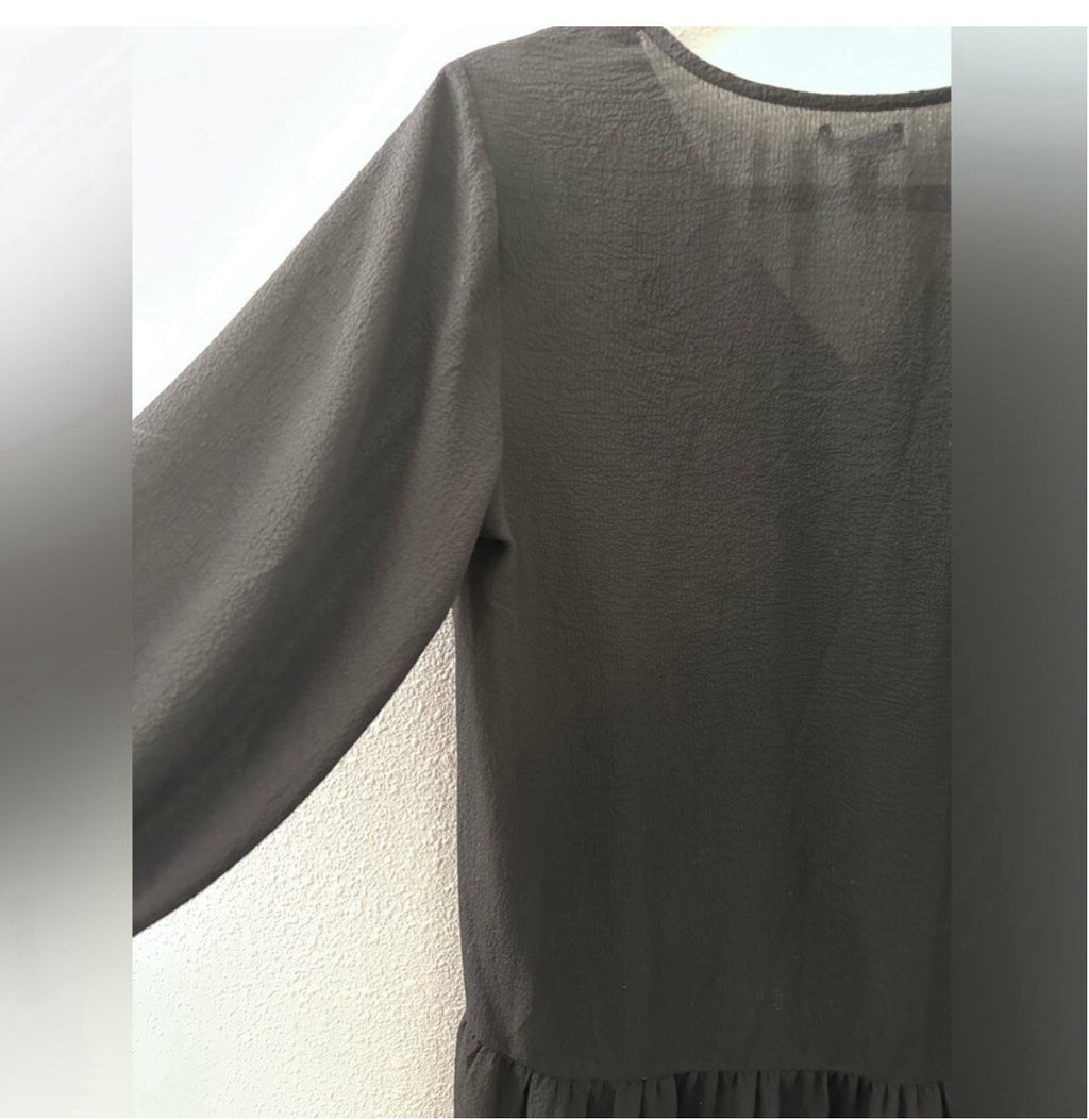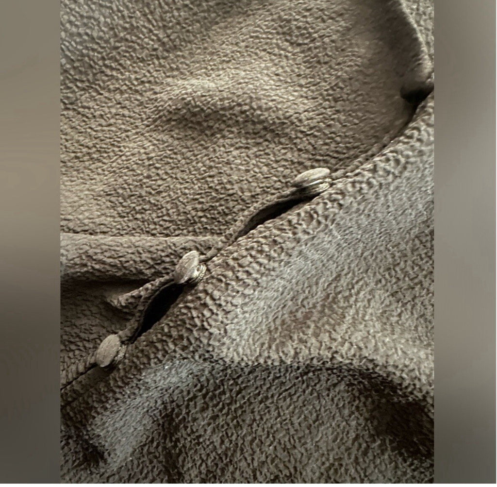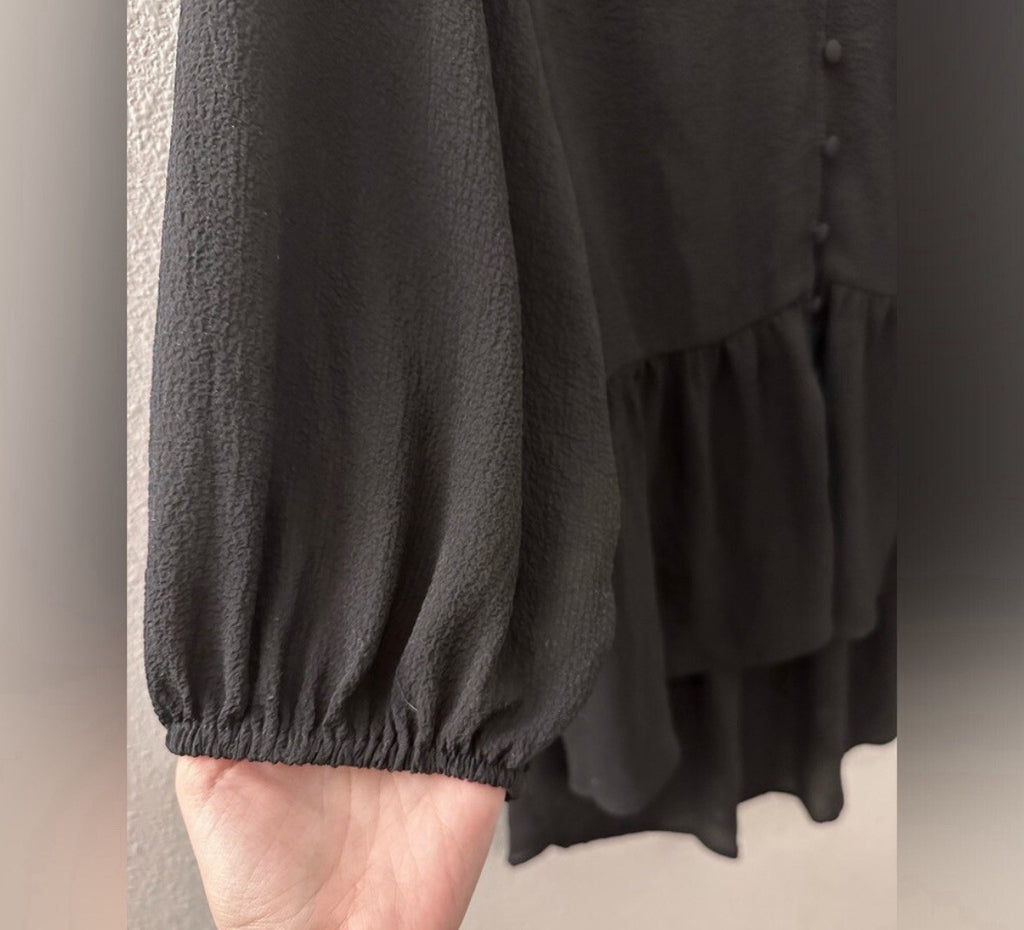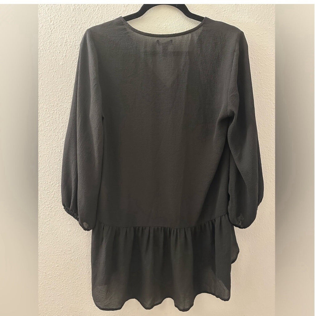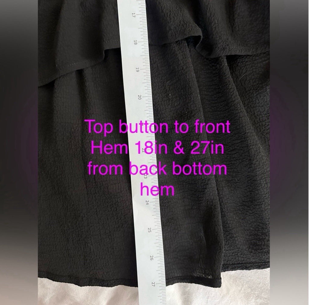 Very good condition! Vince Camuto high low top, 100% polyester, cute buttons down the middle that do work! Top is a little sheer so you can wear with or without an undershirt as it is flowy looser fit.