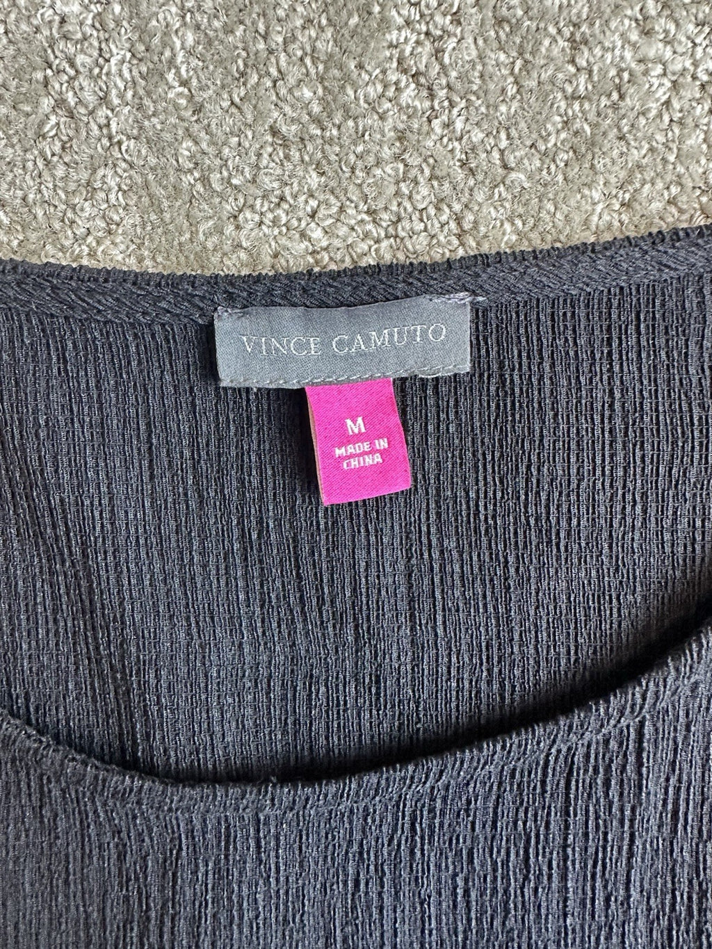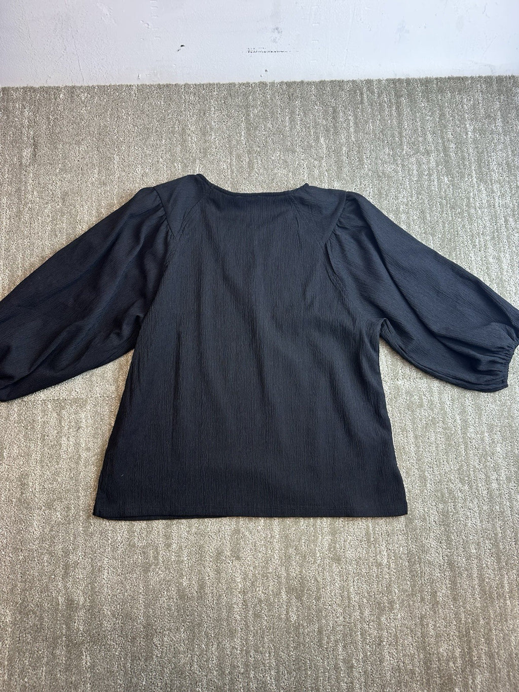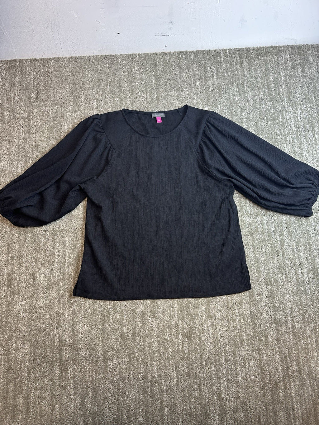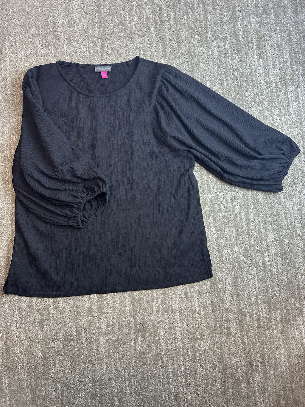 The Vince Camuto Women's Medium Black Round Neck 3/4 Sleeve Blouse is a versatile and classic piece that can be dressed up or down for any occasion. Made from chiffon fabric, this lightweight blouse features a round neckline, pullover closure, and balloon sleeves for added flair. The solid black color and relaxed fit make it a wardrobe staple for all seasons, from winter to summer. Easy to care for with machine washable instructions, this blouse from the Vince Camuto brand is a timeless addition to any woman's closet.
