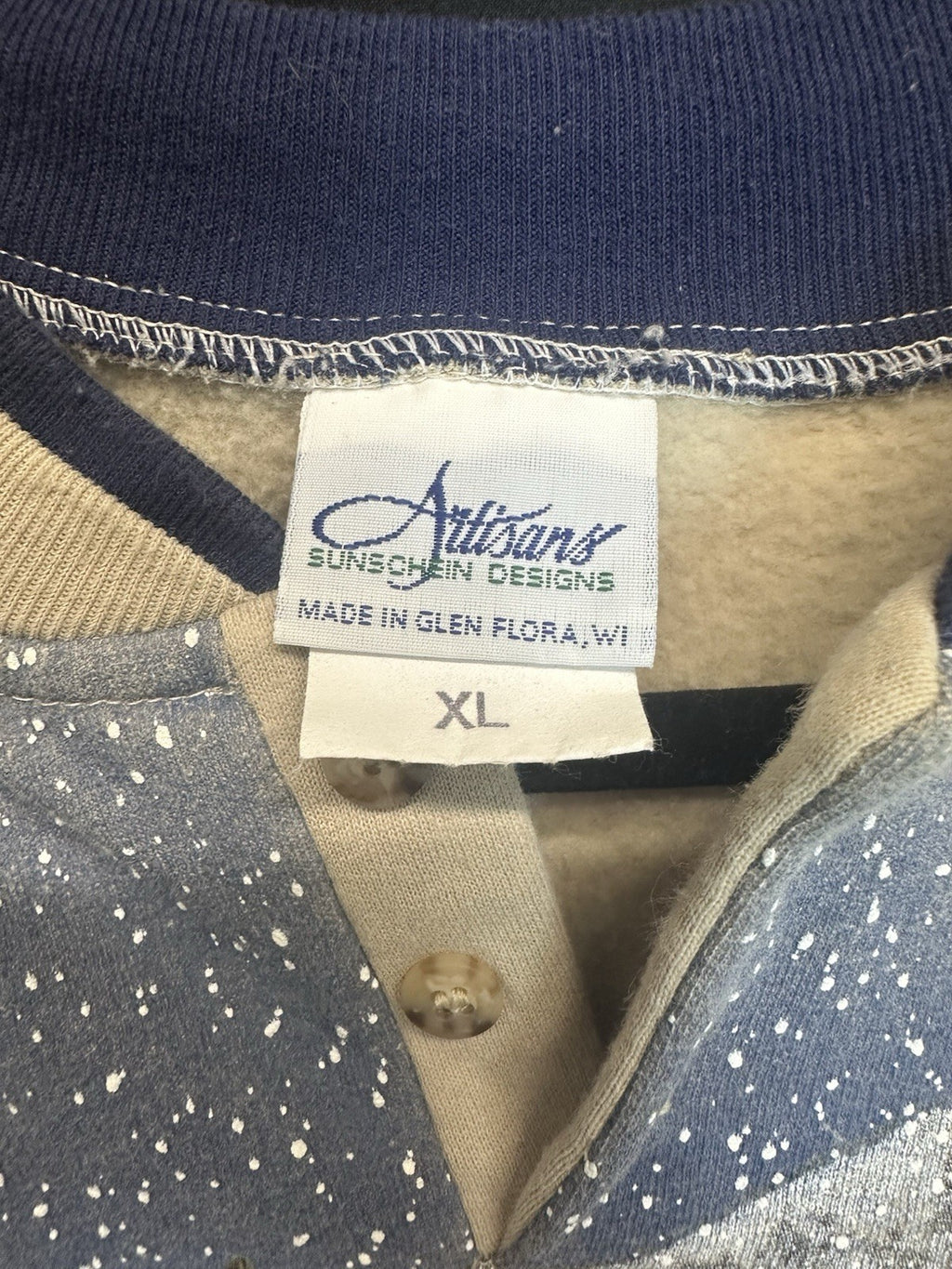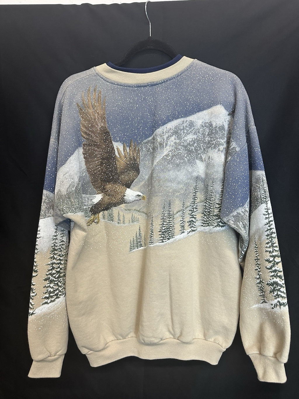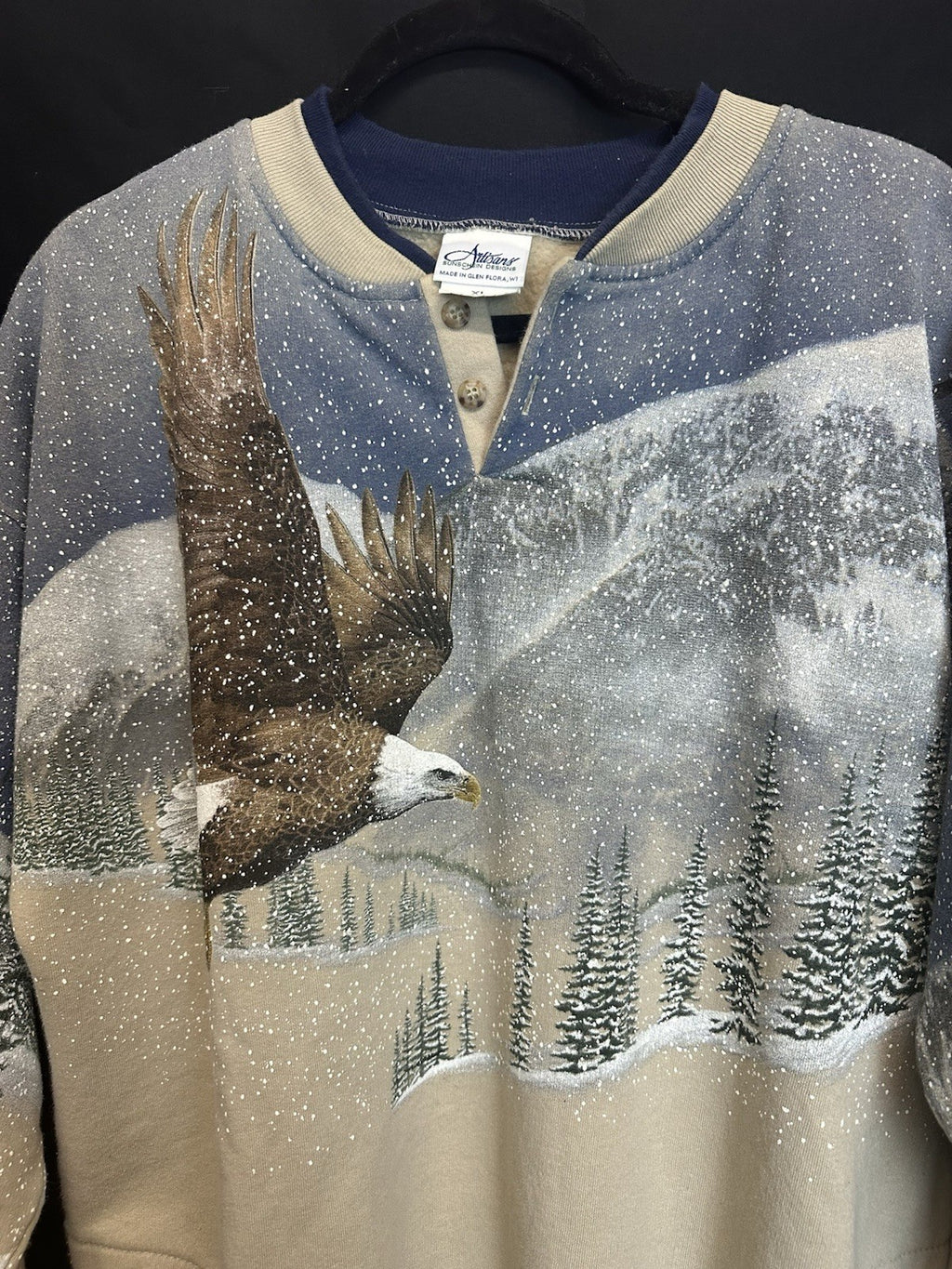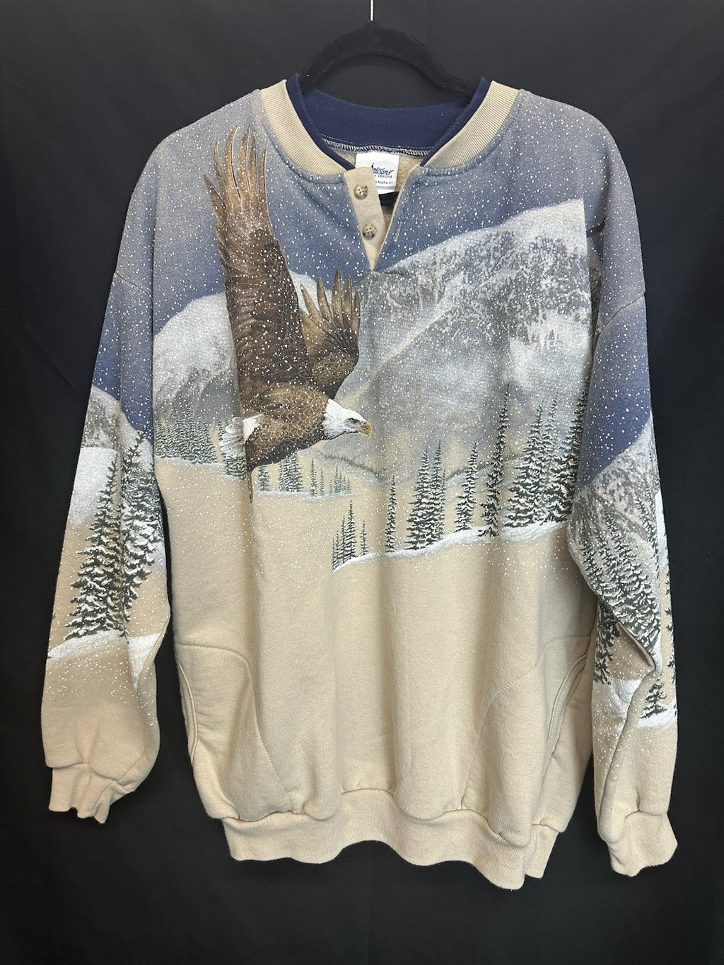 This Vintage 90's Bald Eagle Nature Animal Art Henley Sweatshirt in XL size is a unique and stylish piece made in the USA. The sweatshirt features a crew neck, long sleeves, and a button closure, perfect for a comfortable and casual look. The multicolor design with a graphic print of a bald eagle adds a touch of nature and artistry to the classic pullover style. Ideal for any nature enthusiast or hipster looking for a retro piece with a touch of American flair.