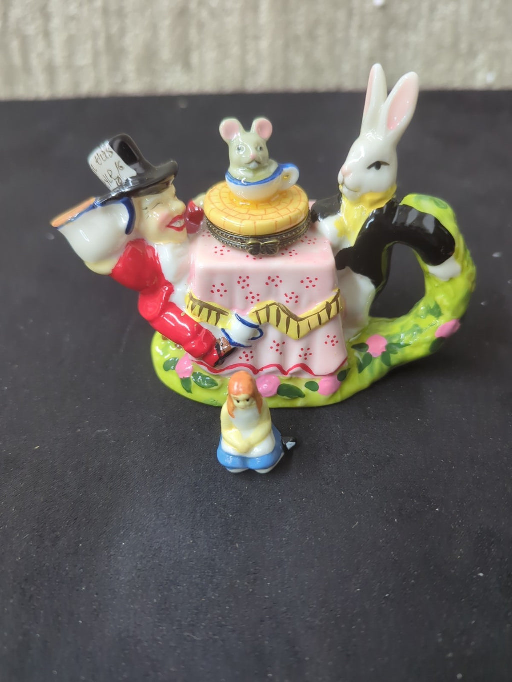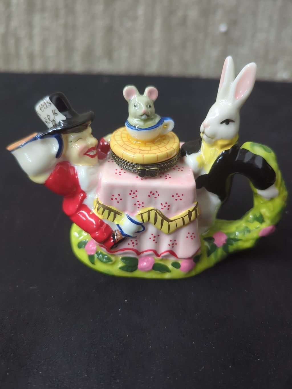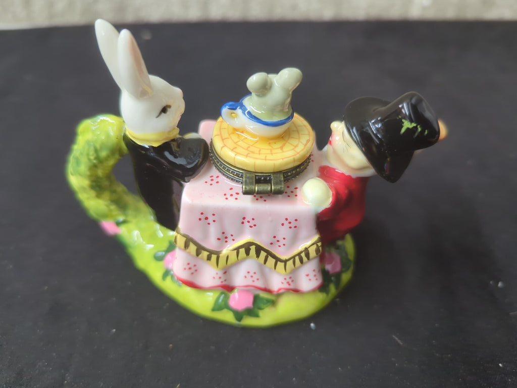 The Vintage Alice in Wonderland Mad Hatter Porcelain Trinket Box is a small, multicolor collectible piece inspired by the classic fairy tale. Featuring characters like Alice, the white rabbit, and the Mad Hatter, this boxed stash box is made of porcelain and showcases a whimsical theme. Handmade in China, this trinket box is a delicate and charming addition to any collection, perfect for fans of Alice in Wonderland and collectors of decorative items.