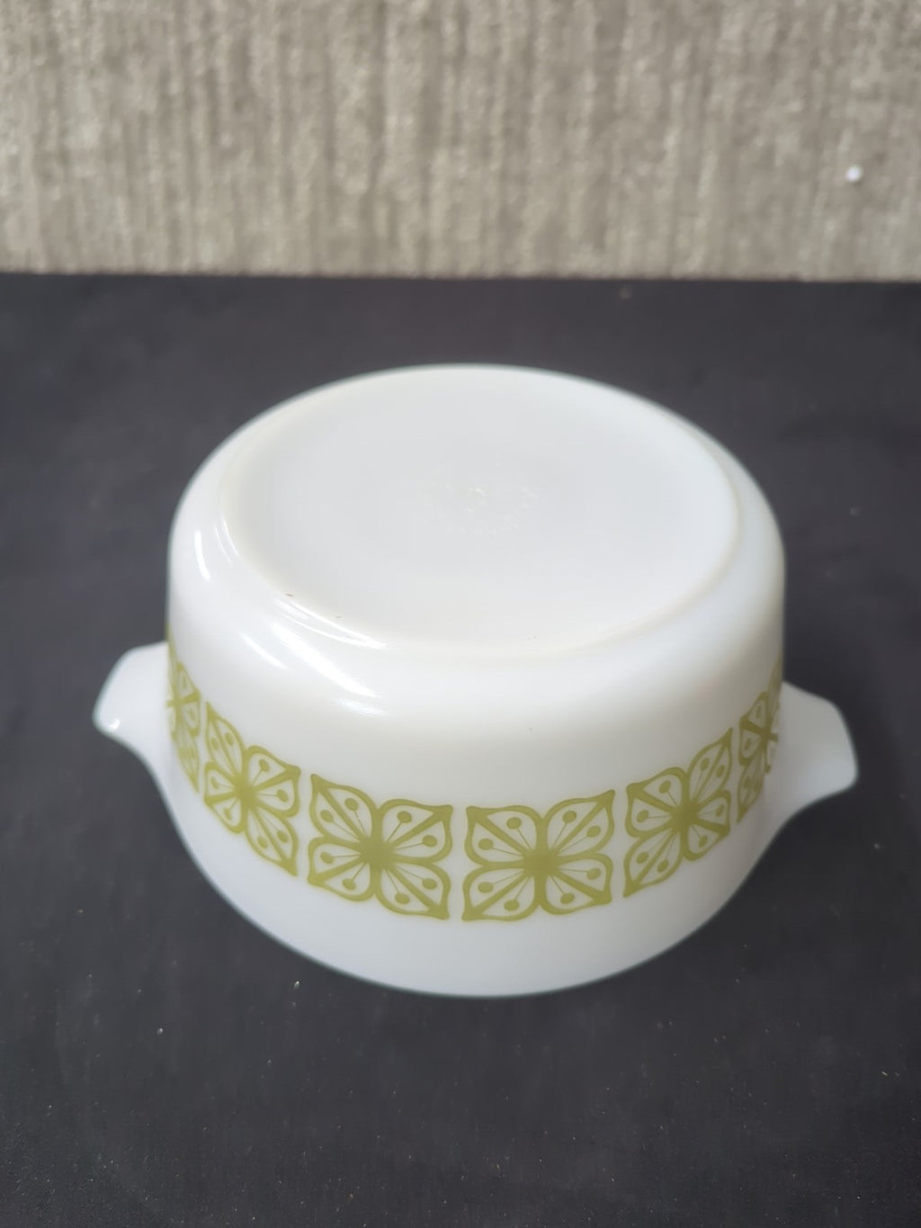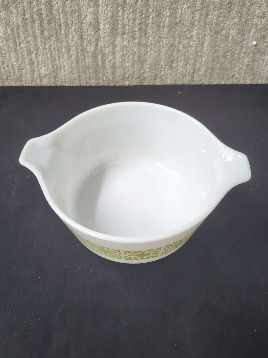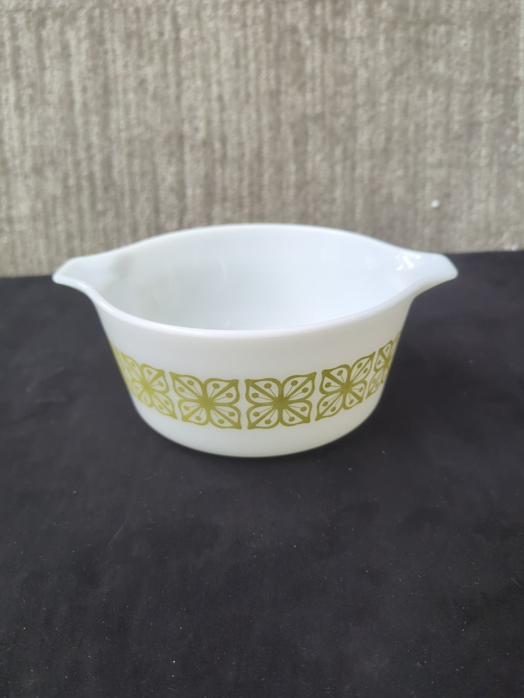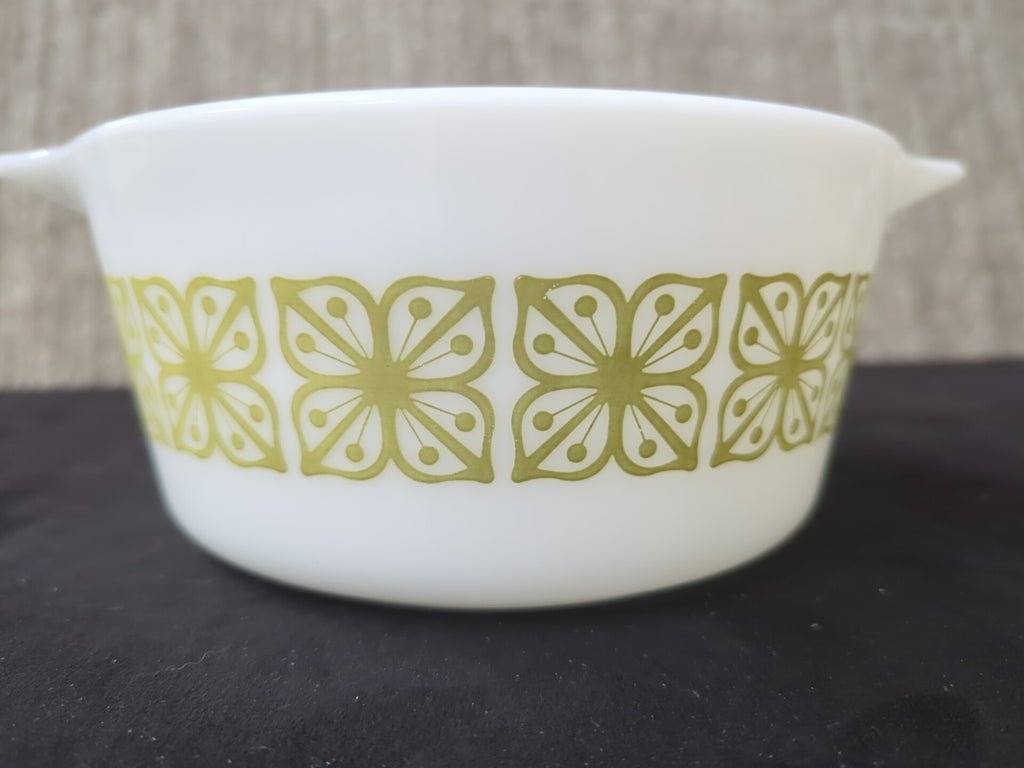 The Vintage Pyrex 474-B Verde Green Square Flowers 1.5 Qt Casserole Dish is a beautifully designed piece of mid-century modern cookware. Made in the United States in the 1970s, this round casserole dish features a vibrant green color with a charming square flower pattern. The Pyrex glass material ensures durability and safety for use in the oven, microwave, and dishwasher. With its retro style and vintage appeal, this casserole dish adds a touch of nostalgia to any kitchen collection.