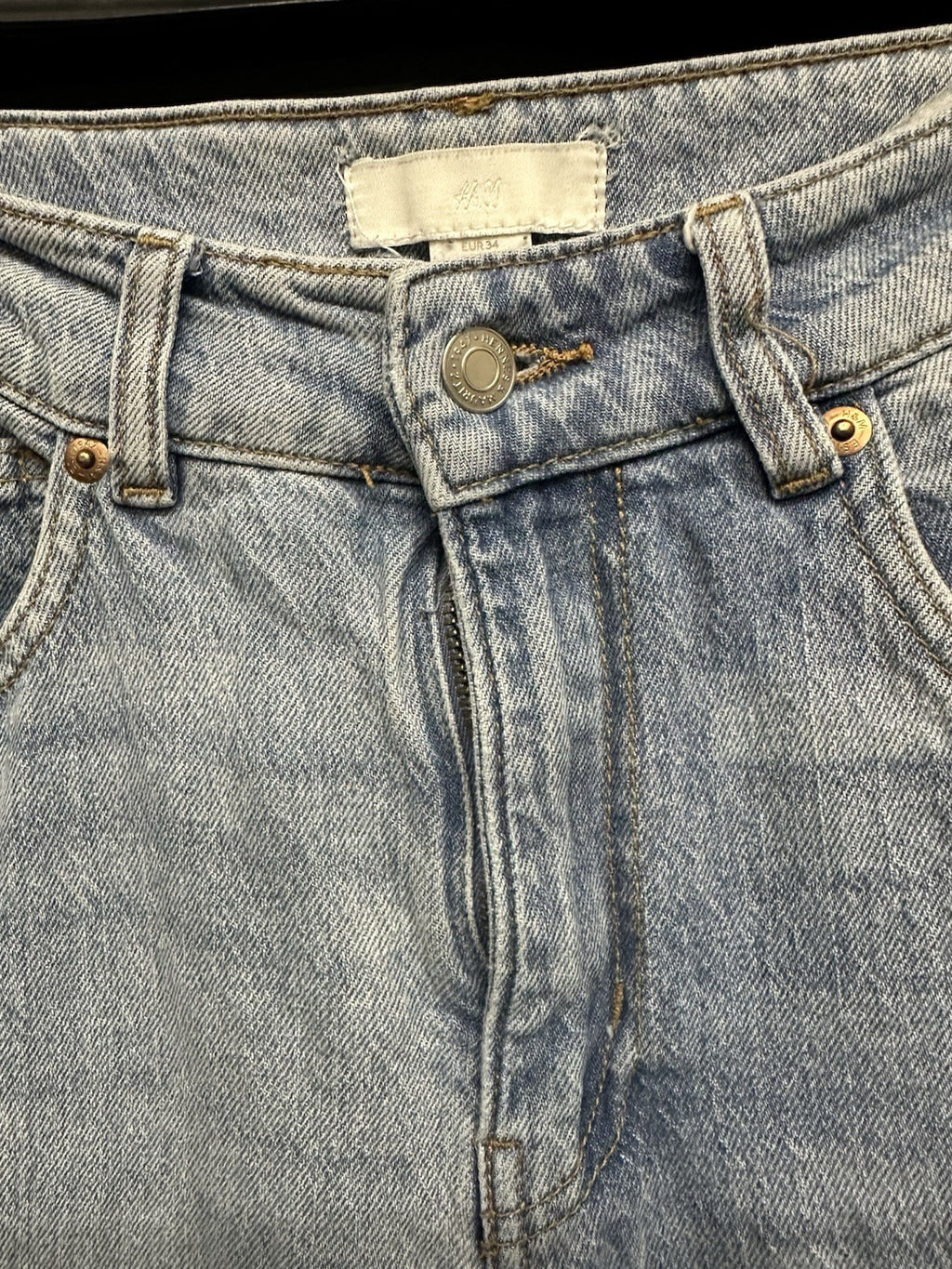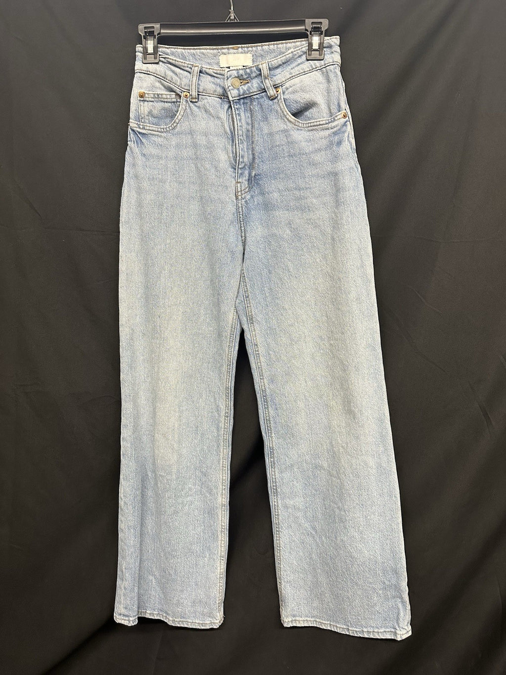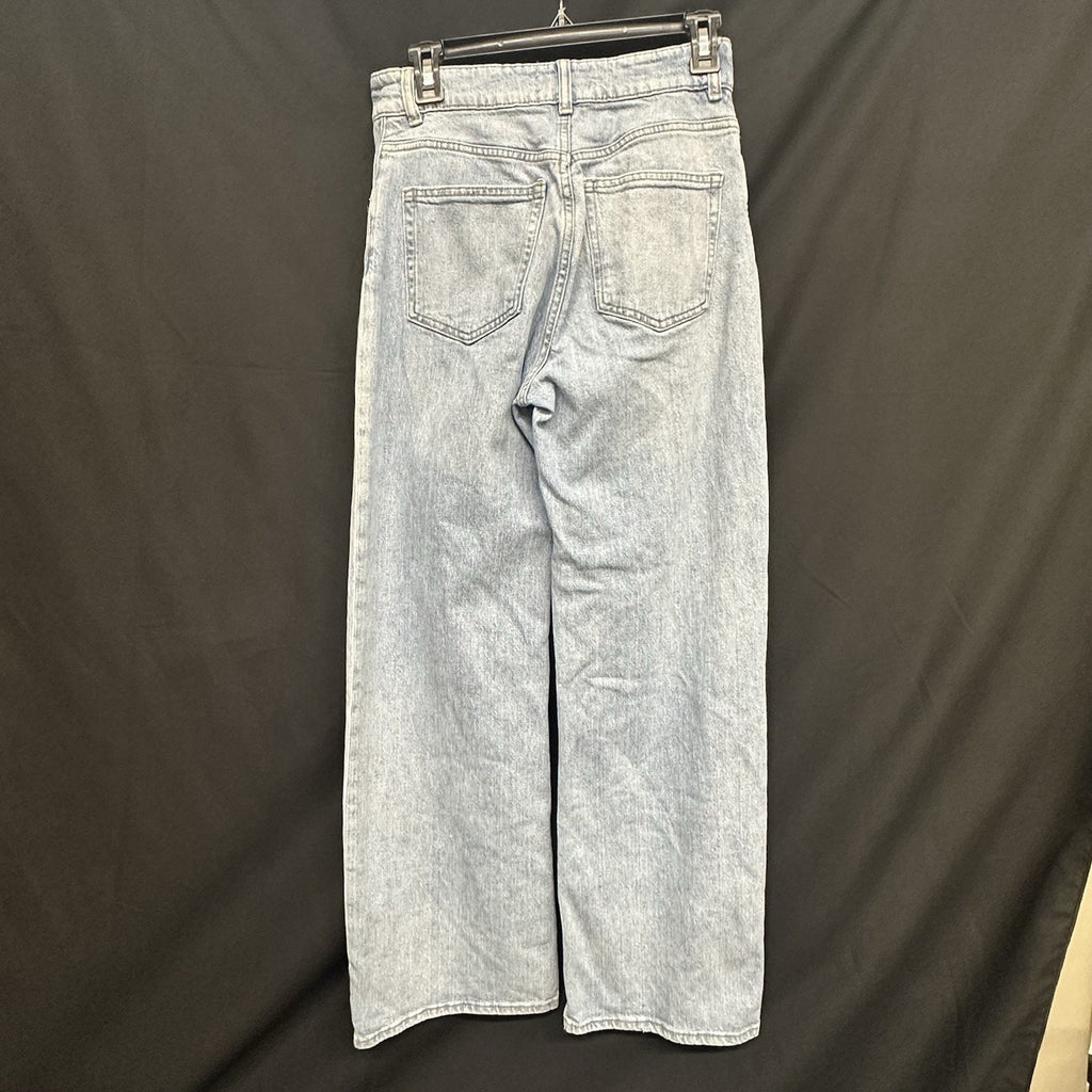 The product is a pair of Women's H&M high rise wide leg jeans in size 2. These jeans feature a regular fit with a high rise waist and a wide leg style. The jeans are in a classic blue color with a zip and button closure, making them a versatile and stylish option for any woman's wardrobe. The 28.5 inch inseam ensures a comfortable and flattering fit for the wearer.