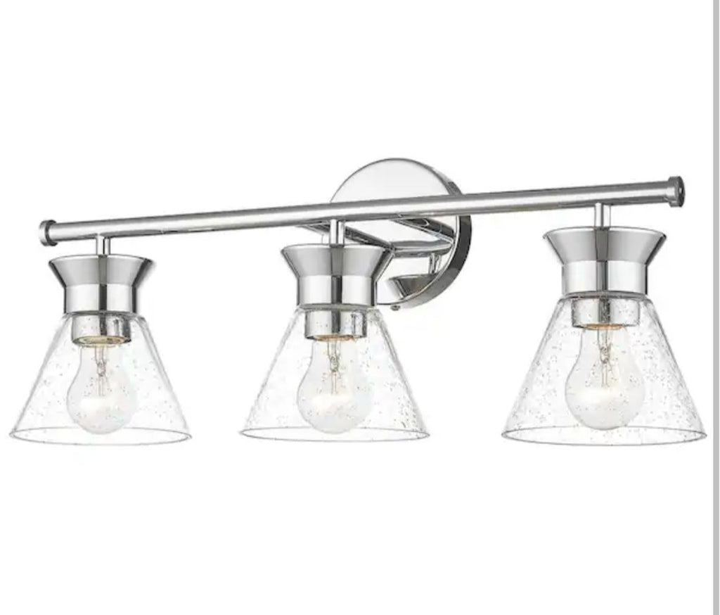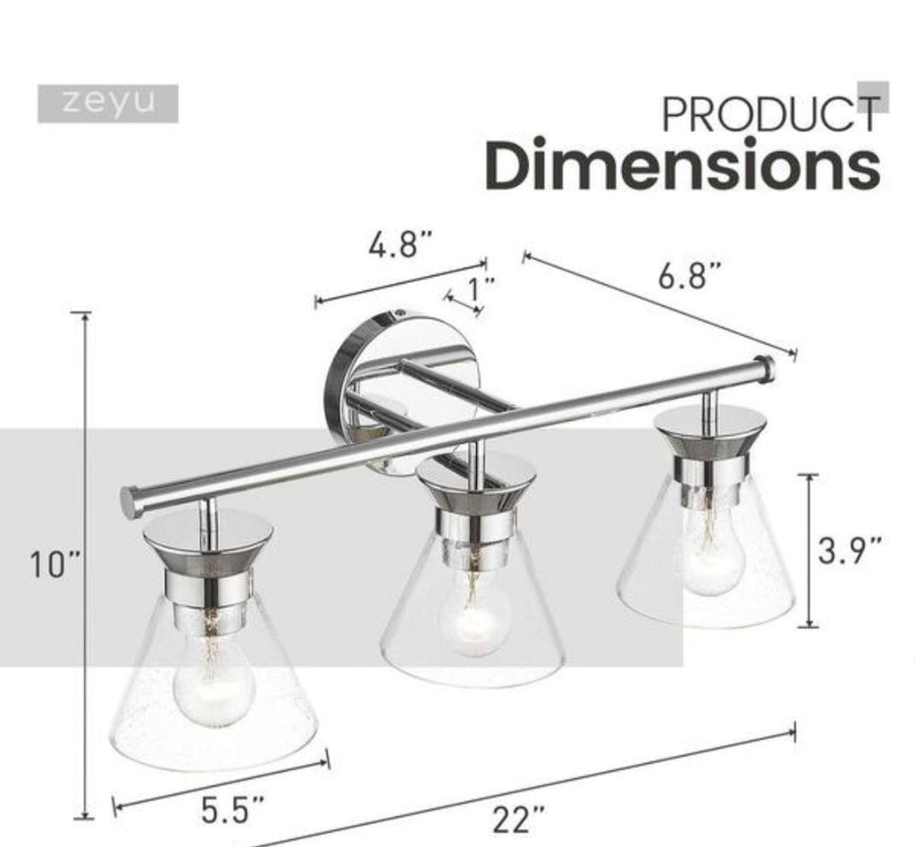The Zeyu 22 in. 3 Light Chrome Vanity Light with Seeded Glass Shade is a modern and stylish addition to any bathroom. This vanity lighting fixture features warm white LED lights that illuminate both downwards and upwards, creating a soft and inviting ambiance. With a sleek chrome finish and energy-efficient design, this light is not only practical but also aesthetically pleasing. Easy to install and with a lifespan of 21st century, this vanity light is sure to enhance the look of your bathroom space.
